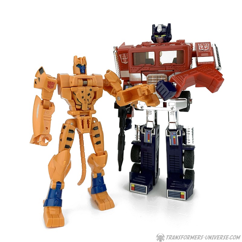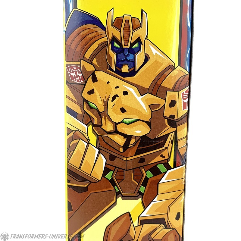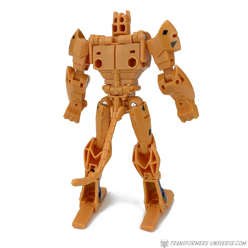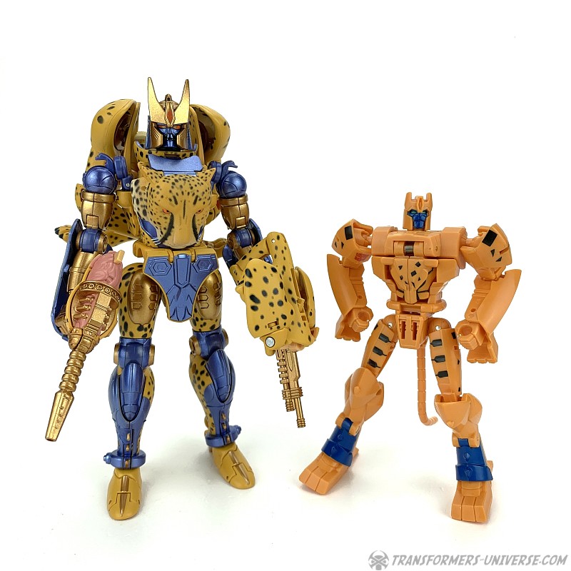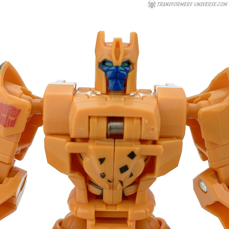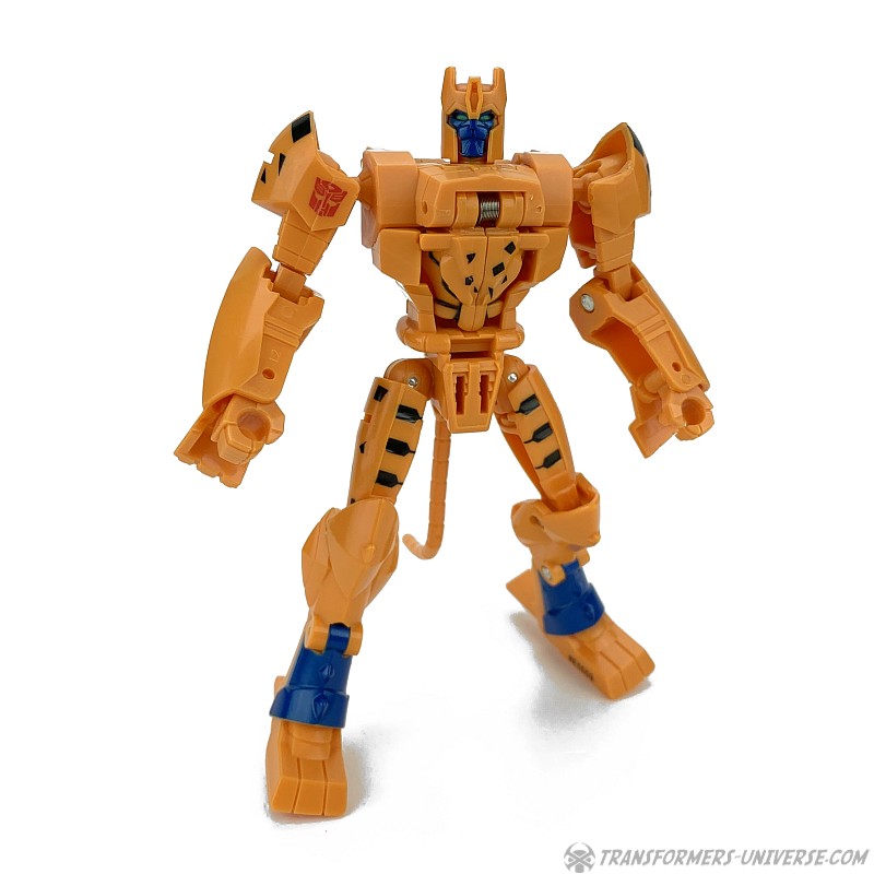 Alternativmodus: Cheetor verwandelt sich natürlich wieder in einen Geparden (engl. cheetah). Ein voll robotisch aussehender Gepard, dessen Hinterbeine etwas zu groß geraten sind im Vergleich zum Rest, aber es funktioniert trotzdem überraschend gut. Speziell wenn man mit einem Roboter ohne jede Anhängsel startet. Klar, so ganz kann die Figur nicht verhehlen, dass es ein Roboter auf allen Vieren ist, aber trotzdem: ziemlich gut für eine Gimmick-beladene Cyberverse Figur. Nur nicht so genau auf den Bauch des Geparden gucken, der ist hohl und man sieht den Hinterkopf des Robotermodus. In Summe also: ein netter Geparden-Modus. Nicht der Beste aller Zeiten, aber gut. Somit Daumen hoch.
