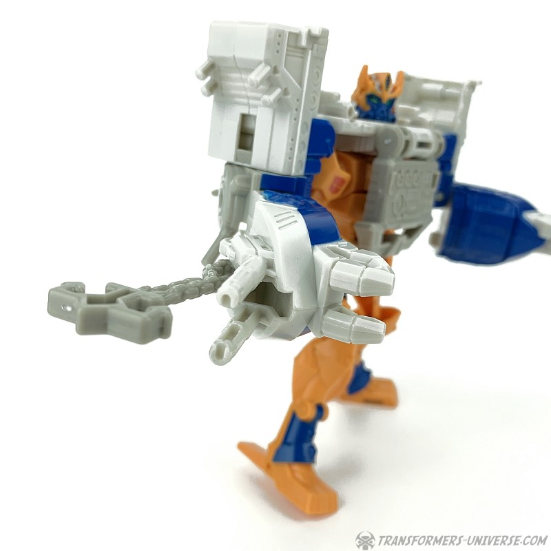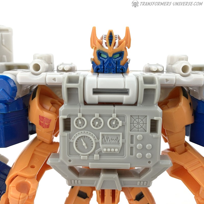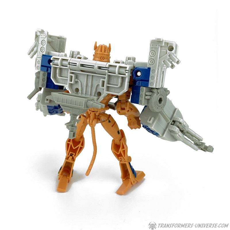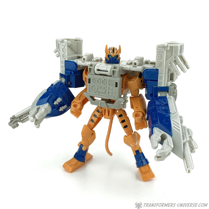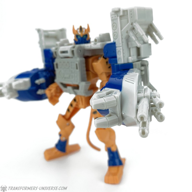Das Schiff wird zu einer Art Rüstung für Cheetor. Die Platten in der Mitte falten herunter als Brustharnisch und ein neuer Kopf kommt zum Vorschein. Bug und Heck des Schiffes werden zu den Armen. Cheetor behält seine normalen Roboterarme, also hat man entweder einen vierarmigen Roboter oder kann versuchen, die kleineren Arme irgendwie weg zu falten. Ganz wie ihr wollt. Die Arme sind an den Ellbogen beweglich und haben einen drehbaren Bizeps. Theoretisch sind auch die Schultern beweglich, aber sie zu bewegen aktiviert die Auto-Transformation und die Brustplatte klappt hoch.