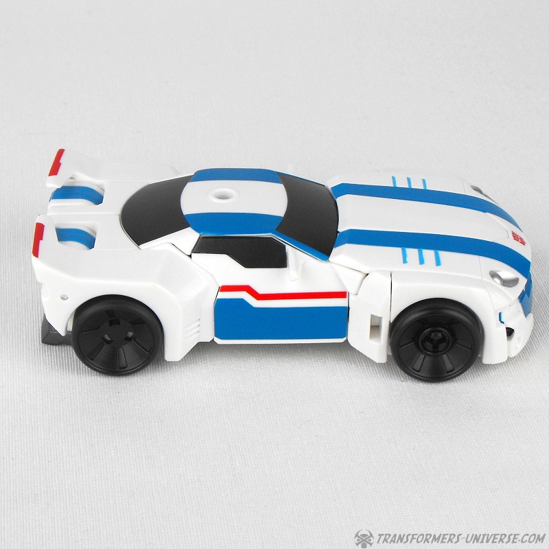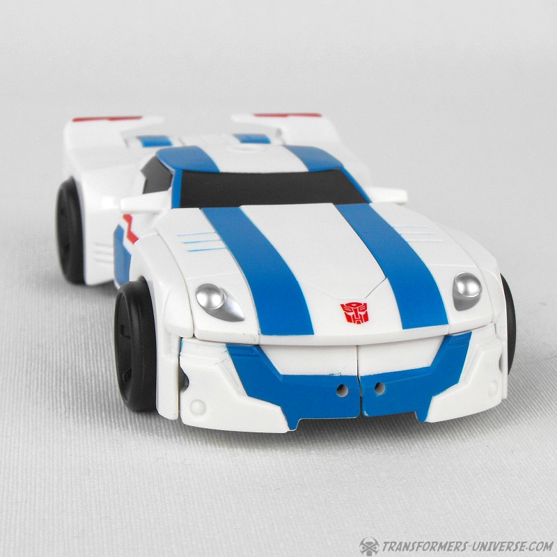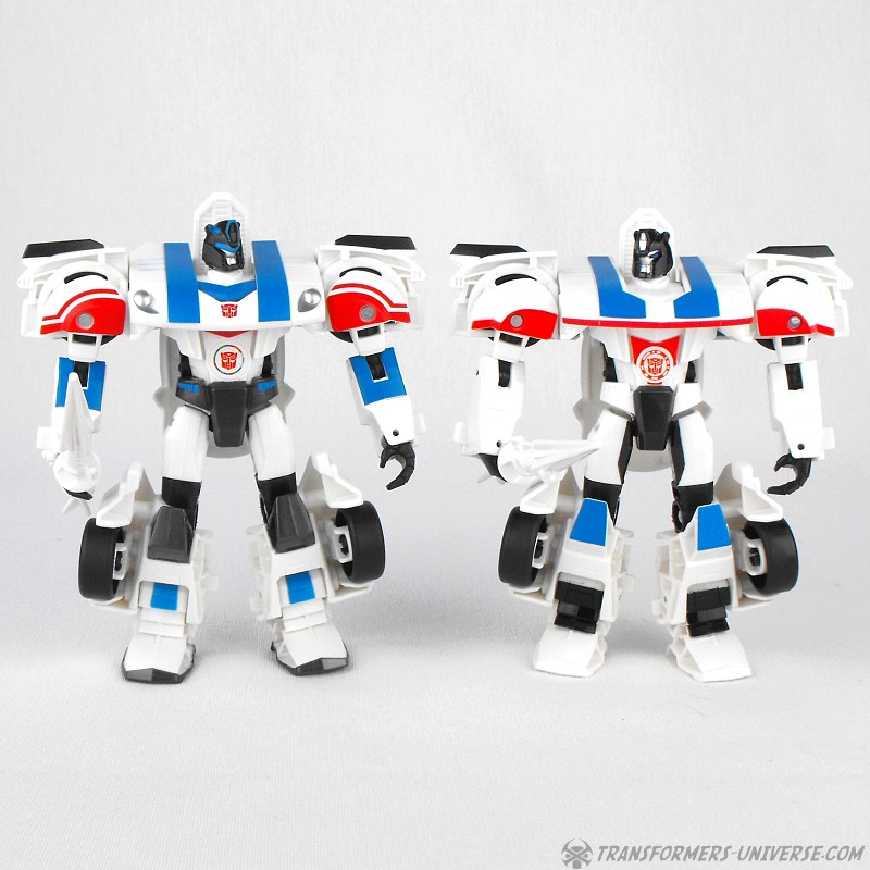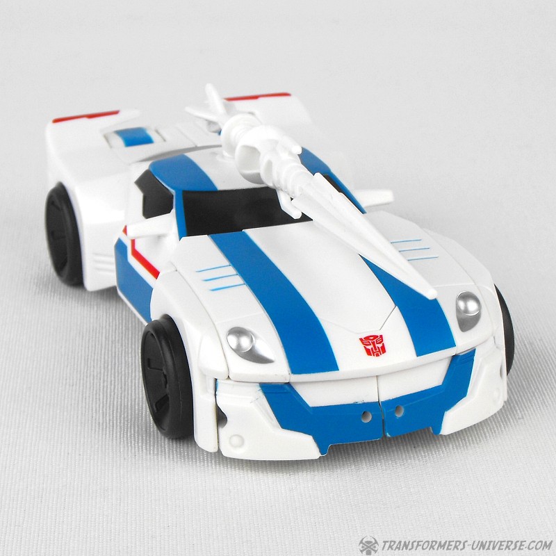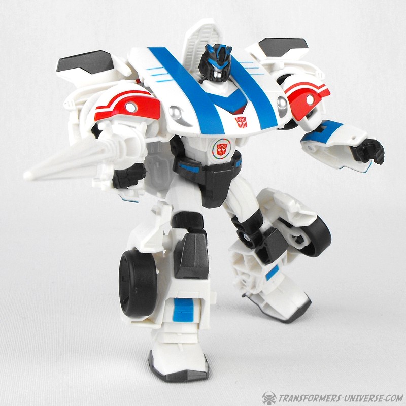 Bemerkungen: Battle Mode Jazz ist ein Repaint mit leicht modifiziertem Kopf von Robots in Disguise Jazz, den ich vor nicht allzu langer Zeit schon rezensiert habe. Deshalb nur ein paar Worte zu den Unterschieden. Bei Sichtung meiner Rezension von RID Jazz hatte ich damals nur zwei Punkte an dieser ansonsten tollen Figur bemängelt, nämlich den Mangel an Farbe und die blöde Waffe. Battle Mode Jazz behebt zumindest eine dieser Schwächen, die Figur hat deutlich mehr farbliche Highlights, vor allem im Automodus, aber auch als Roboter. Außerdem wurde der Kopf leicht verändert, denn Jazz trägt nun einen blauen Visor über den Augen (der einzige Unterschied zum normalen Takara Adventure Jazz) für das Extra-Quentchen G1-Nostalgie. Leider trägt er immer noch diese blöde schneeweise Lanze als Waffe, aber ansonsten: eine Verbesserung gegenüber der Hasbro Version.