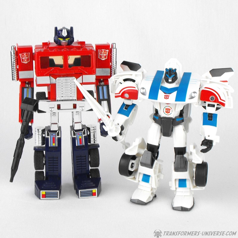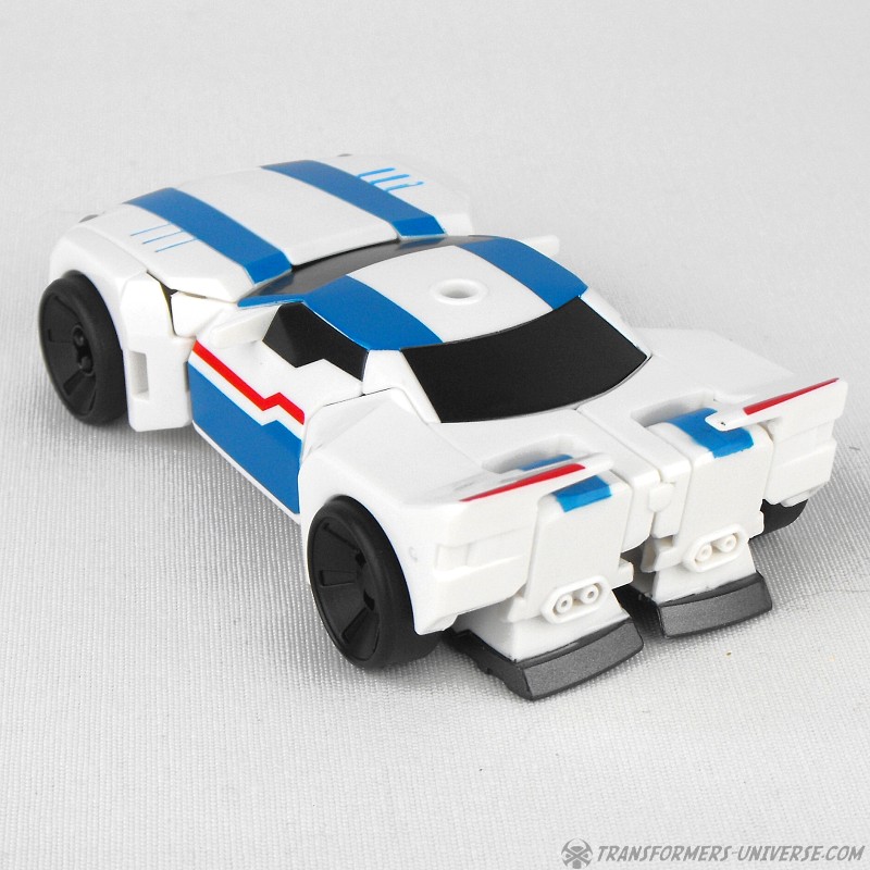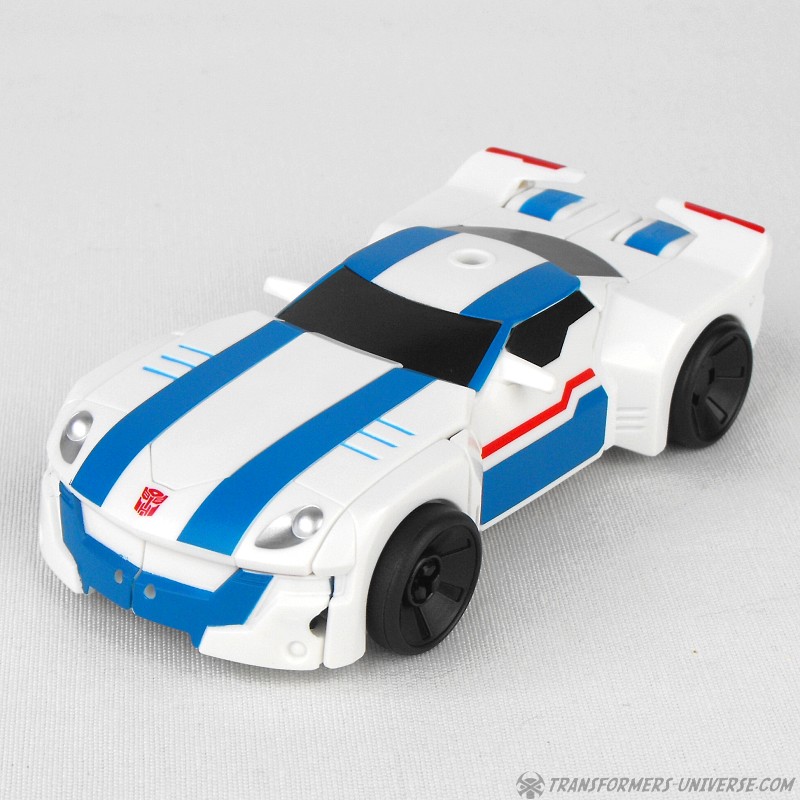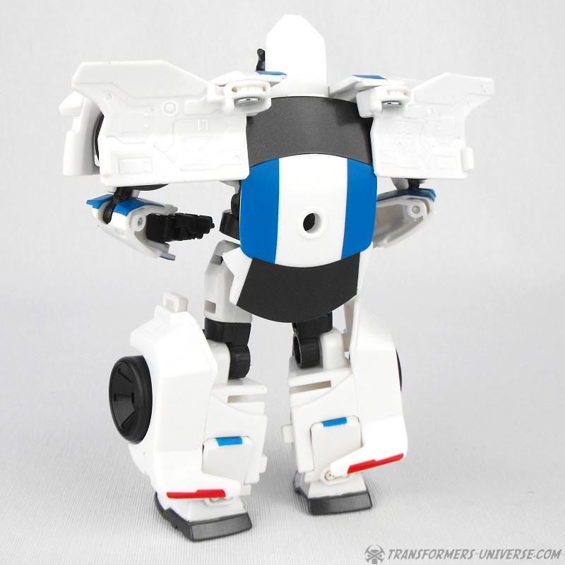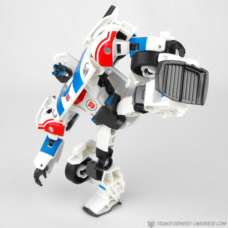 Bemerkungen: Battle Mode Jazz ist ein Repaint mit leicht modifiziertem Kopf von Robots in Disguise Jazz, den ich vor nicht allzu langer Zeit schon rezensiert habe. Deshalb nur ein paar Worte zu den Unterschieden. Bei Sichtung meiner Rezension von RID Jazz hatte ich damals nur zwei Punkte an dieser ansonsten tollen Figur bemängelt, nämlich den Mangel an Farbe und die blöde Waffe. Battle Mode Jazz behebt zumindest eine dieser Schwächen, die Figur hat deutlich mehr farbliche Highlights, vor allem im Automodus, aber auch als Roboter. Außerdem wurde der Kopf leicht verändert, denn Jazz trägt nun einen blauen Visor über den Augen (der einzige Unterschied zum normalen Takara Adventure Jazz) für das Extra-Quentchen G1-Nostalgie. Leider trägt er immer noch diese blöde schneeweise Lanze als Waffe, aber ansonsten: eine Verbesserung gegenüber der Hasbro Version.