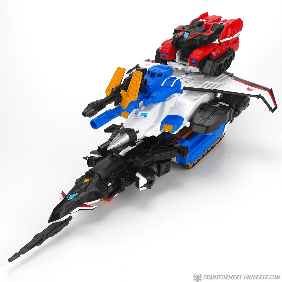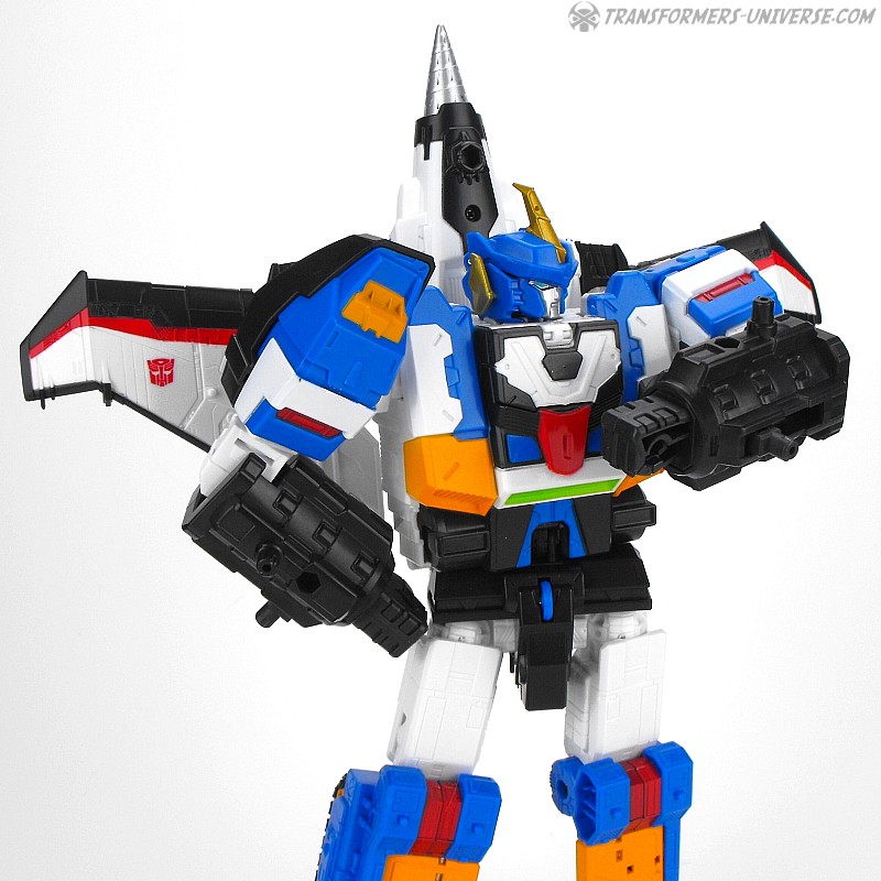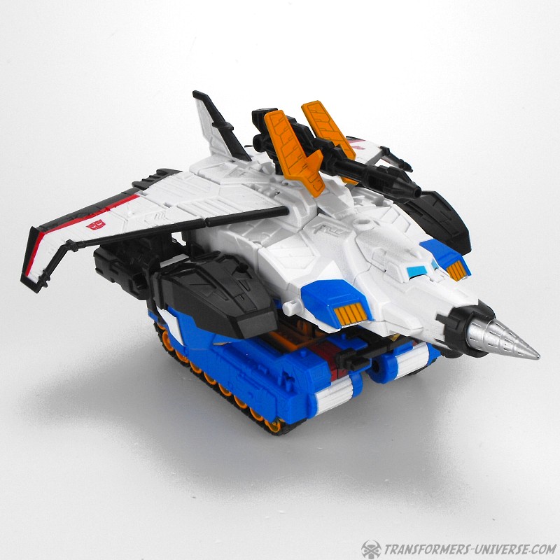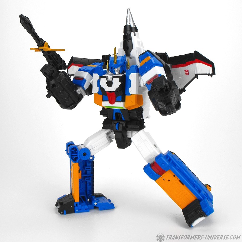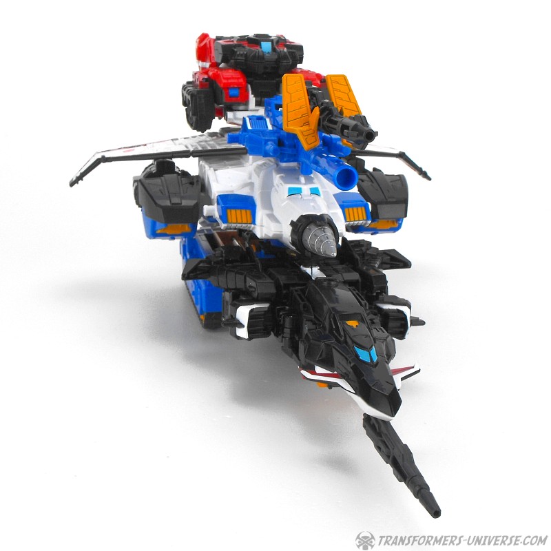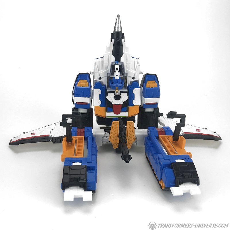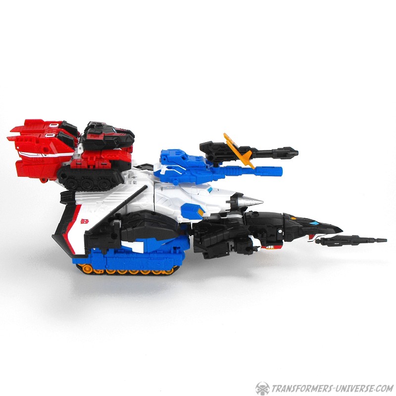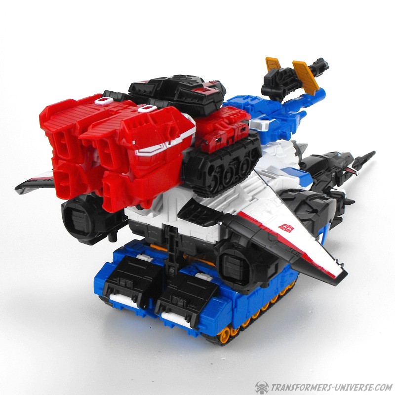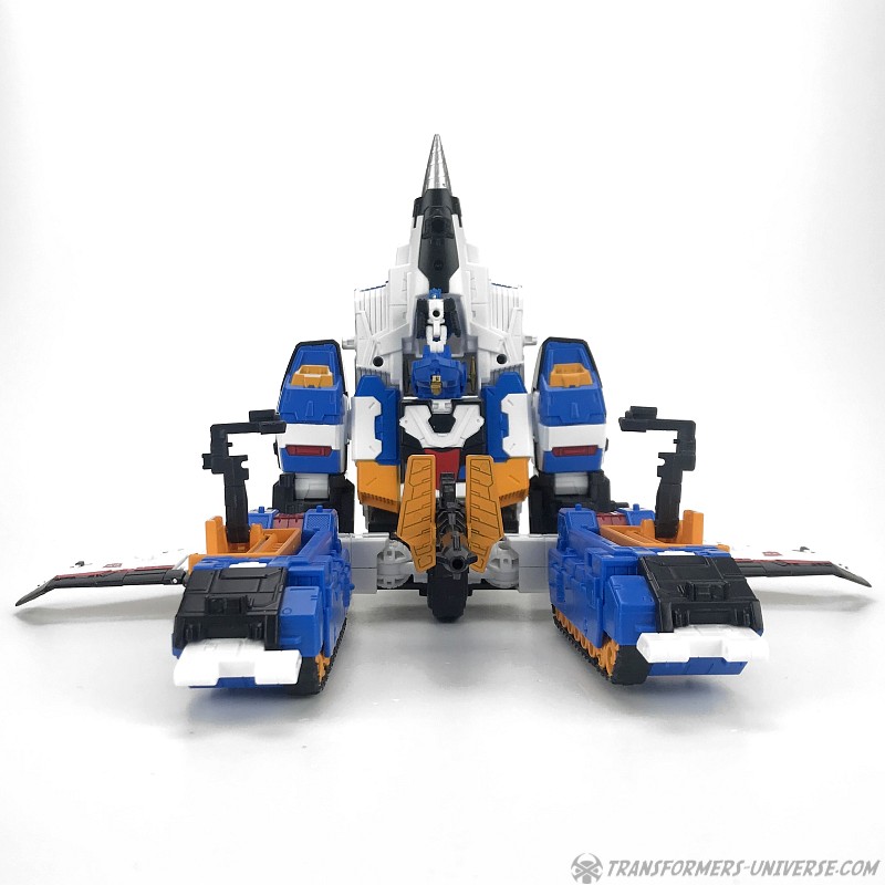 Alternativmodus: Offiziell ist Dai Atlas ein Quad-Changer, also ein Roboter mit drei Alternativmodi. Realistisch gesehen sind aber zwei der beiden Modi praktisch das gleiche Fahrzeug mit nur minimalen Modifikationen. Dai Atlas verwandelt sich in etwas, das man am ehesten noch als fliegenden Bohrpanzer bezeichnen kann. Nominal ist er ein Jet und ein Bohrpanzer, aber letzterer ist einfach nur der Jet mit runtergeklappten Flügeln und nach vorne gedrehten Roboterarmen. Somit, ja, einfach ein fliegender Bohrpanzer.