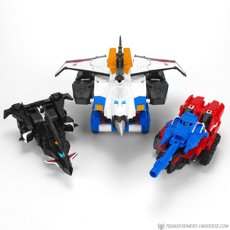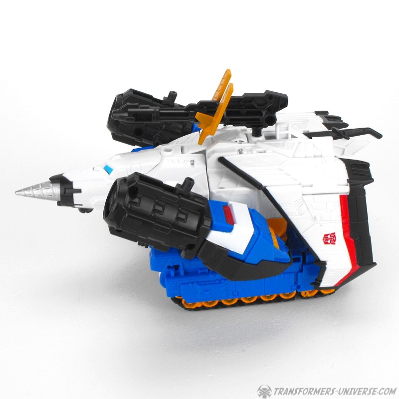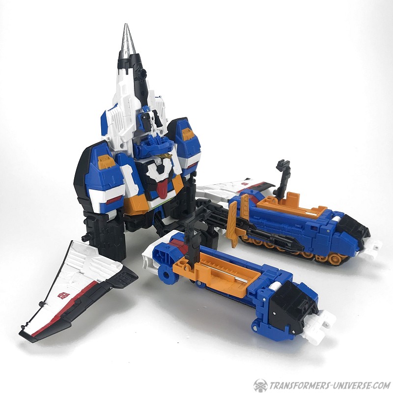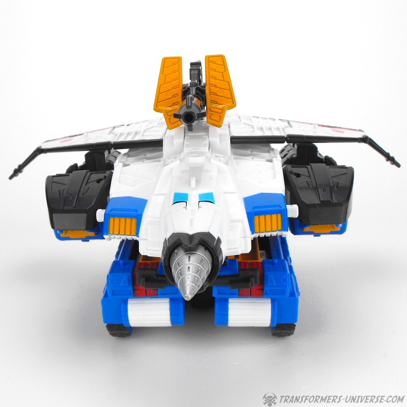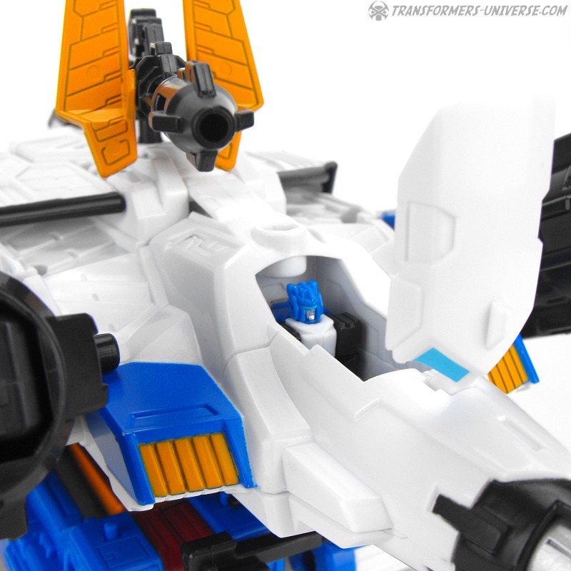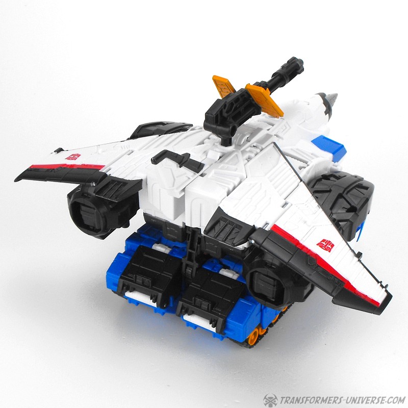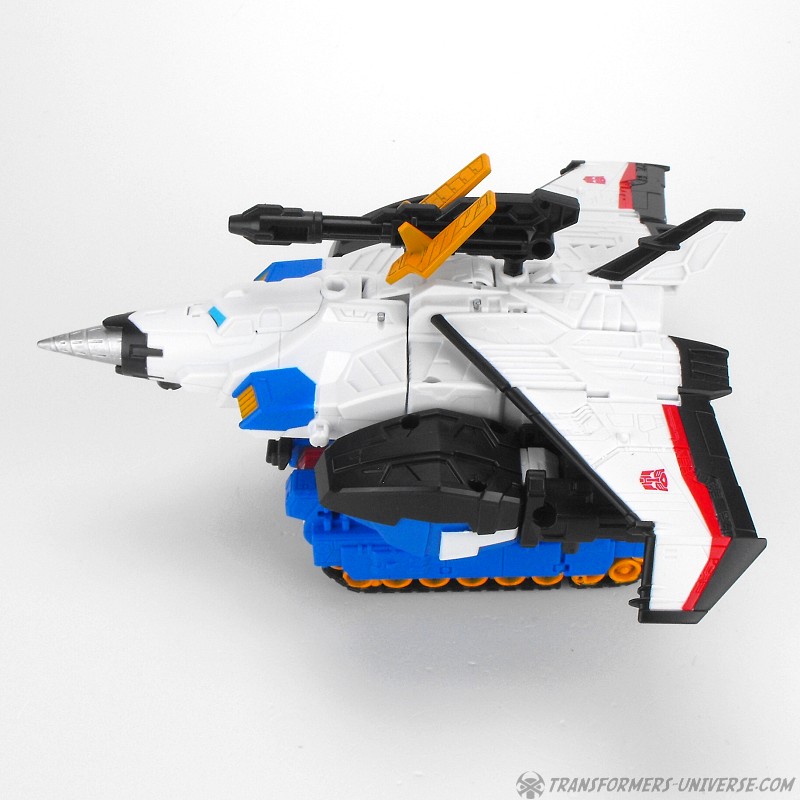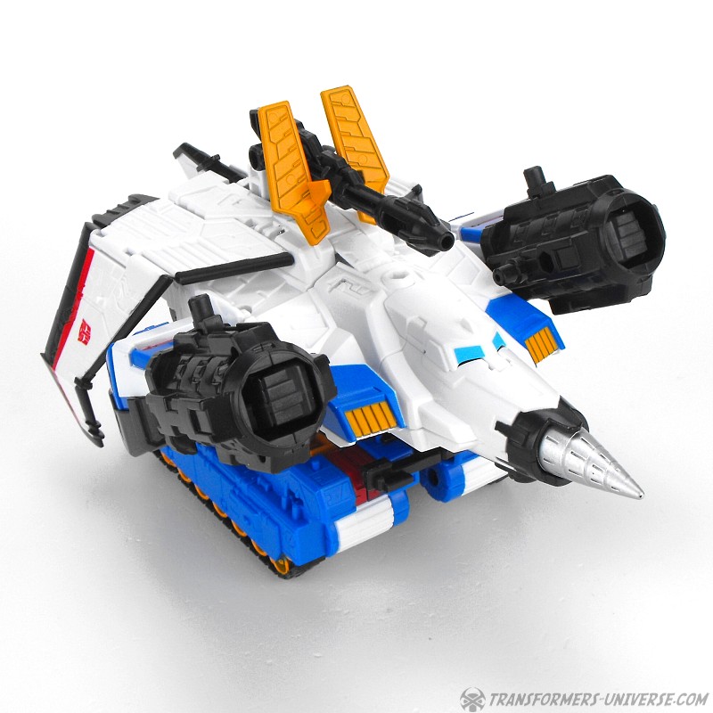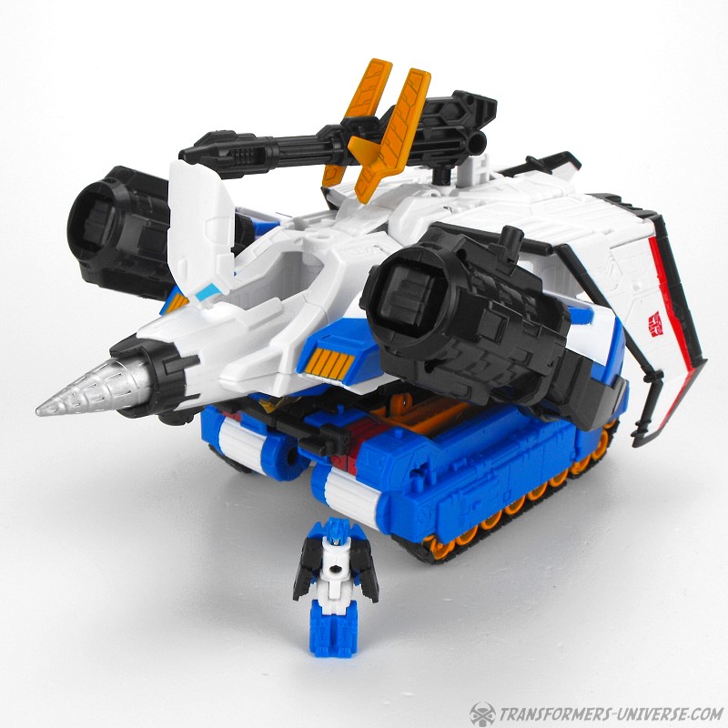 Alternativmodus: Offiziell ist Dai Atlas ein Quad-Changer, also ein Roboter mit drei Alternativmodi. Realistisch gesehen sind aber zwei der beiden Modi praktisch das gleiche Fahrzeug mit nur minimalen Modifikationen. Dai Atlas verwandelt sich in etwas, das man am ehesten noch als fliegenden Bohrpanzer bezeichnen kann. Nominal ist er ein Jet und ein Bohrpanzer, aber letzterer ist einfach nur der Jet mit runtergeklappten Flügeln und nach vorne gedrehten Roboterarmen. Somit, ja, einfach ein fliegender Bohrpanzer.