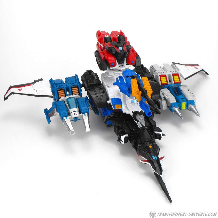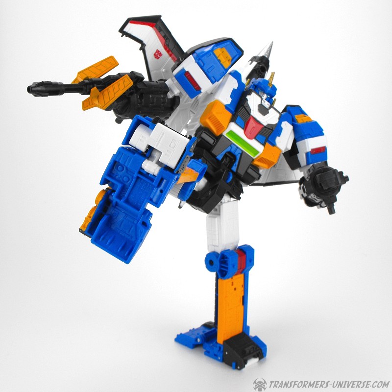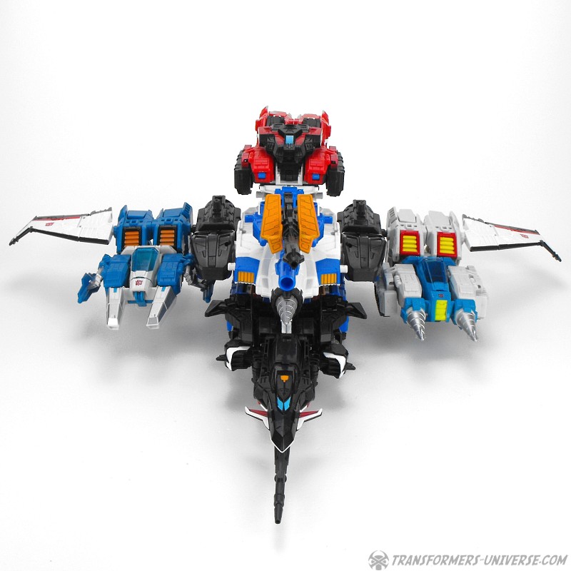 Big Powered kann noch zusätzlich verbessert werden, wenn man Topspin und Twin Twist dazu nimmt. Damit das funktioniert werden Dai Atlas‘ Flügel abmontiert, die beiden Fahrzeuge seitlich angebracht, und die Flügel dann an diesen außen wieder angesteckt. Das Resultat sieht super aus, ein gigantisches Anime Raumschiff. Leider ist es nicht ganz so stabil wie der „normale“ Big Powered, da die Zapfen, an denen Topspin und Twin Twist angebracht werden, eigentlich die sind, die Dai Atlas‘ Arme am Rumpf fixieren. Man muss die Arme um 180 Grad drehen, damit die Zapfen außen sind, was dann dafür sorgt dass das gesamte Gewicht der Flügel und Zusatzbots auf Dai Atlas‘ Schultergelenken lastet. Es hält zwar, aber nur gerade so. Hier also keine waghalsigen Flugmanöver bitte.