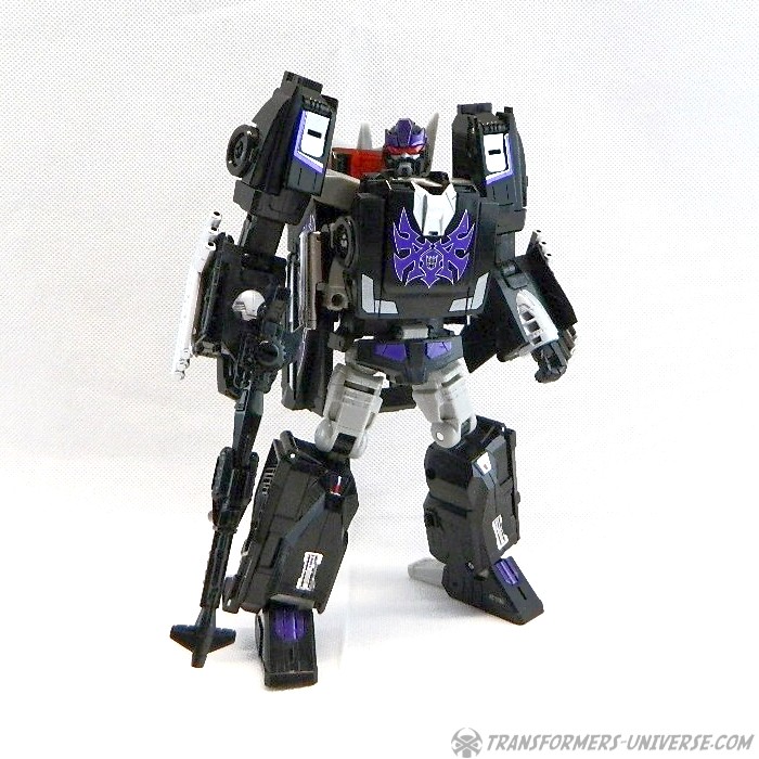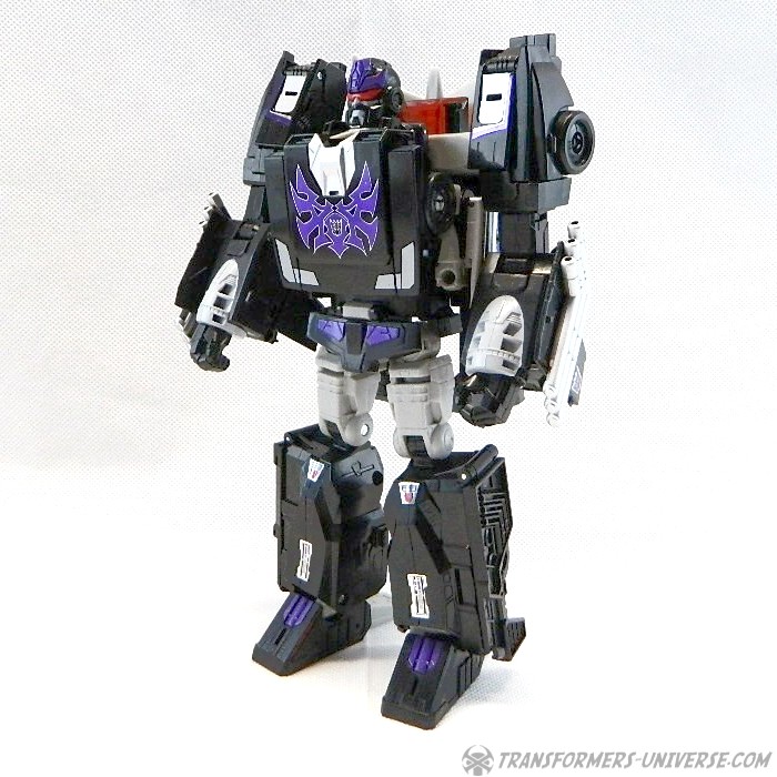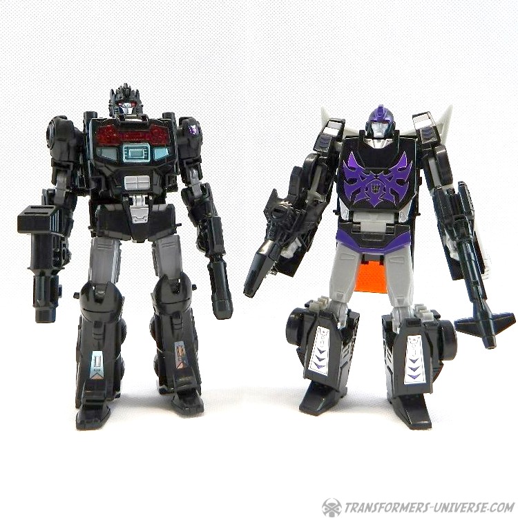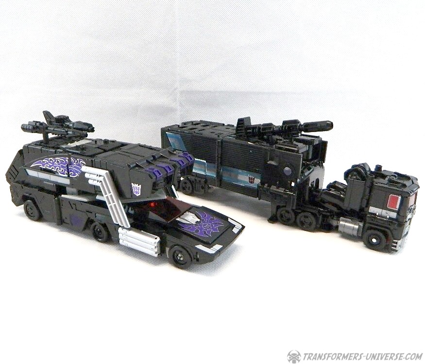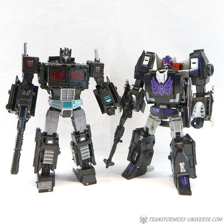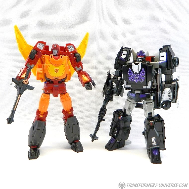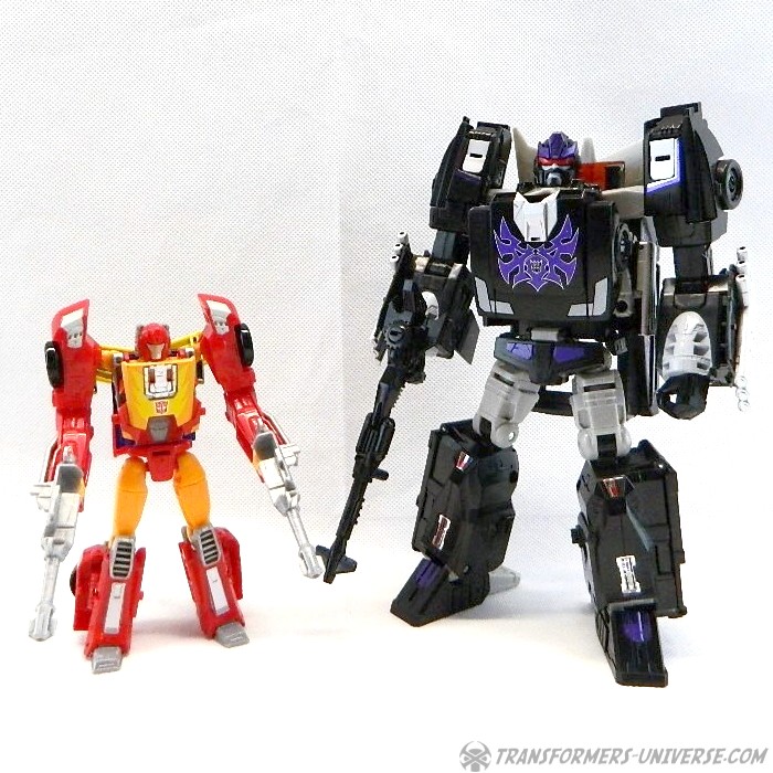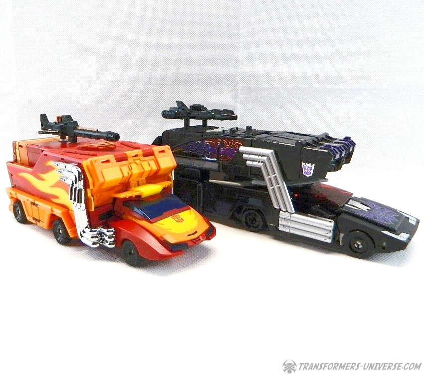 Bemerkungen: Rodimus Unicronus ist ein Repaint (mit neuem Kopf) von Power of the Primes Rodimus Prime, den ich bereits rezensiert habe. Die neuen Farben der Figur sind an Shattered Glass Rodimus angelehnt, aber in diesem Fall stammt der Charakter nicht aus einem anderen Universum, sondern stellt eine Version von Rodimus Prime dar, die von Unicron korrumpiert wurde. Der neue Kopf (im Supermodus) hat einen Bart und eine Sonnenbrille, was von vielen als Hommage an Motörhead Sänger Ian "Lemmy" Kilmister gedeutet wird, der wenige Jahre vor Erscheinen dieser Figur verstarb. Rodimus Unicronus hat eine Matrix des Chaos dabei, anstatt der Matrix der Führerschaft der Originalfigur, ist ansonsten aber vom Zubehör her identisch. Der kleinere Roboter wurde als "Nemesis Hot Rod" bezeichnet.