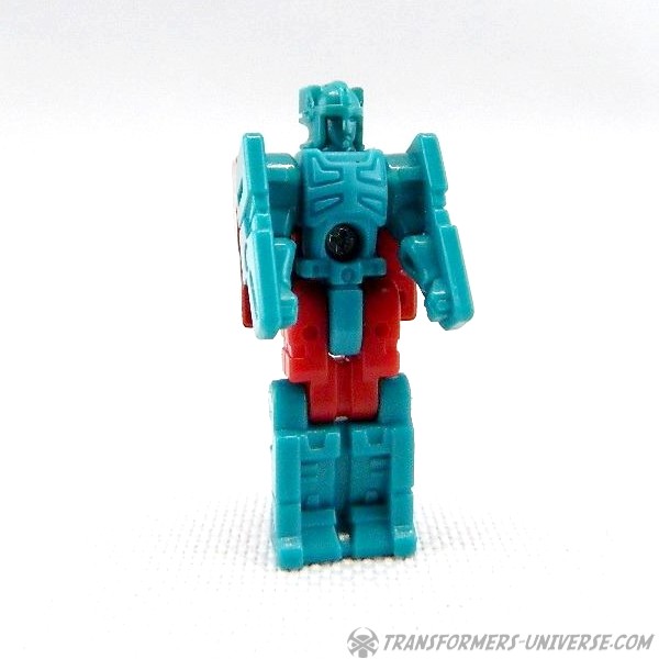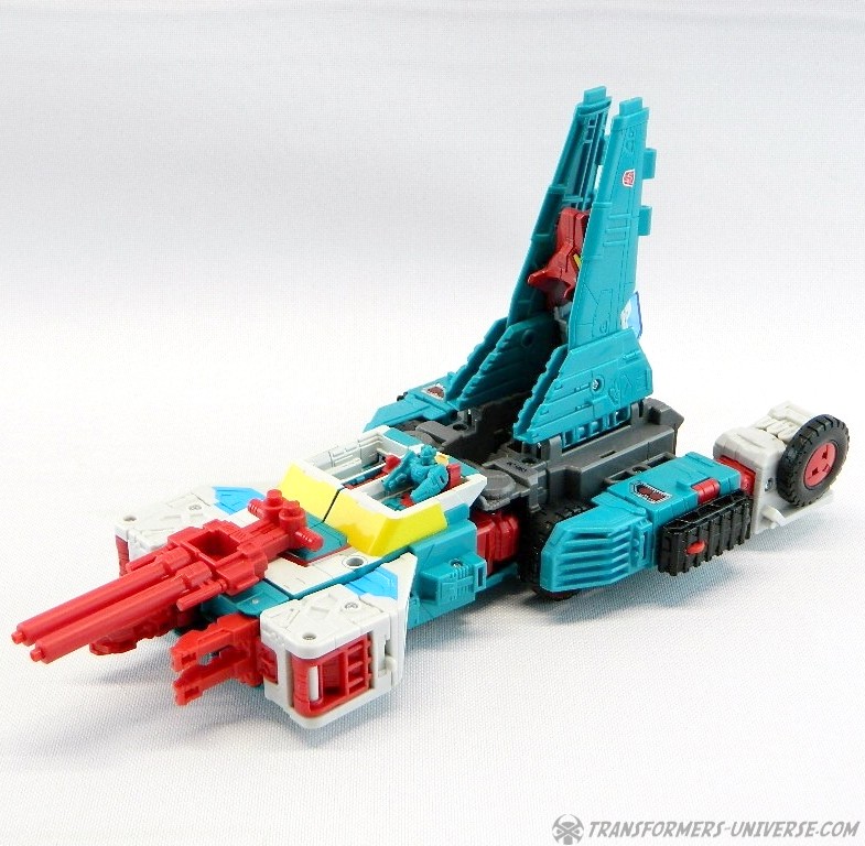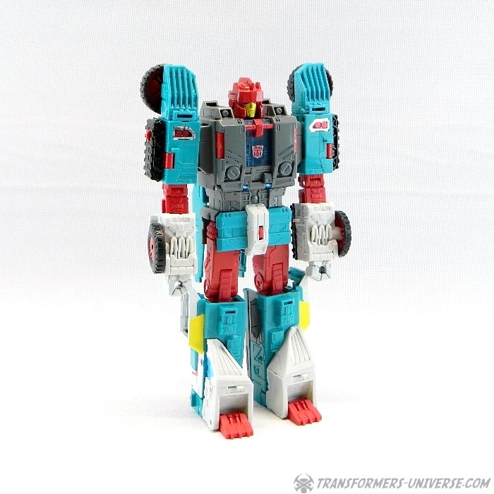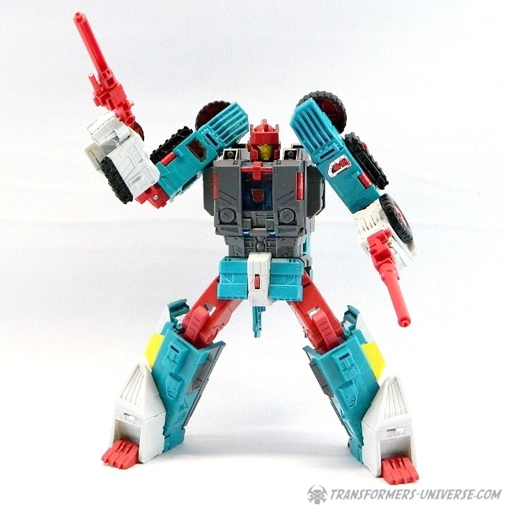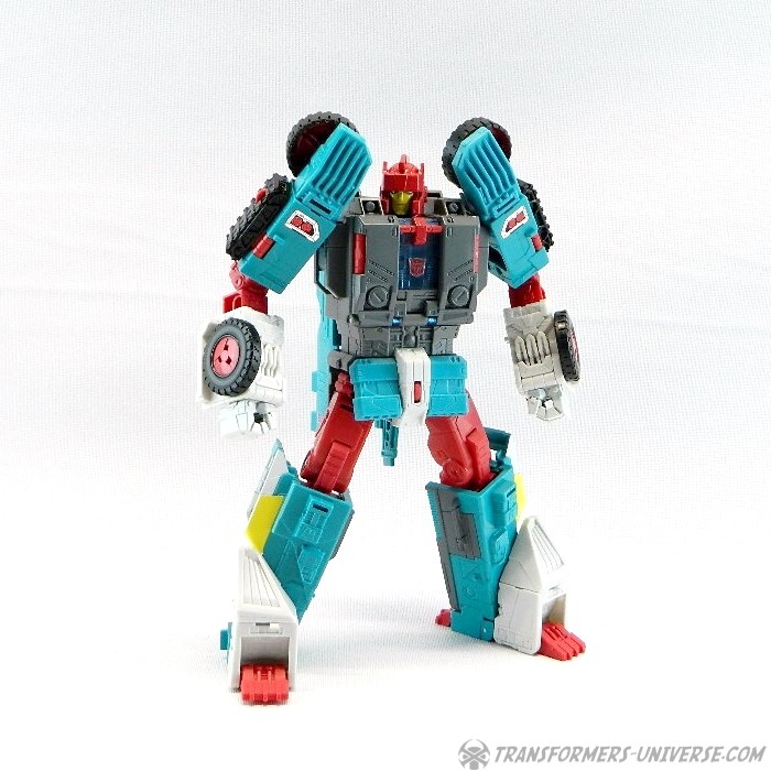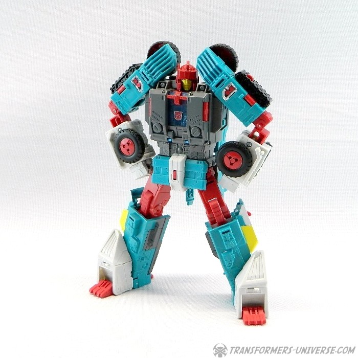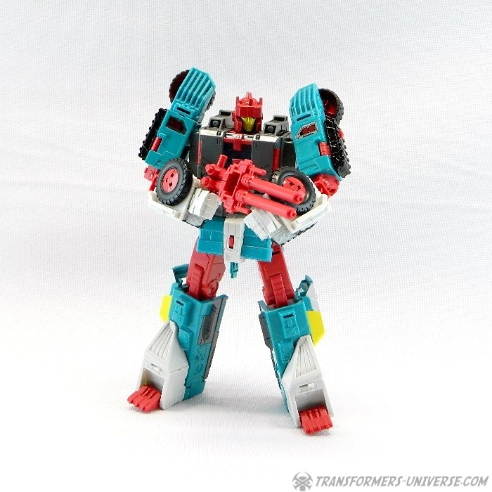 Bemerkungen: Quickswitch ist ein Repaint mit minimalem Retooling von Titans Return Sixshot, den ich bereits rezensiert habe. Quickswitch bekam einen neuen Anstrich und ein neues Gesicht (also einen neuen Titan Master), um dem originalen G1 Autobot Sixchanger Quickswitch zu ähneln, auch wenn der damals kein Repaint von Sixshot war. Natürlich hat Titans Return Quickswitch die gleichen Alternativmodi wie Sixshot, also einen Jet, ein Artilleriefahrzeug, einen Jeep, einen geflügelten Wolf und ein U-Boot, das eigentlich eine rumgedrehte Wumme ist. Sein neuer Titan Master Dynamus hat nicht mal einen bekannten Transformers Namen bekommen. Quickswitch war Teil des "Chaos on Velocitron" Sets, welches exklusiv bei Toys R'Us und Amazon erhältlich war.
