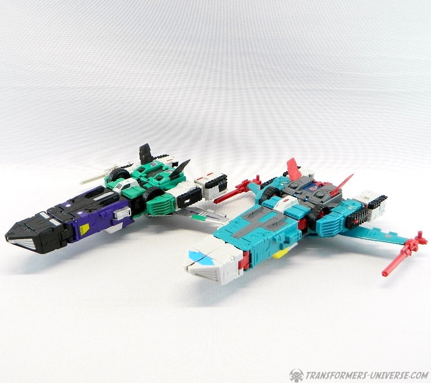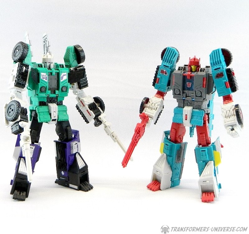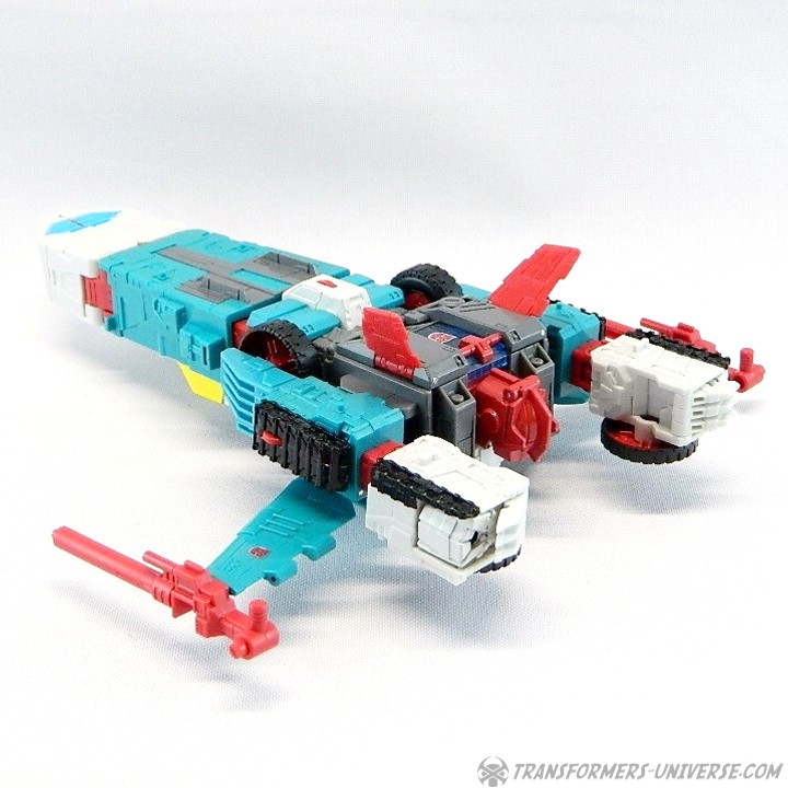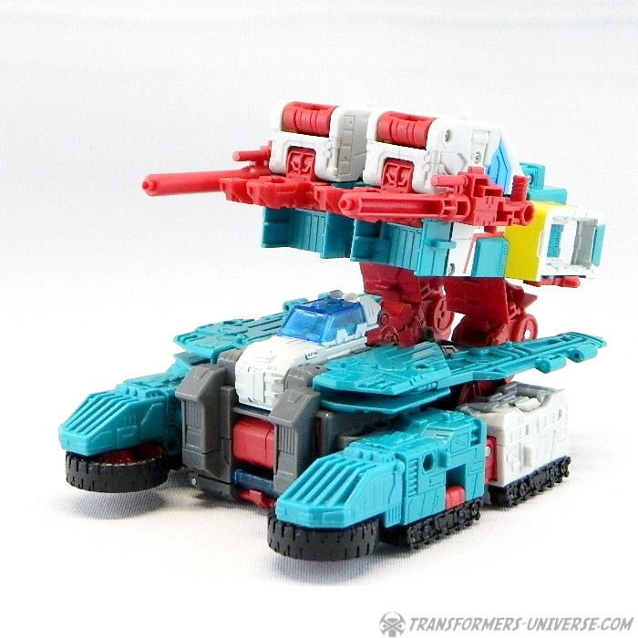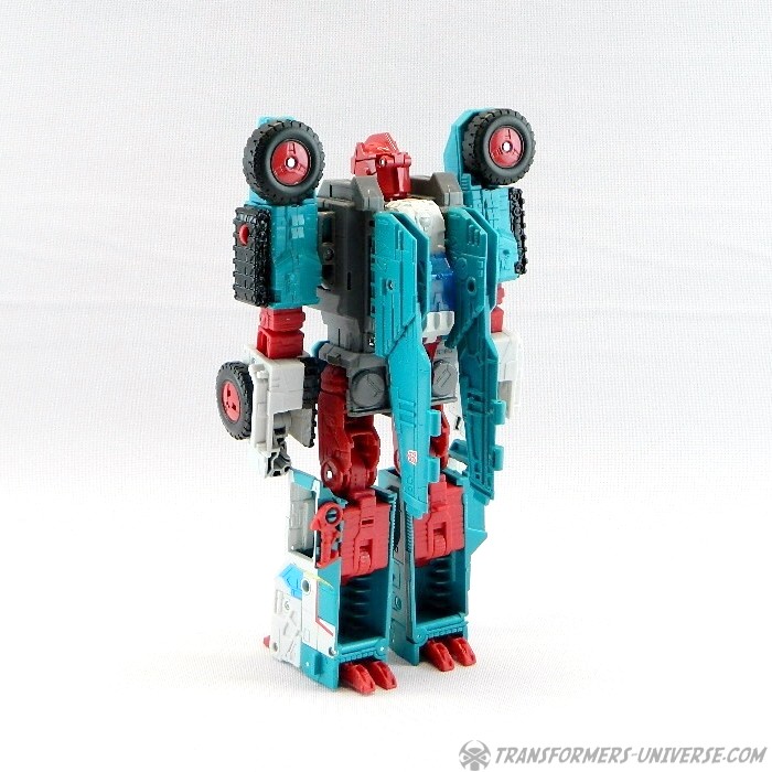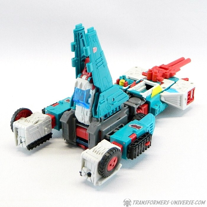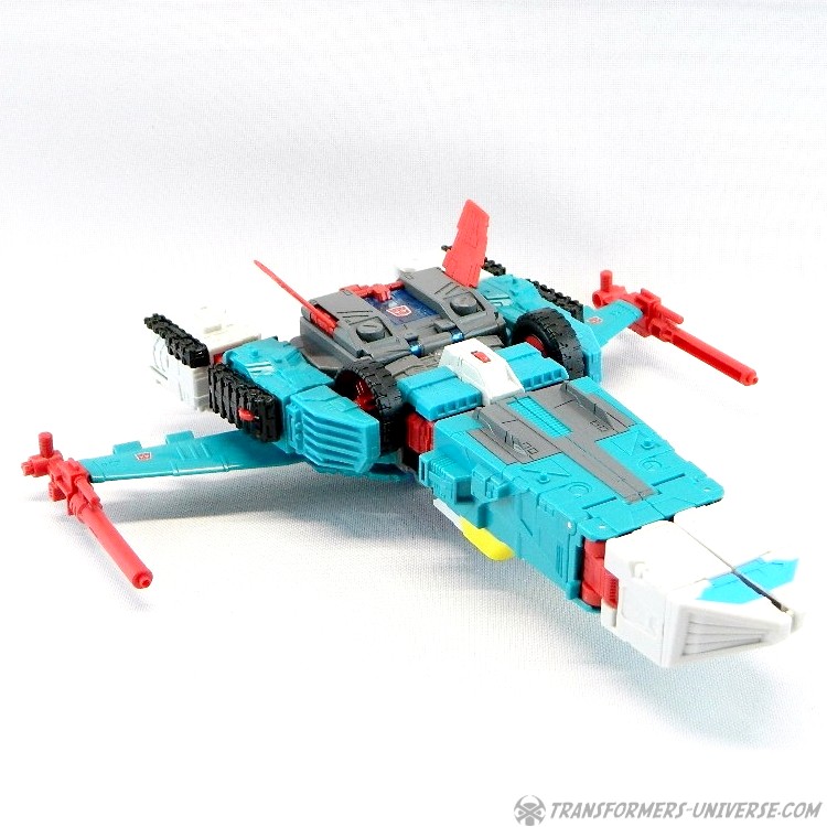 Bemerkungen: Quickswitch ist ein Repaint mit minimalem Retooling von Titans Return Sixshot, den ich bereits rezensiert habe. Quickswitch bekam einen neuen Anstrich und ein neues Gesicht (also einen neuen Titan Master), um dem originalen G1 Autobot Sixchanger Quickswitch zu ähneln, auch wenn der damals kein Repaint von Sixshot war. Natürlich hat Titans Return Quickswitch die gleichen Alternativmodi wie Sixshot, also einen Jet, ein Artilleriefahrzeug, einen Jeep, einen geflügelten Wolf und ein U-Boot, das eigentlich eine rumgedrehte Wumme ist. Sein neuer Titan Master Dynamus hat nicht mal einen bekannten Transformers Namen bekommen. Quickswitch war Teil des "Chaos on Velocitron" Sets, welches exklusiv bei Toys R'Us und Amazon erhältlich war.