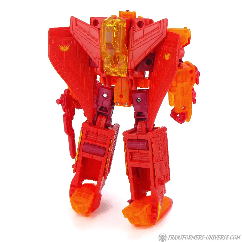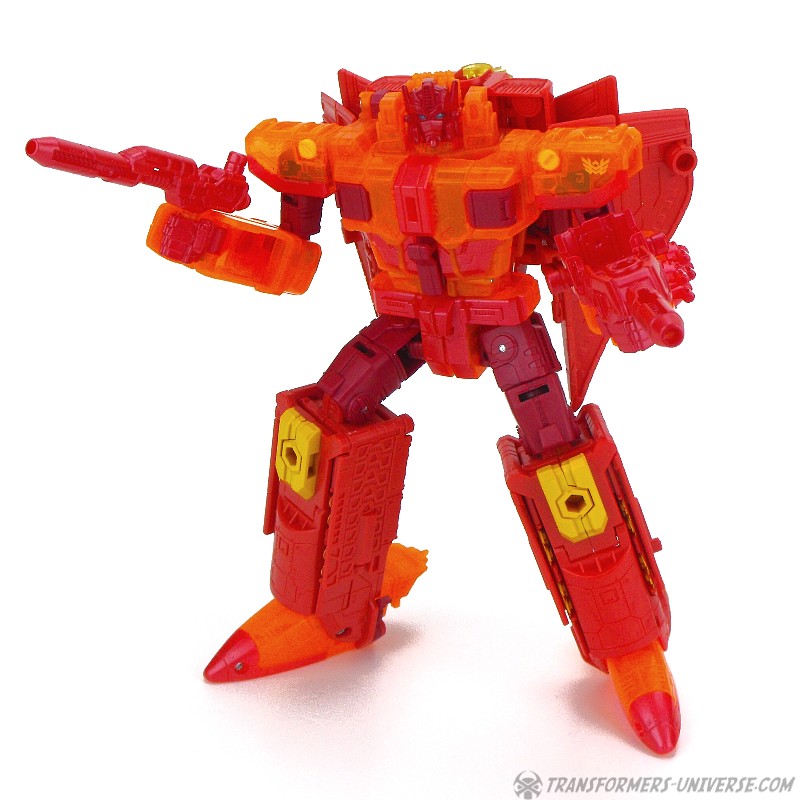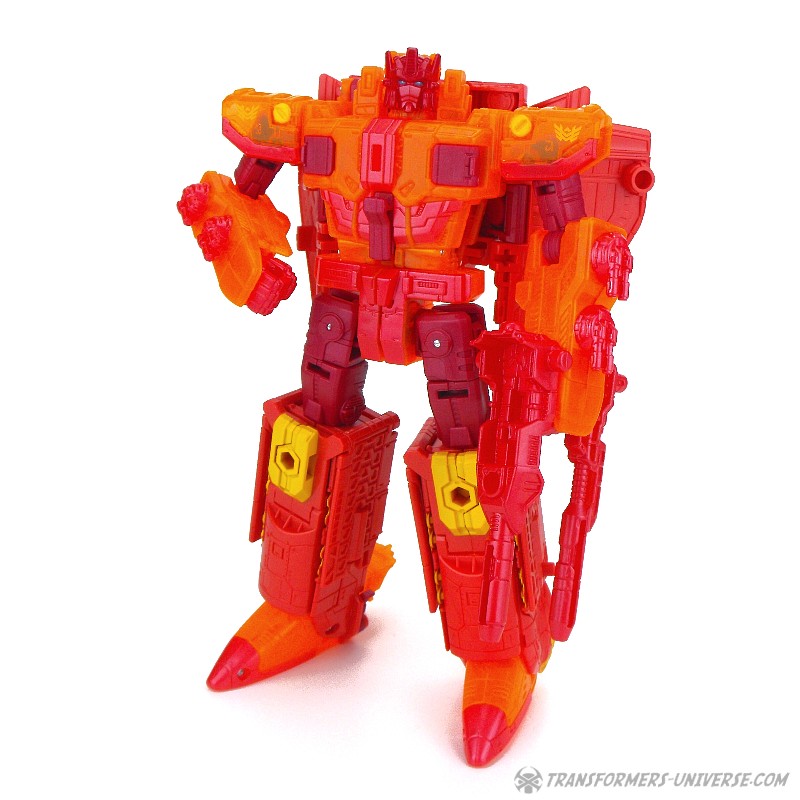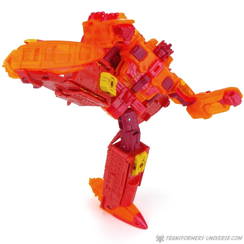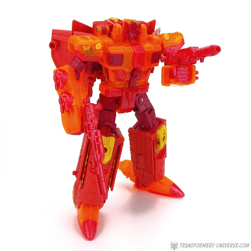 Robotermodus: Diese Version von Sentinel Prime hier war eine Exklusivfigur auf der SDCC 2016 als Teil des „Titan Force“ Dreierpacks. Die Retail Version von Sentinel haben ich ja bereits in 2016 rezensiert (GOTT, WAS IST DER ORANGE!), somit wird sich diese Rezension hier auf die Unterschiede fokussieren. Diese bestehen aus dem umfassenden Einsatz von transparent-orangen Teilen, die vorher nicht-transparent-orange waren (SO! VIEL! ORANGE!), außerdem sind die vormals grauen Teile jetzt rot und… ja, das war’s eigentlich schon. Daraus resultierend ist Titan Force Sentinel Prime sogar noch schwieriger abzulichten, ohne dabei zu einem verschwommenen orangen Blubbs zu werden, als es bei der Retail Version der Fall war.