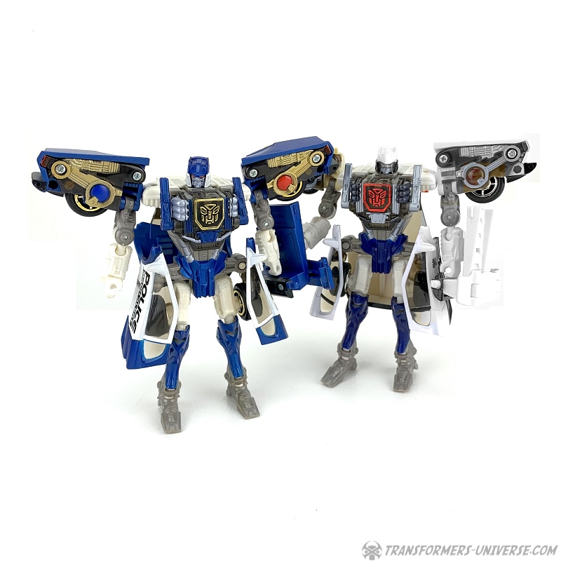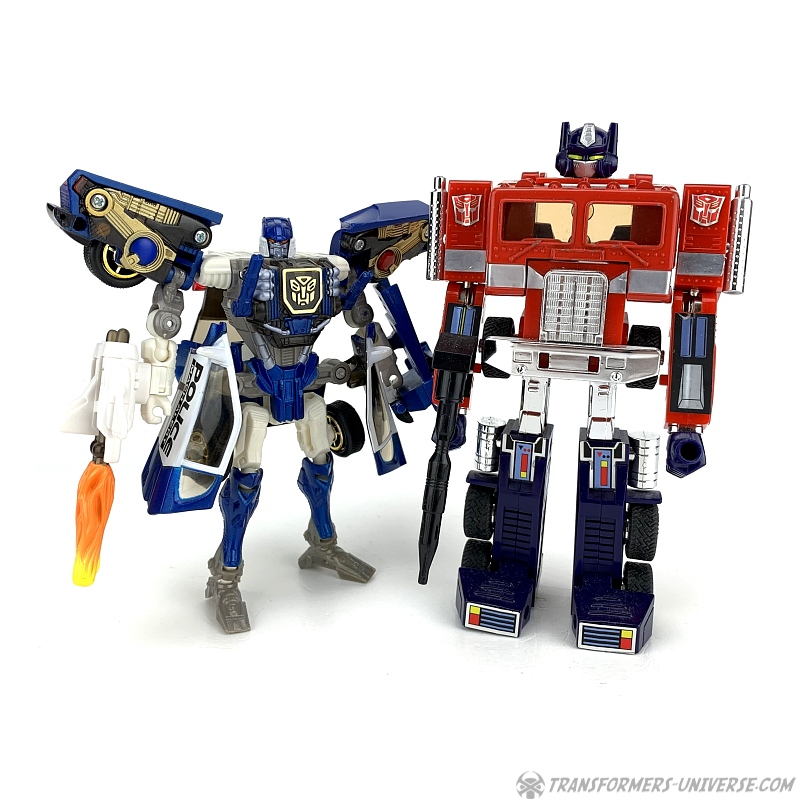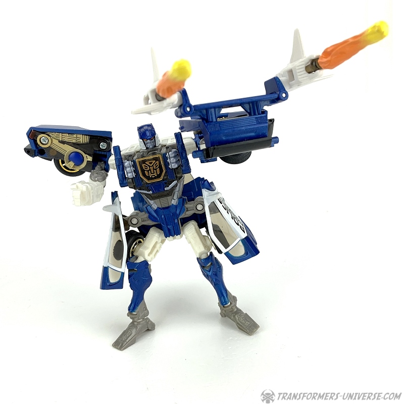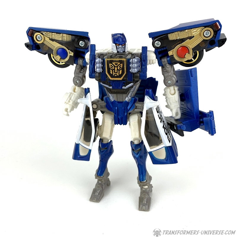 Prowl stellt das simpelste Repaint der drei Autobot Brüder dar, schließlich wurde nur ein Teil seines weiß gegen blau ausgetauscht. Passt aber irgendwie, denn im Cartoon war Prowl auch der langweiligste der drei Brüder. Um der Wahrheit die Ehre zu geben hab' ich ihn mir eigentlich nur der Vollständigkeit halber gekauft, aber das ändert nichts daran, dass er ein rundum solider Roboter ist, wenn auch einige Leute von seinen seltsamen Proportionen und den vielen Anhängseln vielleicht abgeschreckt werden. Ich nicht. Mir gefällt Prowl, ob nun in weiß oder in weiß-blau.