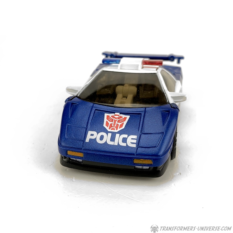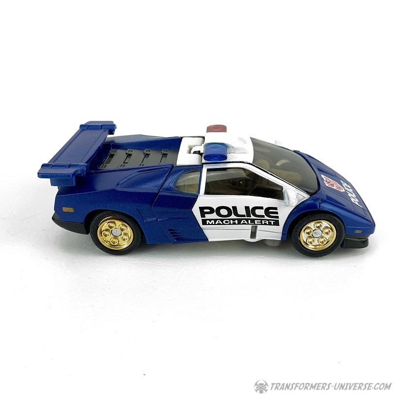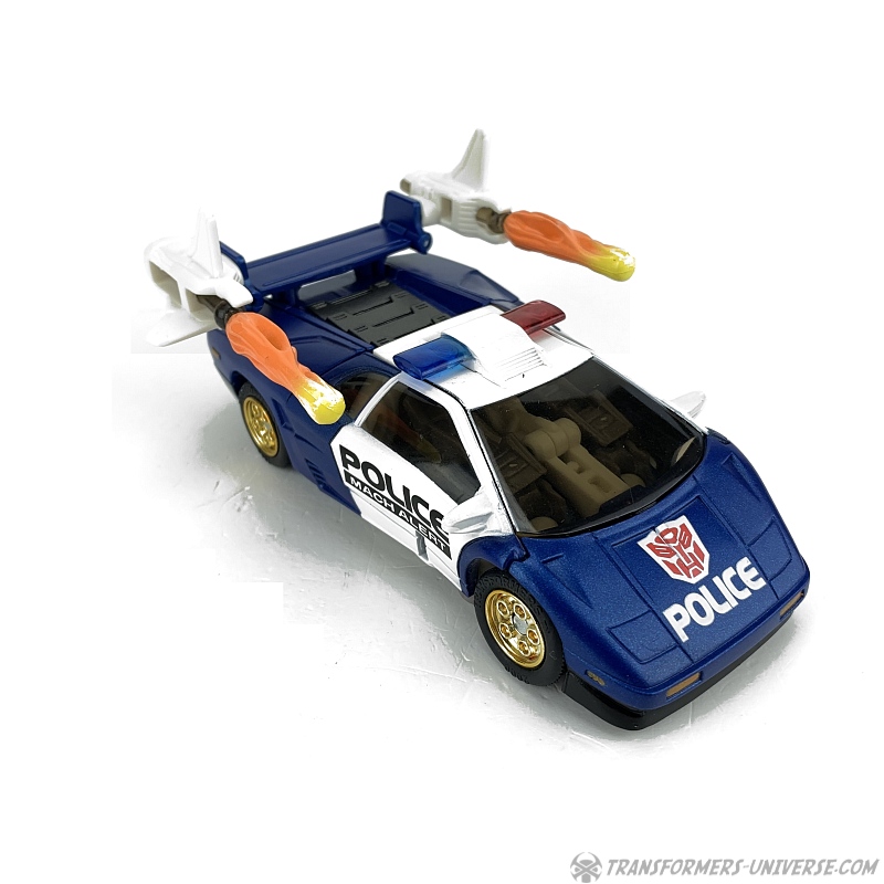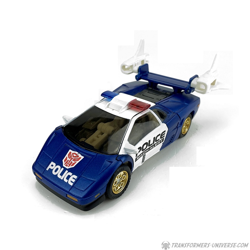 Bemerkungen: Supermode Prowl ist ein Repaint von RID Deluxe Prowl, das komplette Review findet ihr dort. Hier nur ein paar Worte zu den Unterschieden. Für seinen Supermodus wurde Prowls weiße Lackierung im Automodus teilweise blau übermalt, genau wie bei Teilen seines inneren Robotermodus. Die Gimmicks sind die selben geblieben, die Raketen und Raketenwerfer sind unverändert. Allerdings hat er jetzt goldene anstatt silbernen Felgen.