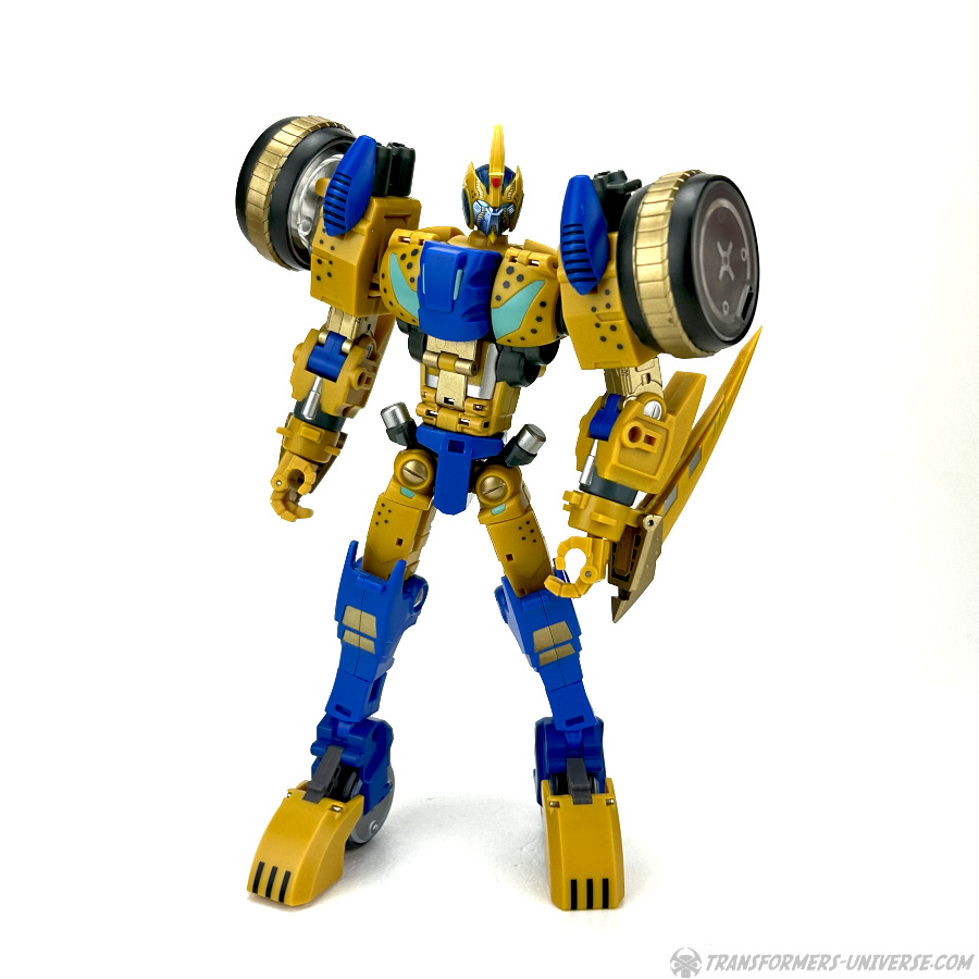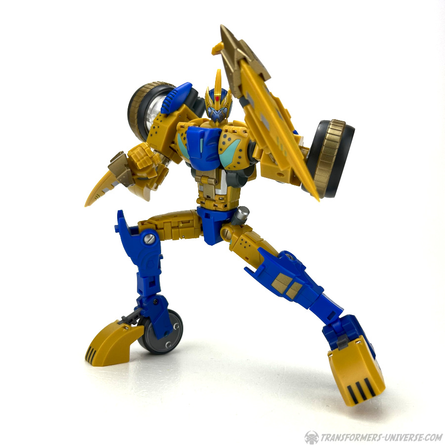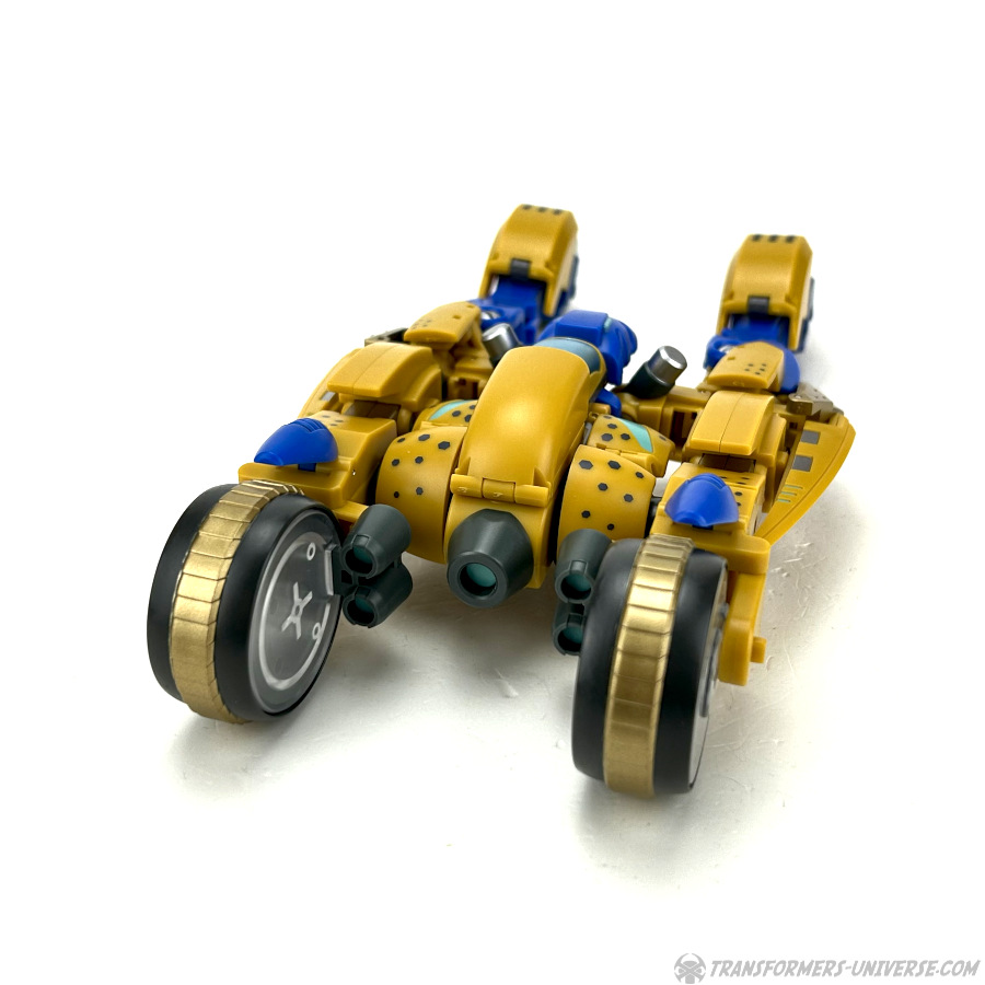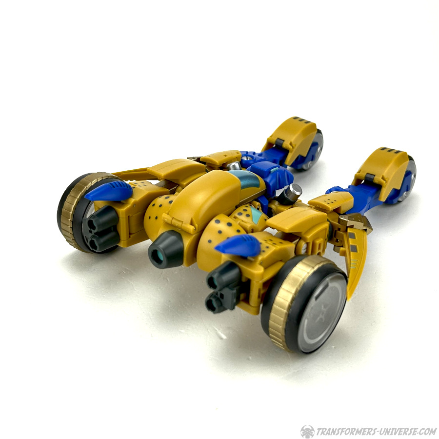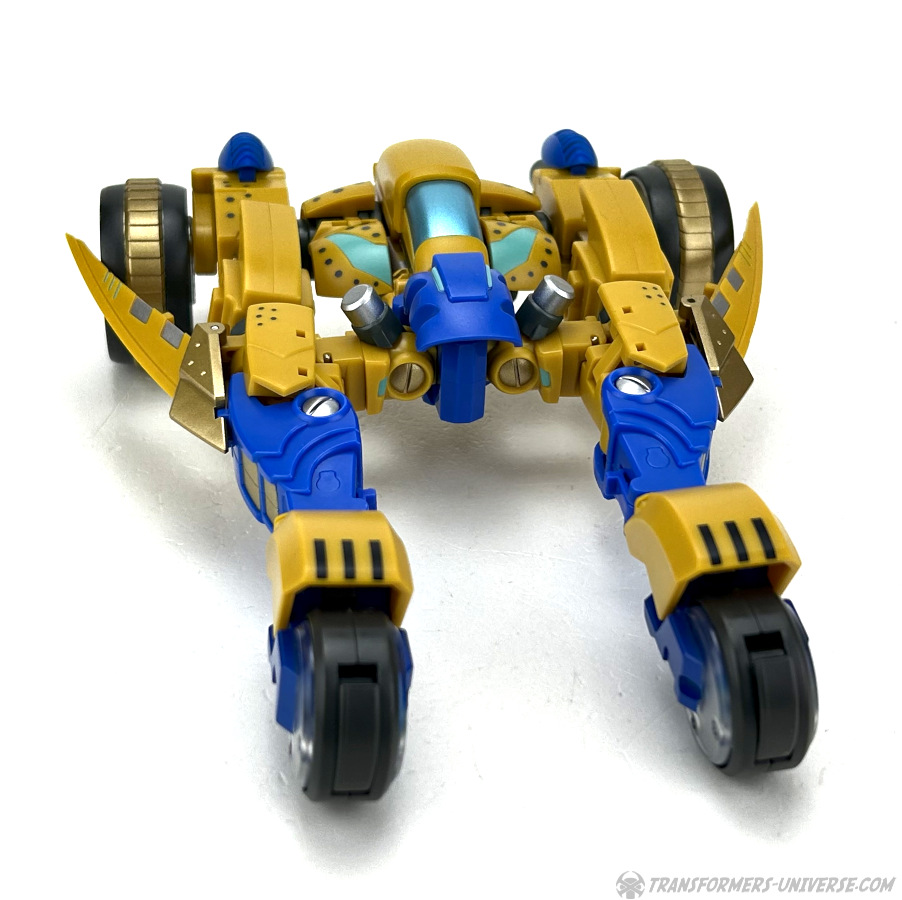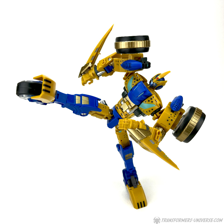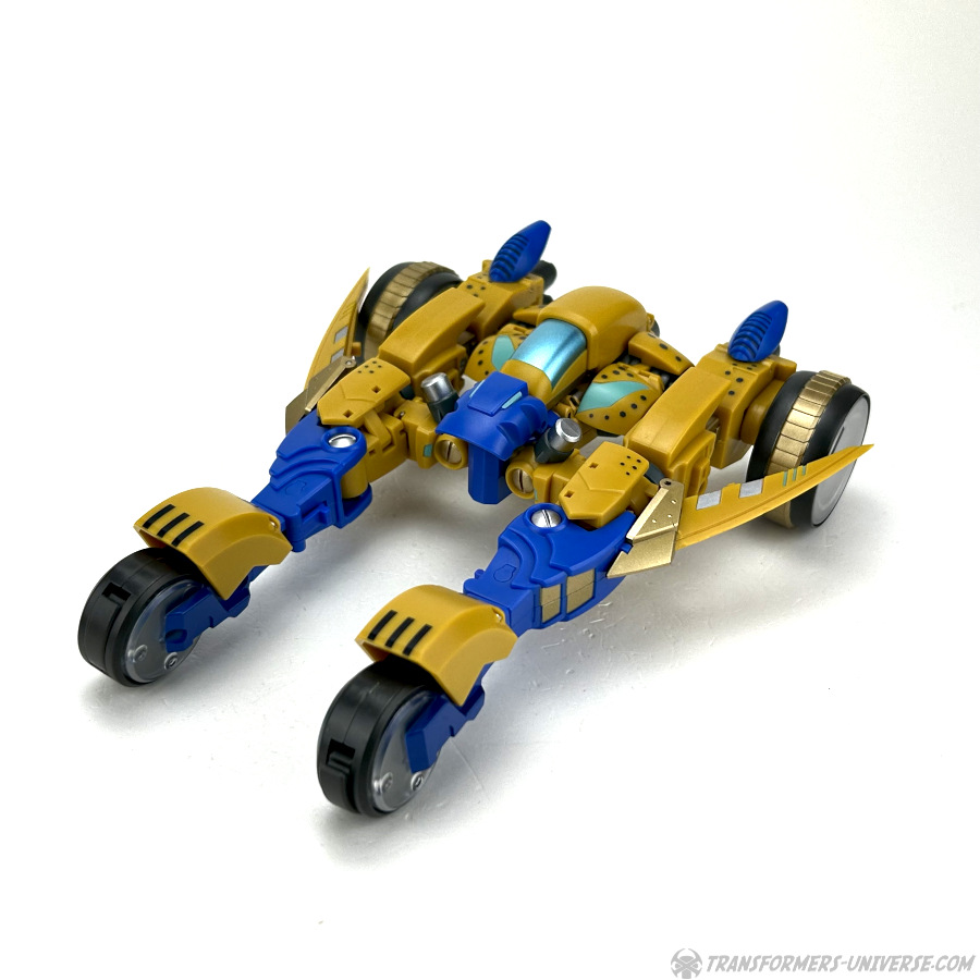 Acinonyx - Robotermodus: Nicht vergessen, dieser Roboter hier war ursprünglich als inoffizielle Version von Chromedome gedacht, wie wir ihn in den Seiten der IDW Comics sahen, speziell in „More than Meets the Eye“ und „Lost Light“. Acinonyx hat sowohl einen neuen Anstrich bekommen, als auch einen neuen Kopf, neue Hände, und die Klingen an seinen Unterarmen. Der Anstrich ist jetzt gelb und blau, Cheetors traditionelle Farben, mit jeder Menge schwarzer Flecken auf dem Gelb, somit ist die Ähnlichkeit zu Cheetor schon mal gegeben. Der neue Kopf basiert auf den Konzeptzeichnungen von Transtech Cheetor, der ja noch nie eine Figur hatte.