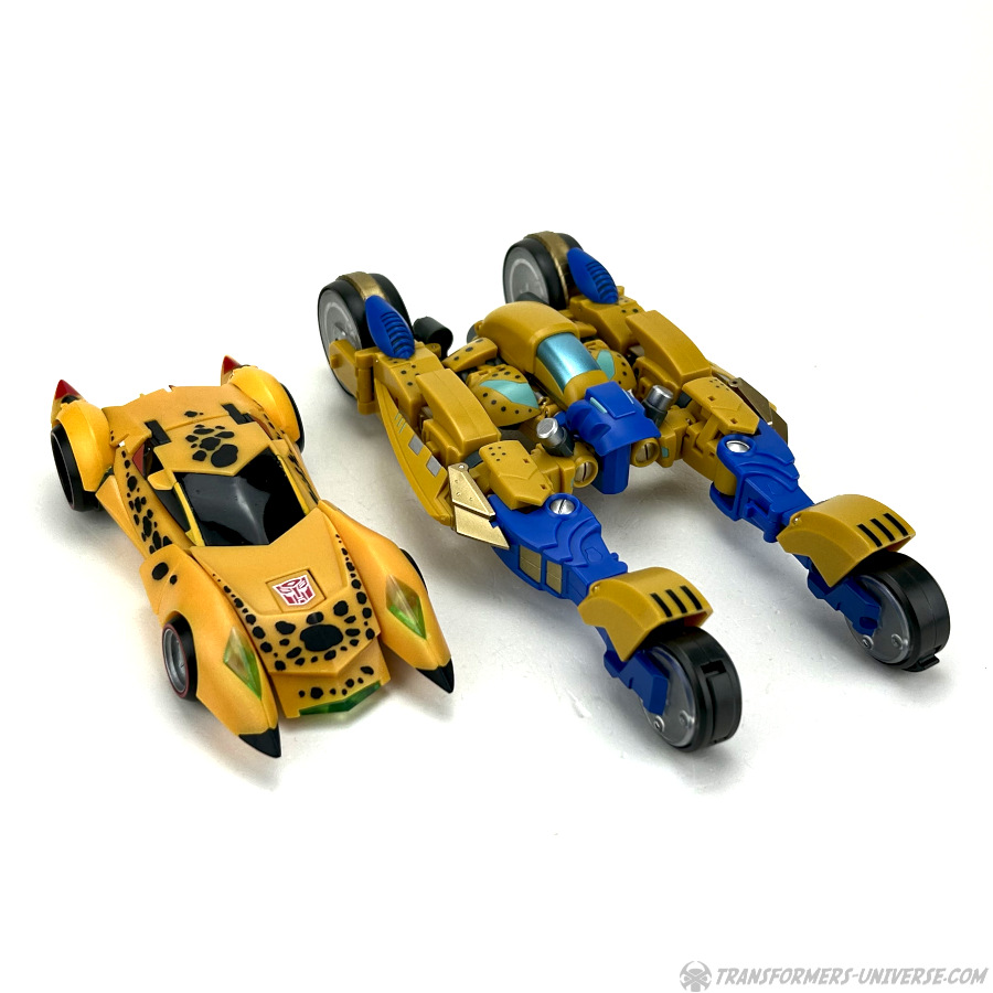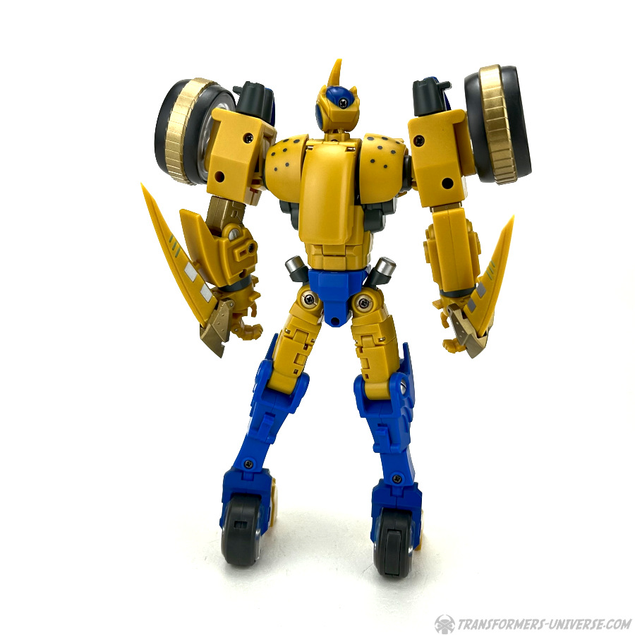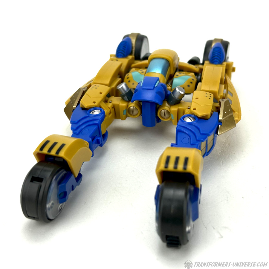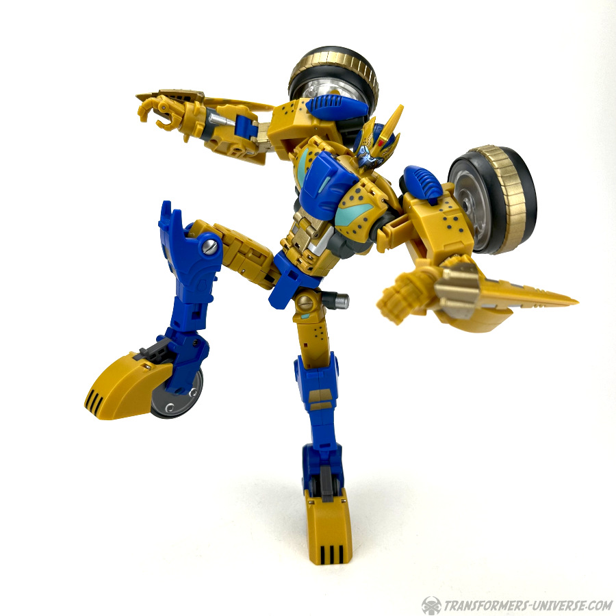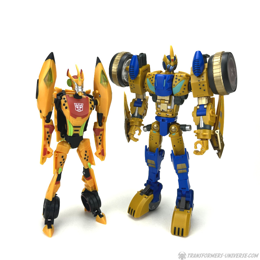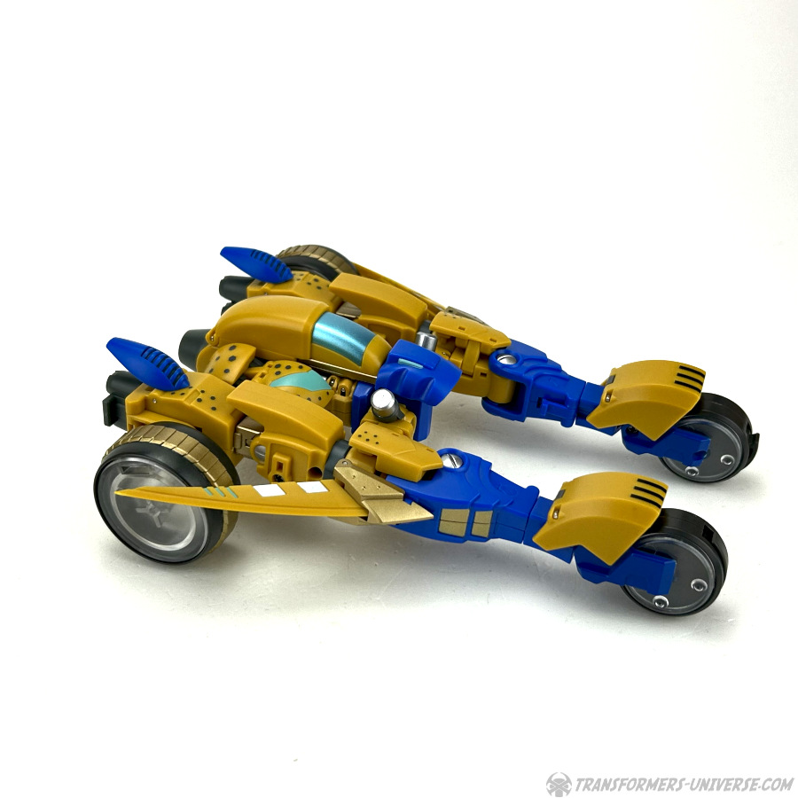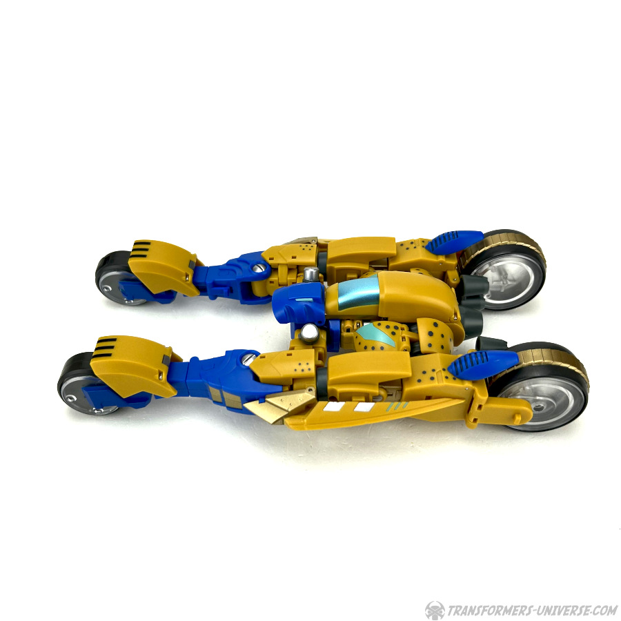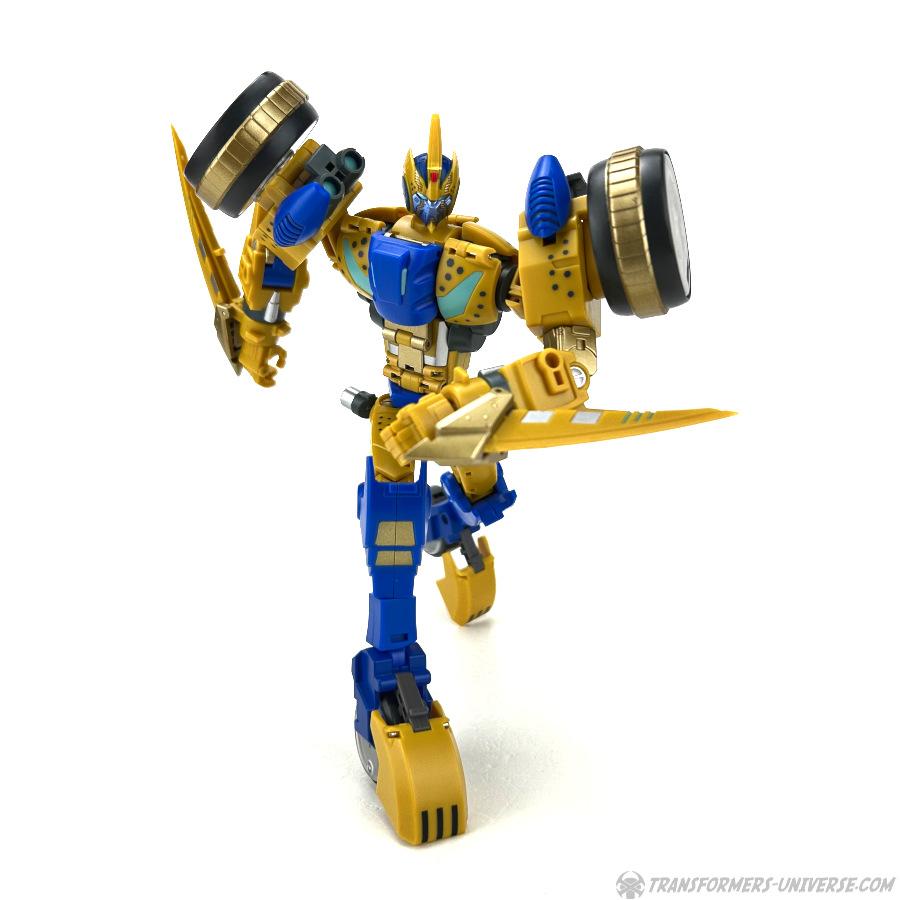 Acinonyx - Robotermodus: Nicht vergessen, dieser Roboter hier war ursprünglich als inoffizielle Version von Chromedome gedacht, wie wir ihn in den Seiten der IDW Comics sahen, speziell in „More than Meets the Eye“ und „Lost Light“. Acinonyx hat sowohl einen neuen Anstrich bekommen, als auch einen neuen Kopf, neue Hände, und die Klingen an seinen Unterarmen. Der Anstrich ist jetzt gelb und blau, Cheetors traditionelle Farben, mit jeder Menge schwarzer Flecken auf dem Gelb, somit ist die Ähnlichkeit zu Cheetor schon mal gegeben. Der neue Kopf basiert auf den Konzeptzeichnungen von Transtech Cheetor, der ja noch nie eine Figur hatte.