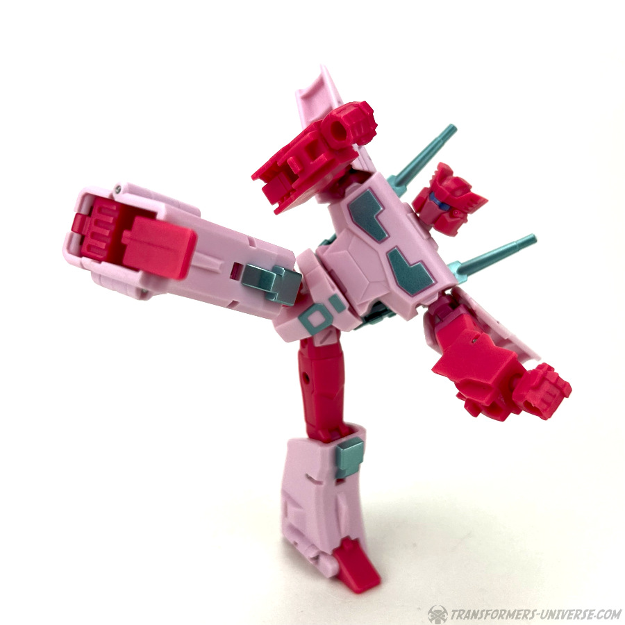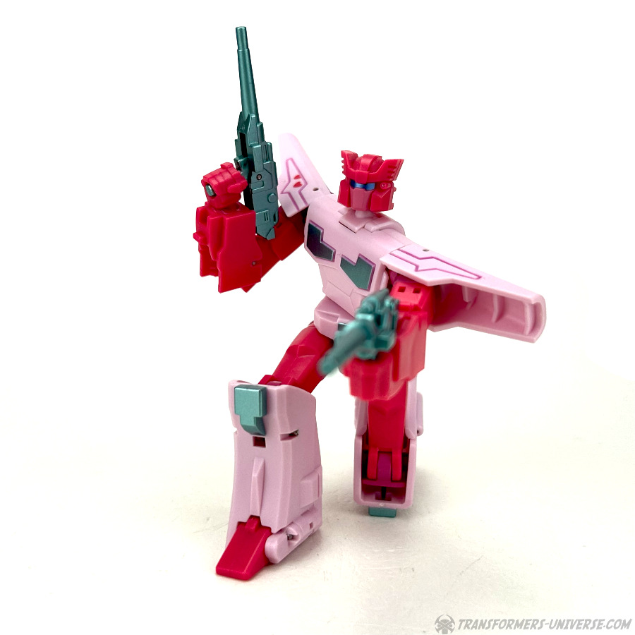 Im Robotermodus sieht Symphony allerdings immer noch sehr wie Rewind aus, fehlen ihr doch die stark modifizierten Proportionen des Animated Charakters. Die Farben sind natürlich anders, denn Symphony ist nun größtenteils ein sehr blasses und ein sehr dunkles, beinahe rotes Rosa. Es gibt ein paar silberne Akzente, inklusive der beiden Kanonen, die sie auf dem Rücken trägt. Sie kann sie natürlich auch in die Hand nehmen und diverse Schussposen einnehmen. Die Beweglichkeit ist sehr gut, steht der von Acinonyx lediglich in den nicht beweglichen Händen nach.