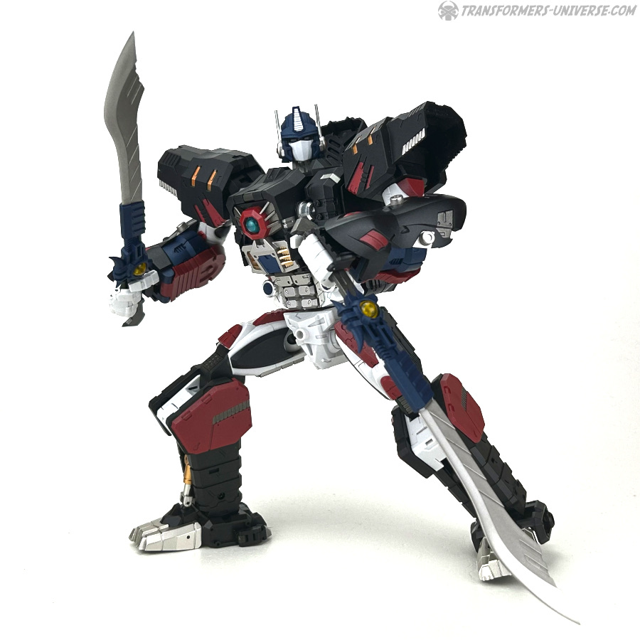 Zwei Dinge unterscheiden ihm vom originalen Optimus Primal. Erstens, der generelle Look. Die Hasbro Figur und der TV Charakter hatten diverse organische Elemente auch im Robotermodus, aber hier findet sich davon nichts. Gorilla tritt als vollständig technologischer Roboter auf, keine Fellteile oder sonst was. Und zweitens, die Waffen. Er trägt Primals bekannte Schwerter (die er mit einem Extrastück auch zu einem Großen verbinden kann) und hat die Schulterkanonen, aber keine Armkanonen und der Schädel-Morgenstern fehlt auch.