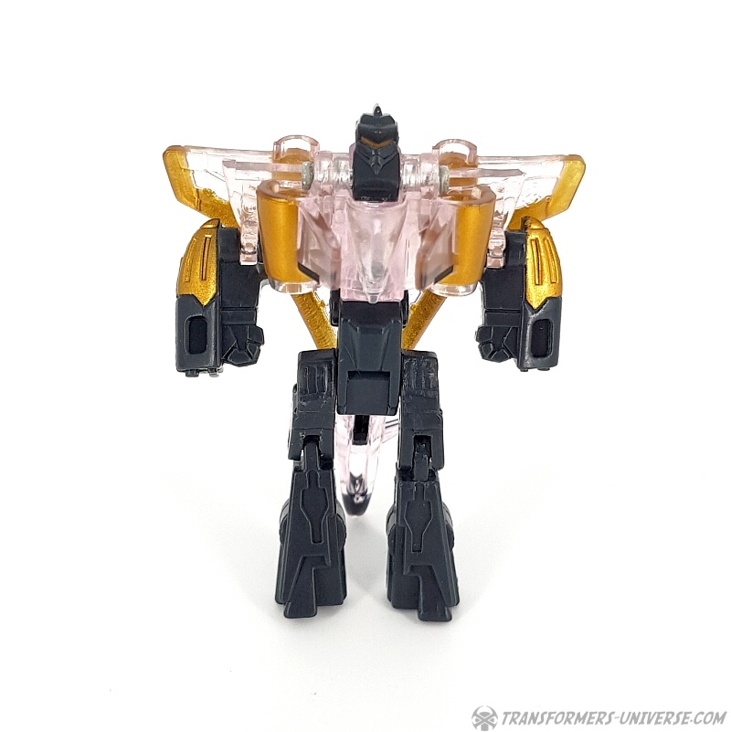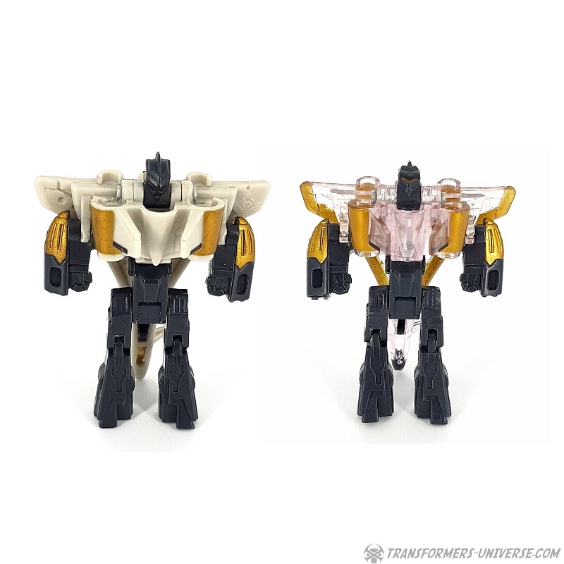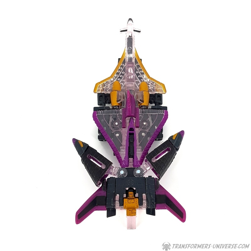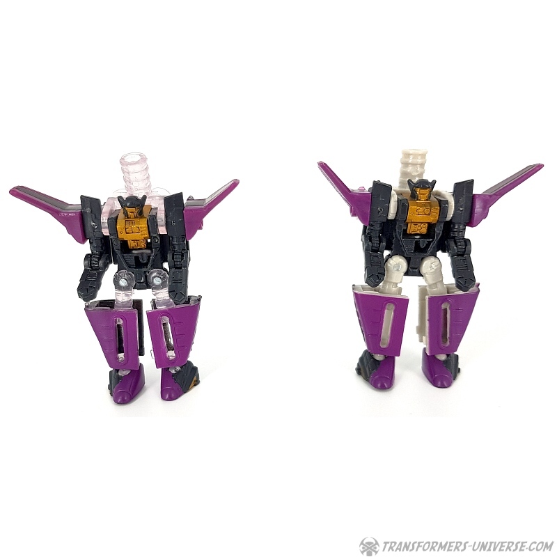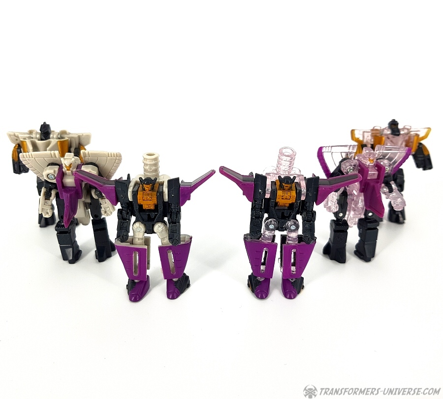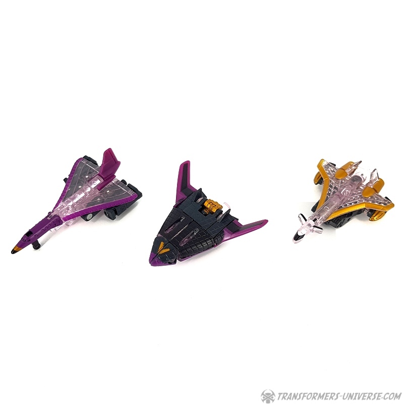 Bemerkungen: Japanische Transformers Fans lieben Mini-Cons (oder Microns, genauer gesagt), somit ist es wenig überraschend, dass es in der Micron Legends Reihe - Takaras Version von Transformers Armada - sogar noch mehr Mini-Cons gibt als in ihrem westlichen Gegenstück. Und eines der beliebtesten Teams sind diese Jungs hier, die ursprünglich als das Armada Air Defense Team rauskamen, bevor sie ein "böses" Repaint in Form des Armada Air Assault Teams bekamen. Beide findet Ihr bereits hier auf der Seite, genau wie das X-Dimension Air Defense Team. Hier also nichts wirklich Neues, einfach drei kleine Mini-Cons, die zu Jets transformieren und sich zu einem großen Schwert kombinieren, hier als Dark Saber bekannt. Der Hauptunterschied zwischen der Hasbro Armada und der Takara Micron Legends Version ist, dass Takara hier transparente Teile eingesetzt hat, plus ein paar minimale Farbdifferenzen.
