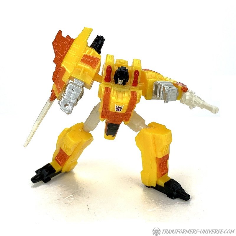 Als Figur ist Sunstorm mehr oder weniger identisch mit Voyager Klasse Starscream, nur eben deutlich kleiner. Aber er hat das gleiche Layout und sogar fast die gleiche Beweglichkeit. Sunstorm hat Ellbogen, Knie, eigentlich alles. Nur den Kopf kann er nicht drehen, aber das ist glaube ich die einzige Einschränkung im Vergleich mit der größeren Figur. Natürlich hat Sunstorm auch einen neuen Anstrich bekommen, orange und gelb mit silbernen und hellgrauen Highlights. Er ist immer noch als (Cybertron) Seeker erkennbar, sieht aber trotzdem sehr individuell aus.