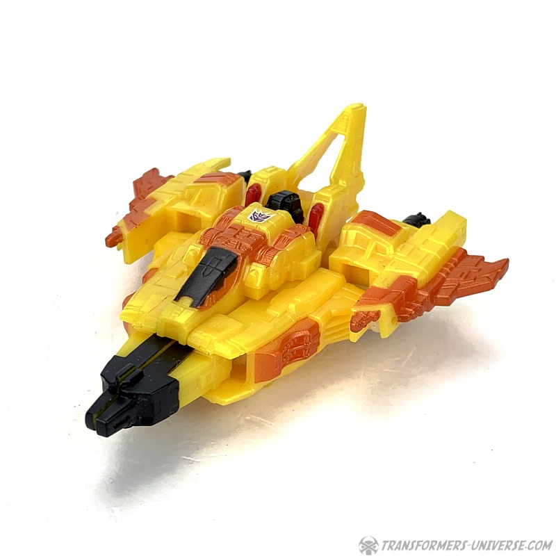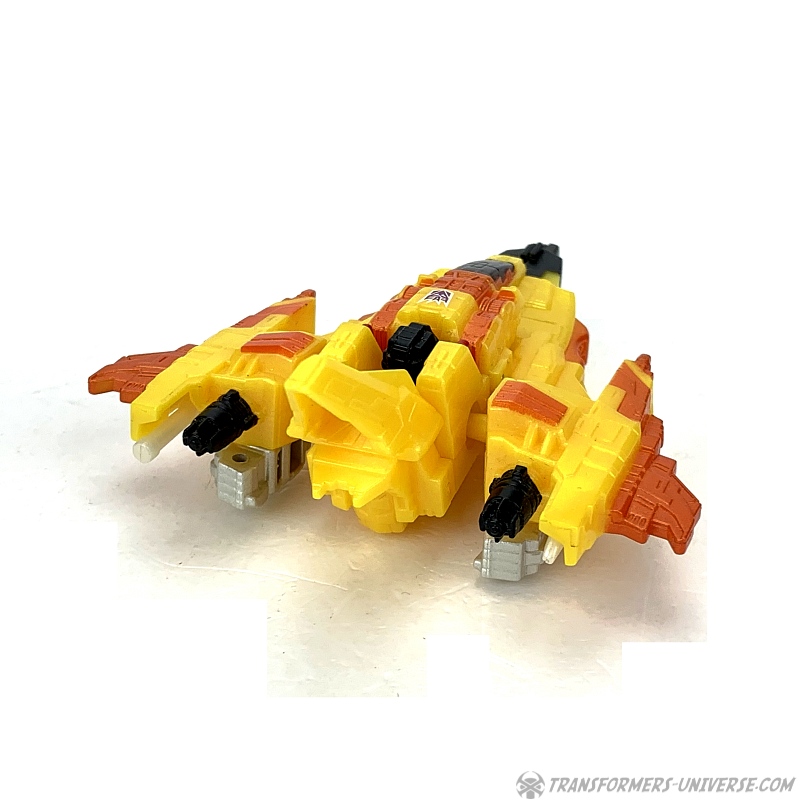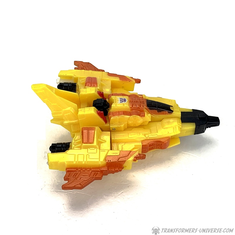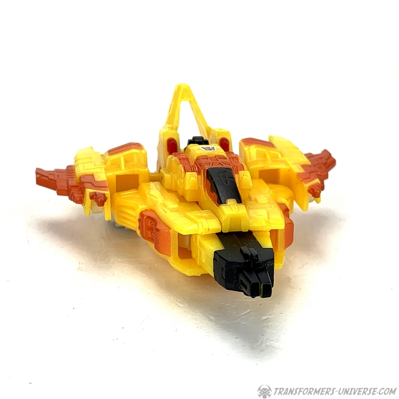 Alternativmodus: Natürlich verwandelt sich Sunstorm in die gleiche Art von Science Fiction Weltraumjet wie Cybertron Starscream (egal in welcher Größenklasse). Die Transformation ist praktisch identisch, das einzige was fehlt ist die längere Nase des Jets, die bei den größeren Figuren aus den Füßen ausklappt. Somit hat die Legends Figur eine etwas gestumptere Nase im Jetmodus. Ansonsten aber ist es der gleiche Jet, nur kleiner und halt mit anderen Farben. Okay, die Flügel sind auch etwas kürzer, aber Aerodynamik hat ja bei cybertronischen Jets noch nie eine Rolle gespielt, glaube ich.