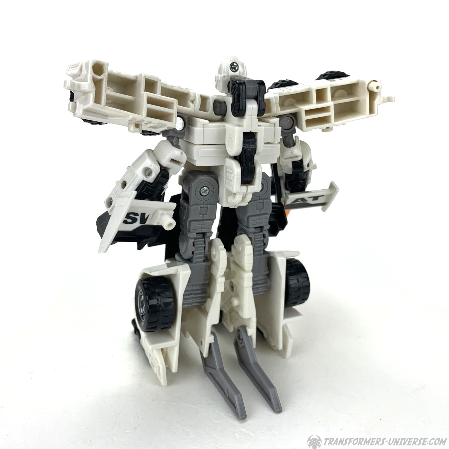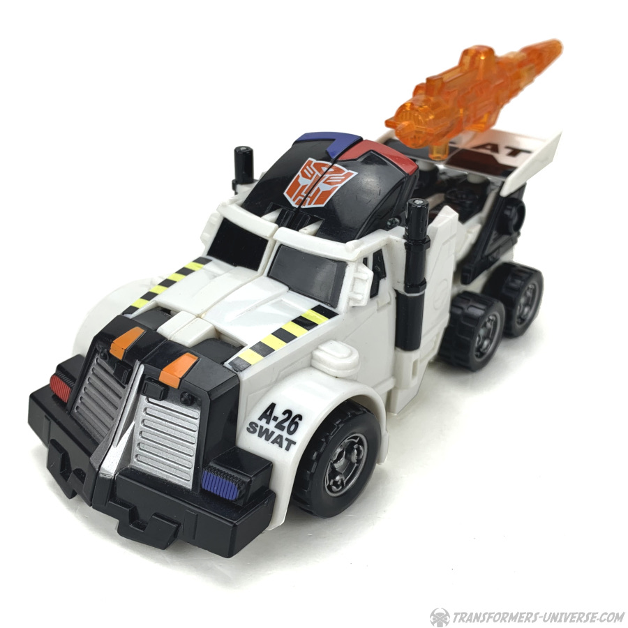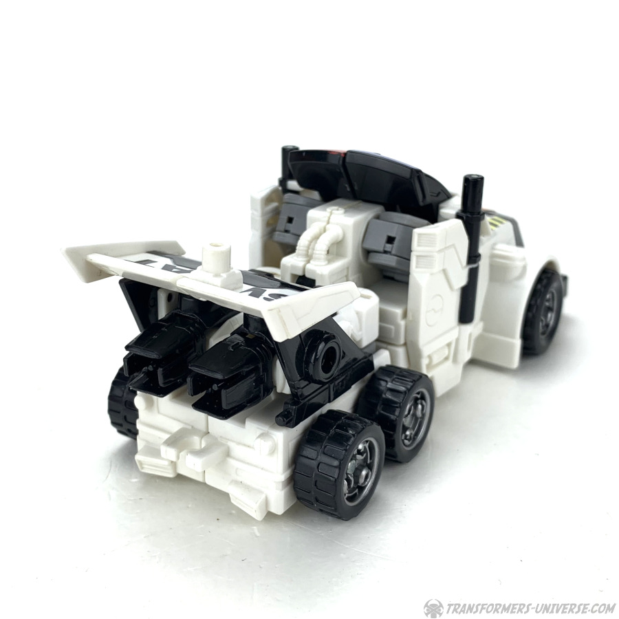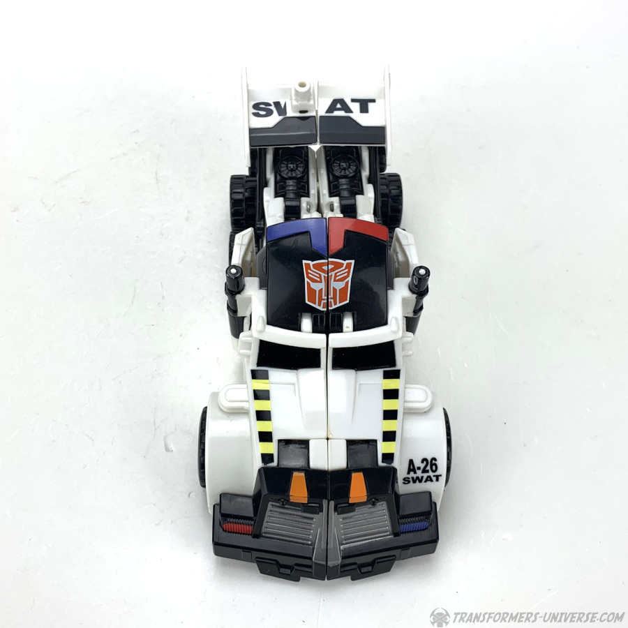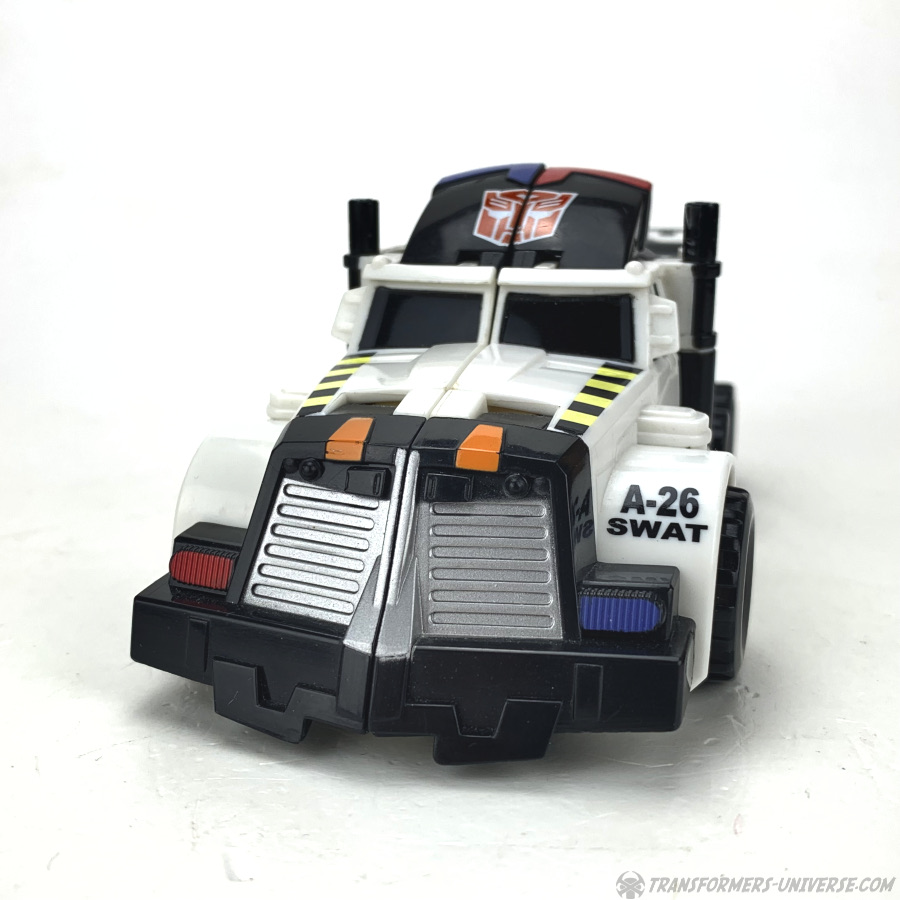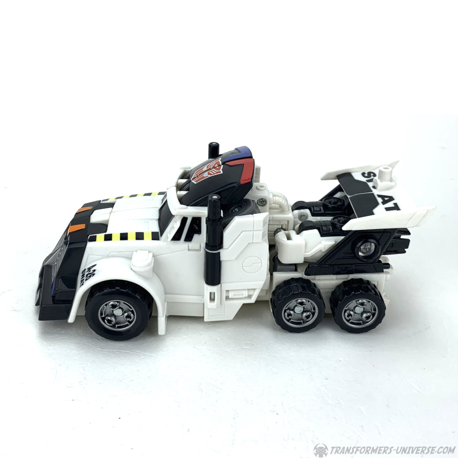 Checkpoint ist ein einfaches Repaint ohne strukturelle Änderungen. Der Körper ist jetzt größtenteils weiß mit schwarzen Akzenten, ein paar blau-gelben Streifen auf der Brust, und dem roten Chevron auf der Stirn, den wir von G1 Prowl kennen. Er hat blaue und rote Streifen auf den Füßen, die ja zum Dach des Trucks werden und somit Polizeilichter andeuten sollen. Die Worte „A-26 SWAT“ sind auf den einen Kotflügel gedruckt, um den Namen des Doppelpacks aufzugreifen, wo er drin war (Autobot SWAT Team).