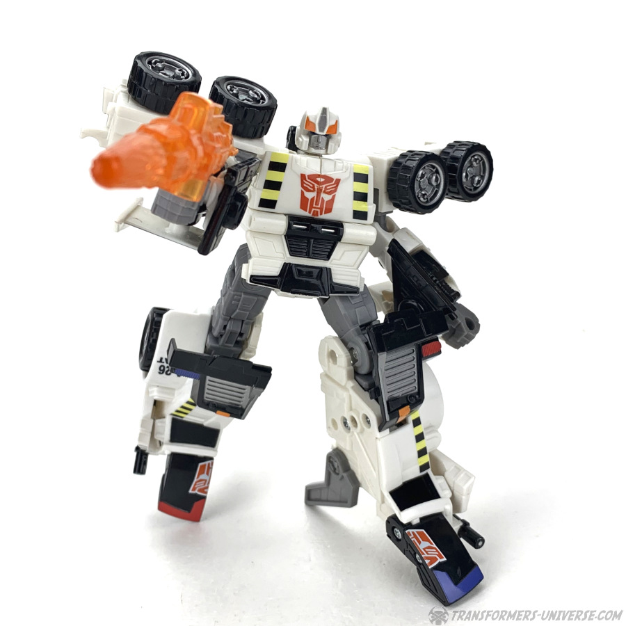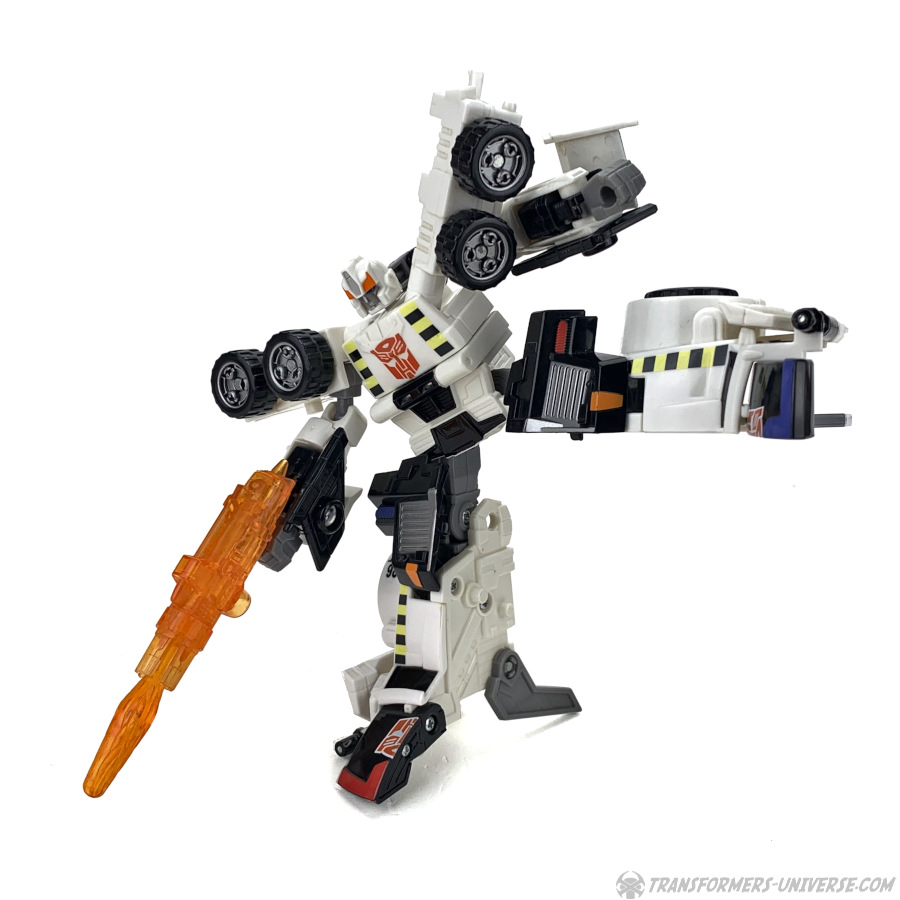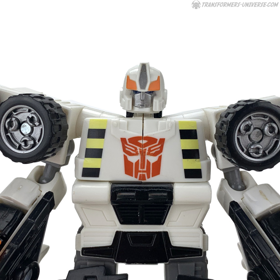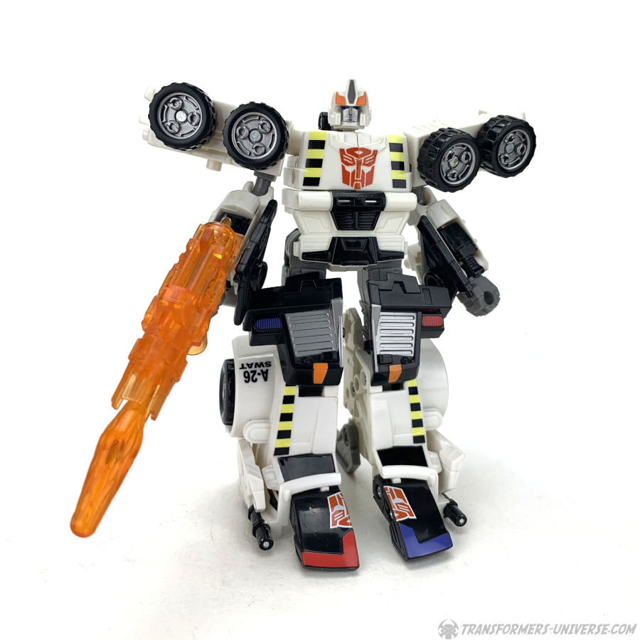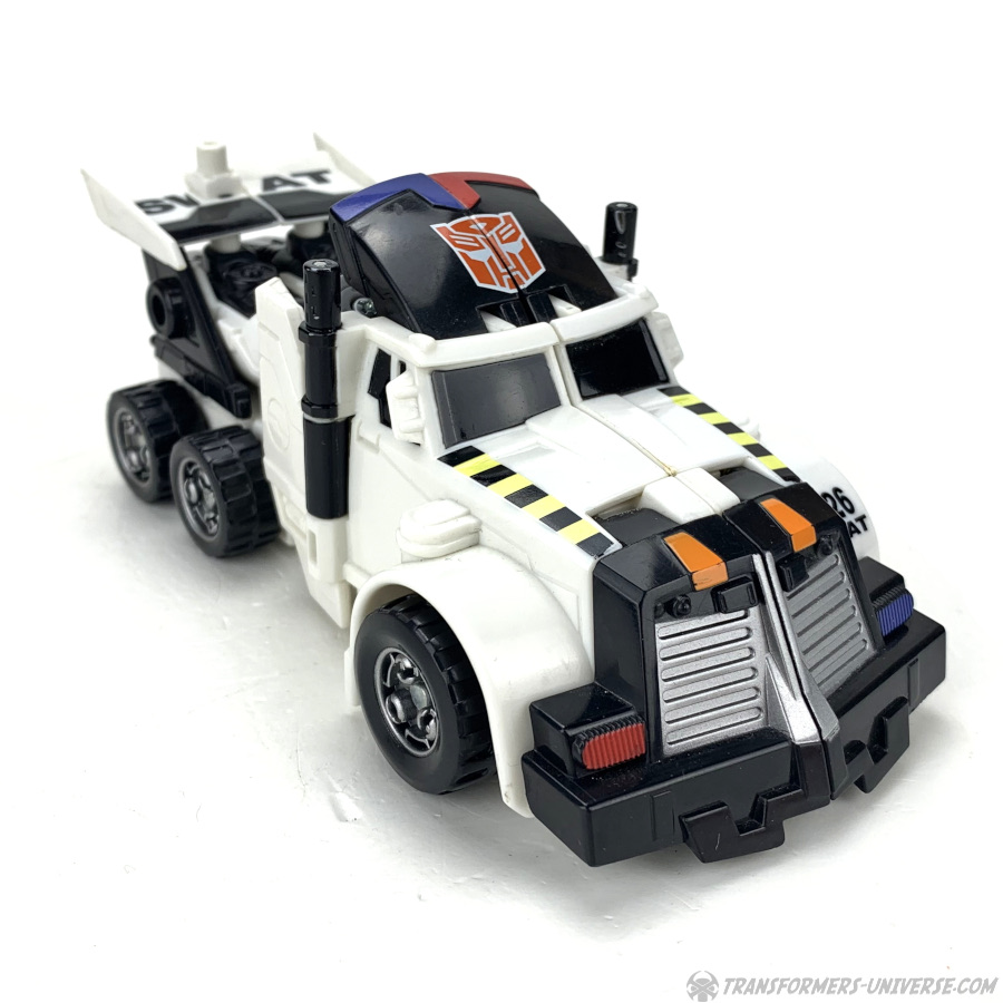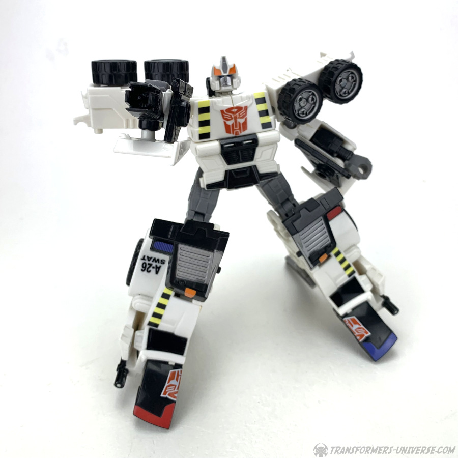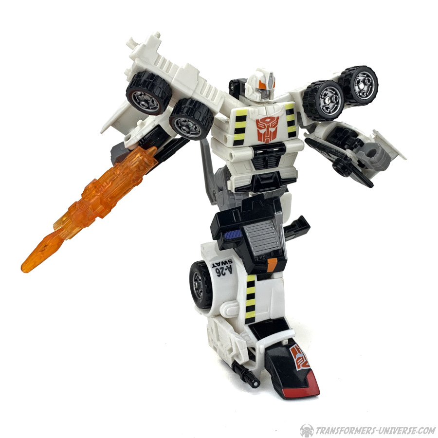 Checkpoint ist ein einfaches Repaint ohne strukturelle Änderungen. Der Körper ist jetzt größtenteils weiß mit schwarzen Akzenten, ein paar blau-gelben Streifen auf der Brust, und dem roten Chevron auf der Stirn, den wir von G1 Prowl kennen. Er hat blaue und rote Streifen auf den Füßen, die ja zum Dach des Trucks werden und somit Polizeilichter andeuten sollen. Die Worte „A-26 SWAT“ sind auf den einen Kotflügel gedruckt, um den Namen des Doppelpacks aufzugreifen, wo er drin war (Autobot SWAT Team).