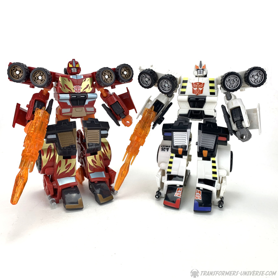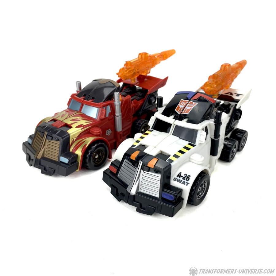 Das Autobot SWAT Team Doppelpack, in dem es Checkpoint gab, war in den USA exklusiv beim K-Mart erhältlich. Man findet ihn heute noch auf eBay, allerdings zu einem recht hohen Preis. Ich hatte nie Interesse an dem grauen Prowl, aber ich hätte ja immer noch gerne einen Checkpoint, bevorzugt einen ohne gebrochenen Powerlinx Hebel auf dem Rücken.