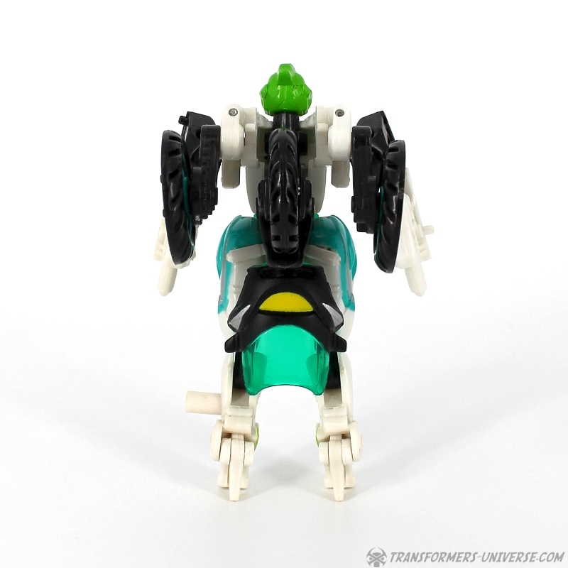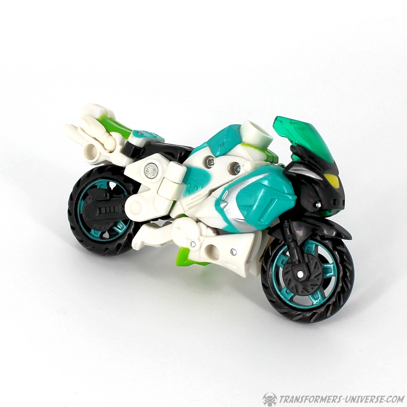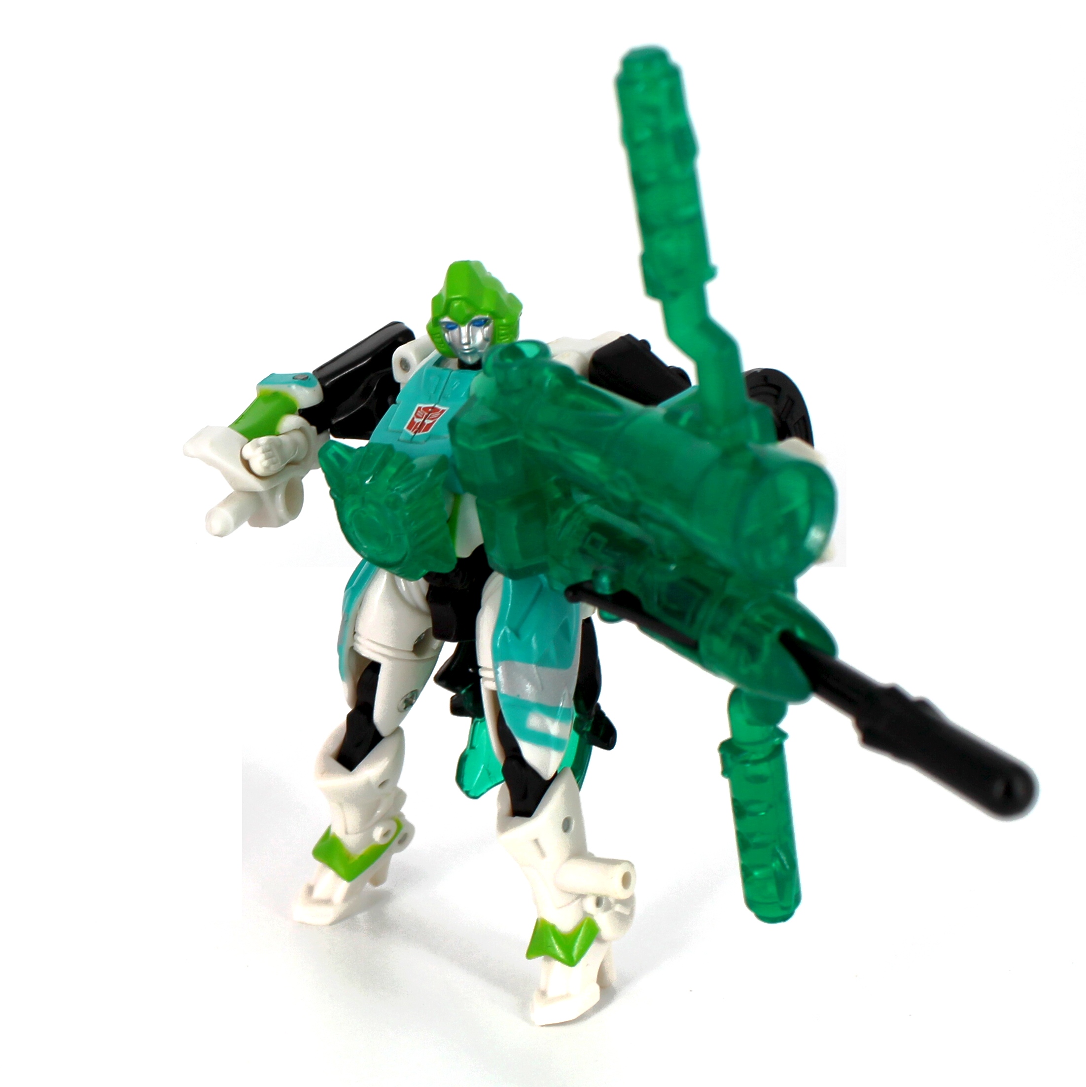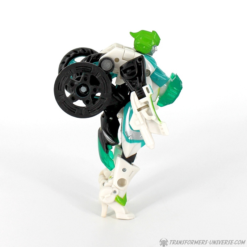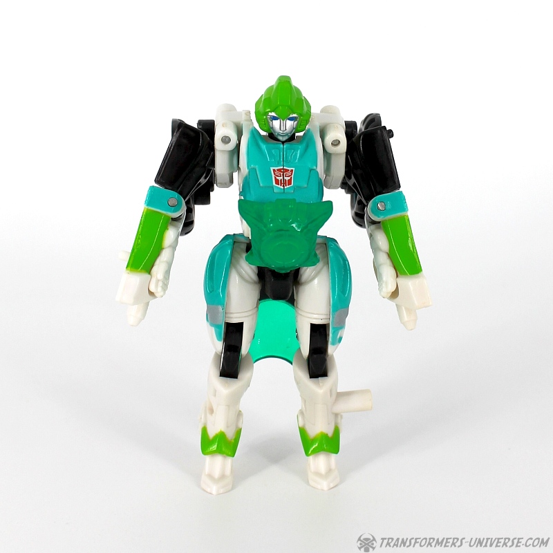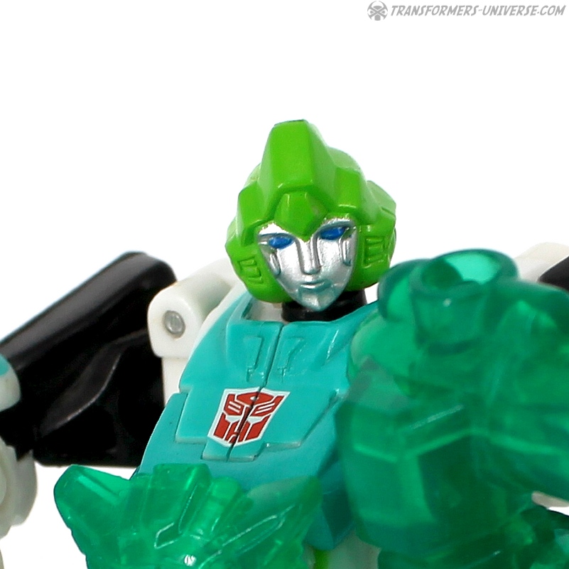 Bemerkungen: Ariel ist die Takara Version von Energon Arcee, die ich bereits rezensiert habe, genau wie ihre blaue Movie Version. Dieses Repaint hier ist eine Hommage an die "Paradron Medic", die grüne Arcee Variante, die in der G1 Folge "Fight or Flee" als Krankenschwester aufgetreten ist. Ein separater Charakter soll sie allerdings hier nicht sein, sie ist Ariel/Arcee, halt nur in einer Repaint Variante, die in begrenzter Stückzahl bei Takaras Toy Dream Project erhältlich war.