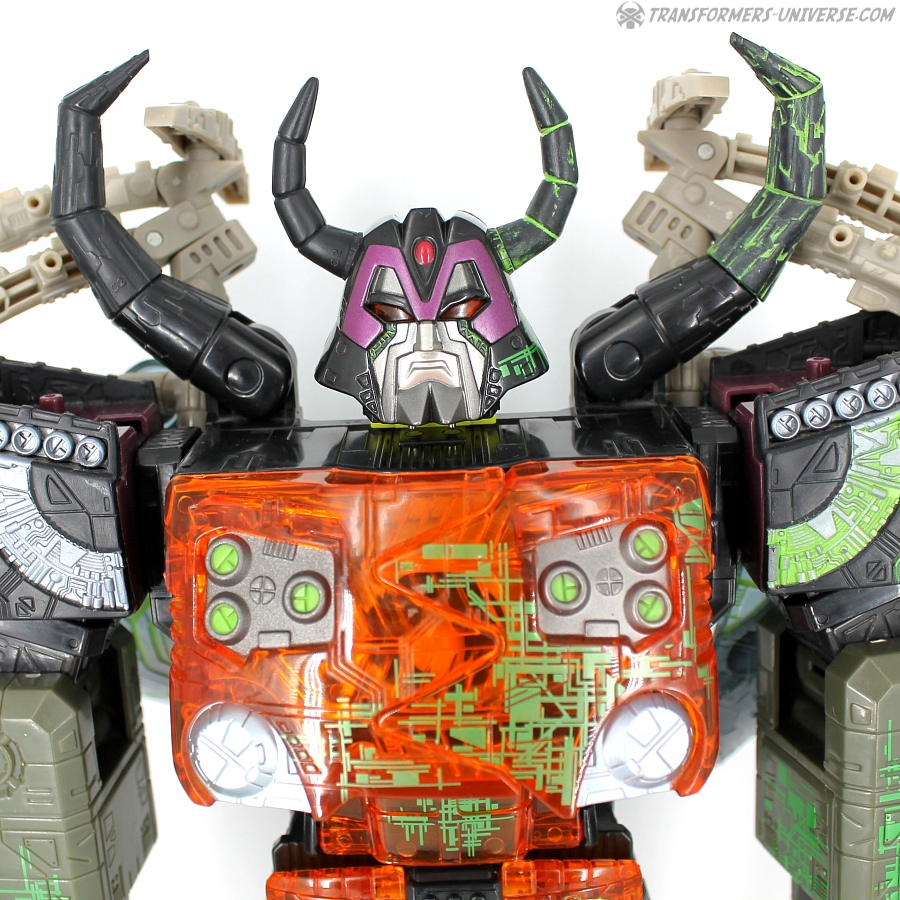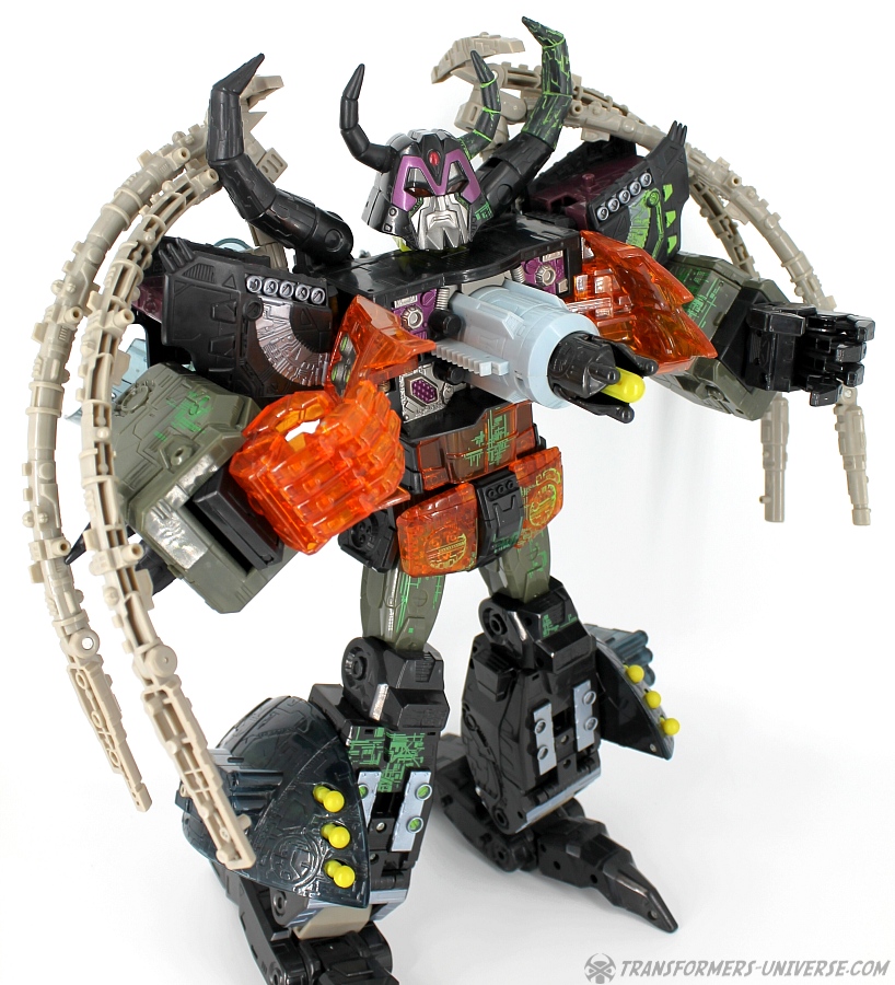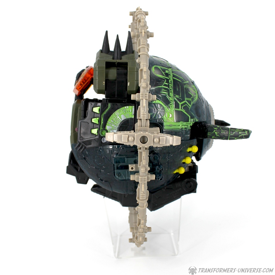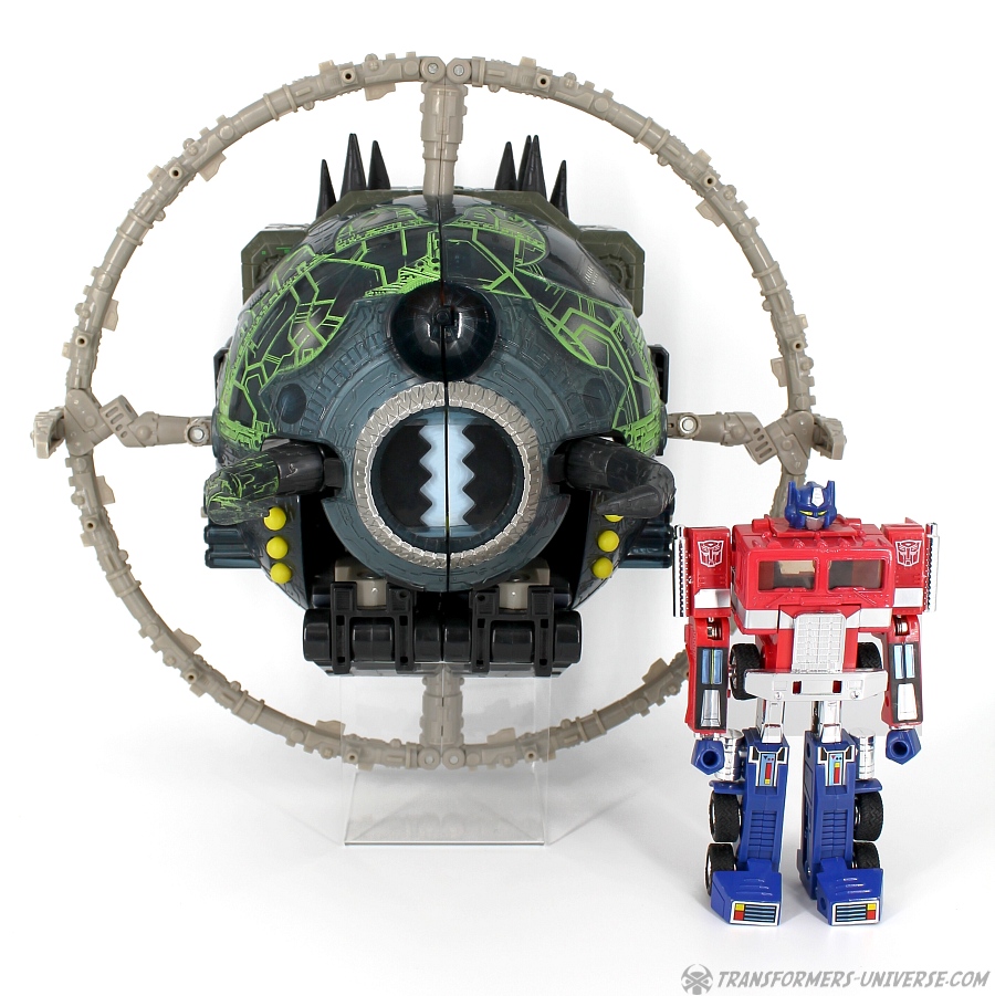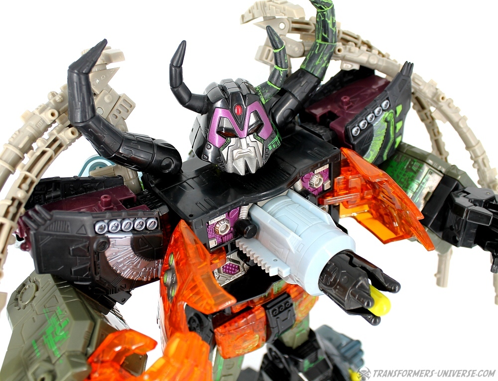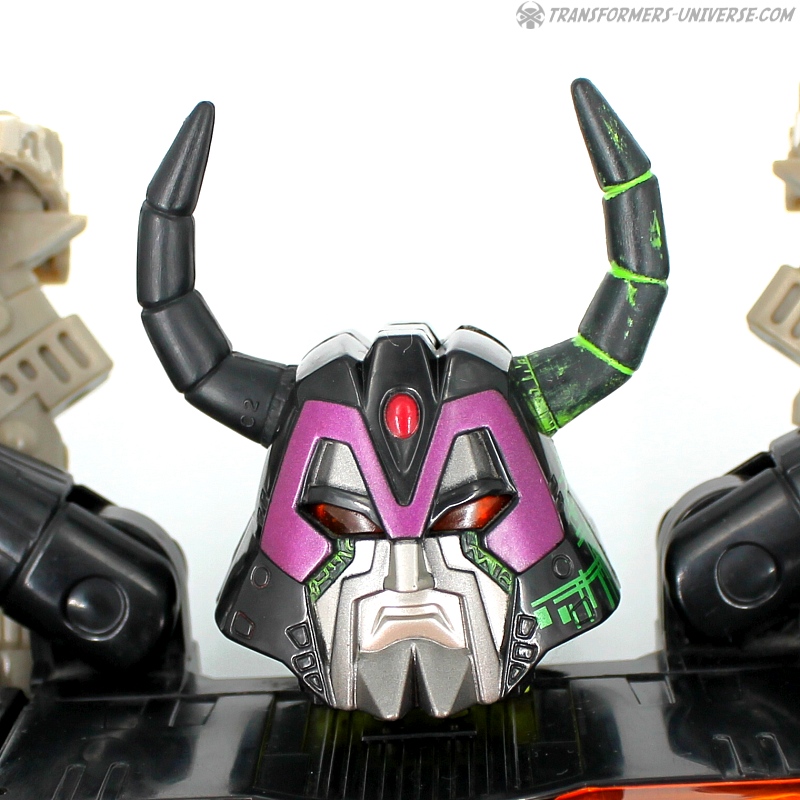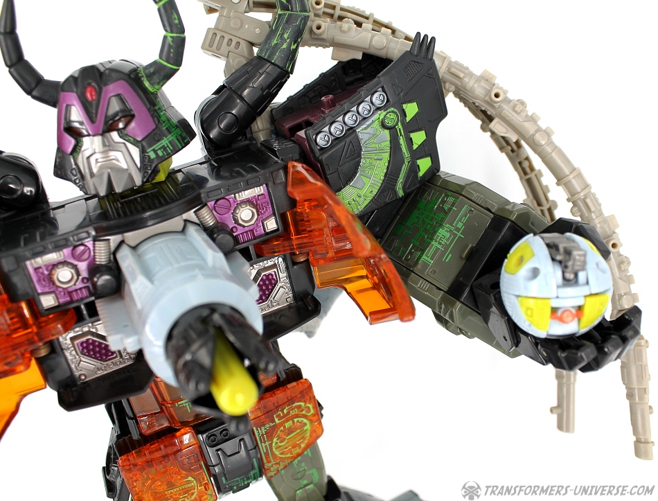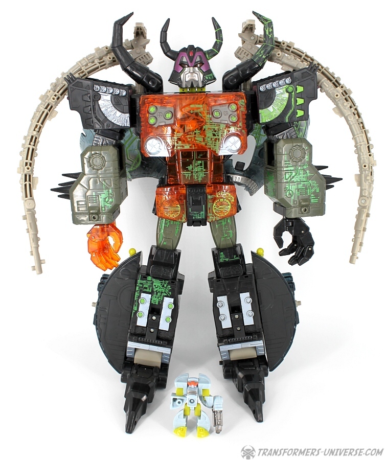 Bemerkungen: Energon Unicron ist ein einfaches Repaint von Armada Unicron, den ich bereits rezensiert habe. Keine baulichen Änderungen an der Figur selbst, ebensowenig an Mini-Con Dead End, der ebenfalls ein reines Repaint ist. Unicron erhielt diese Farben mitten im Energon Cartoon, als er von den Decepticons erfolgreich reaktiviert wurde. Natürlich wurde er dann wieder zerstört, wieder reaktiviert, und nochmal zerstört. Energon war von der Story her kein so wirklich guter Cartoon, aber die Toys waren klasse. Es gab noch einige weitere Repaints der Figur seitdem. Und ich frage mich, wann wir endlich HasLab Unicron in diesen Farben sehen werden.