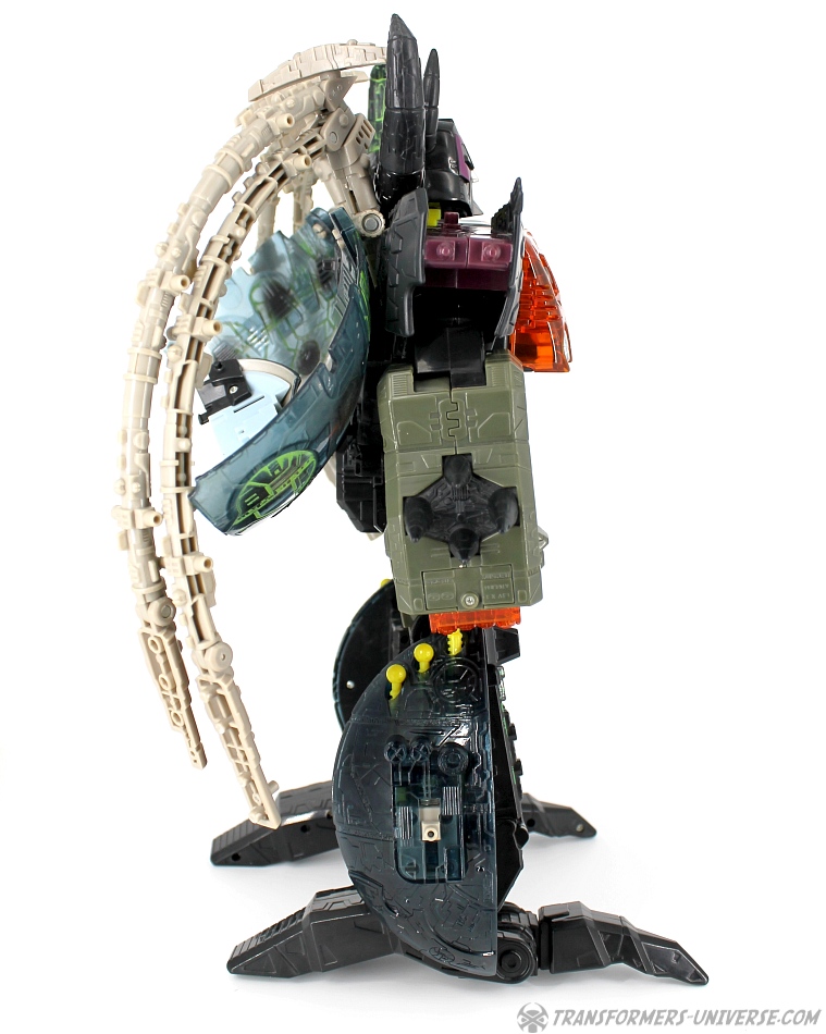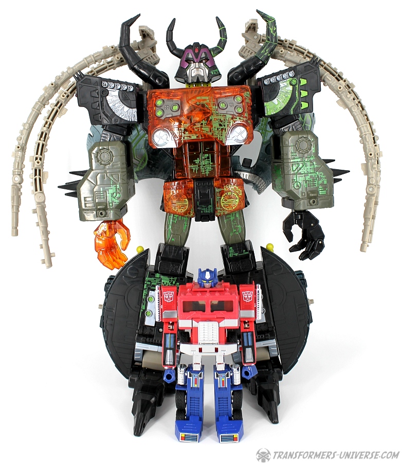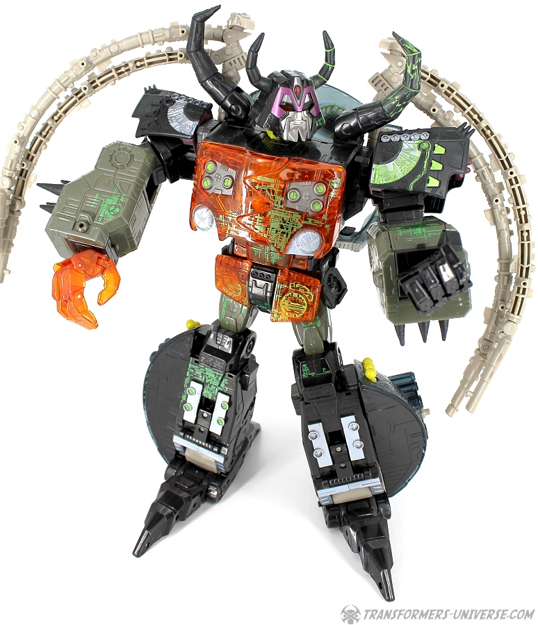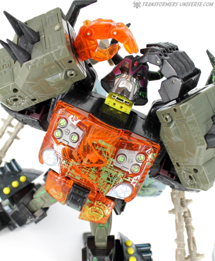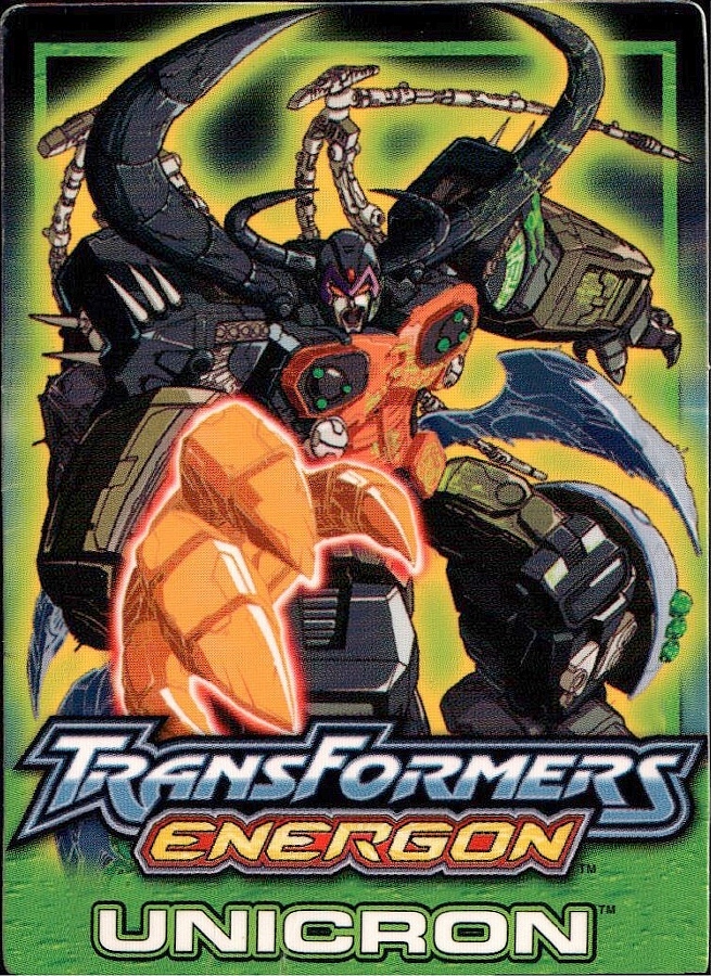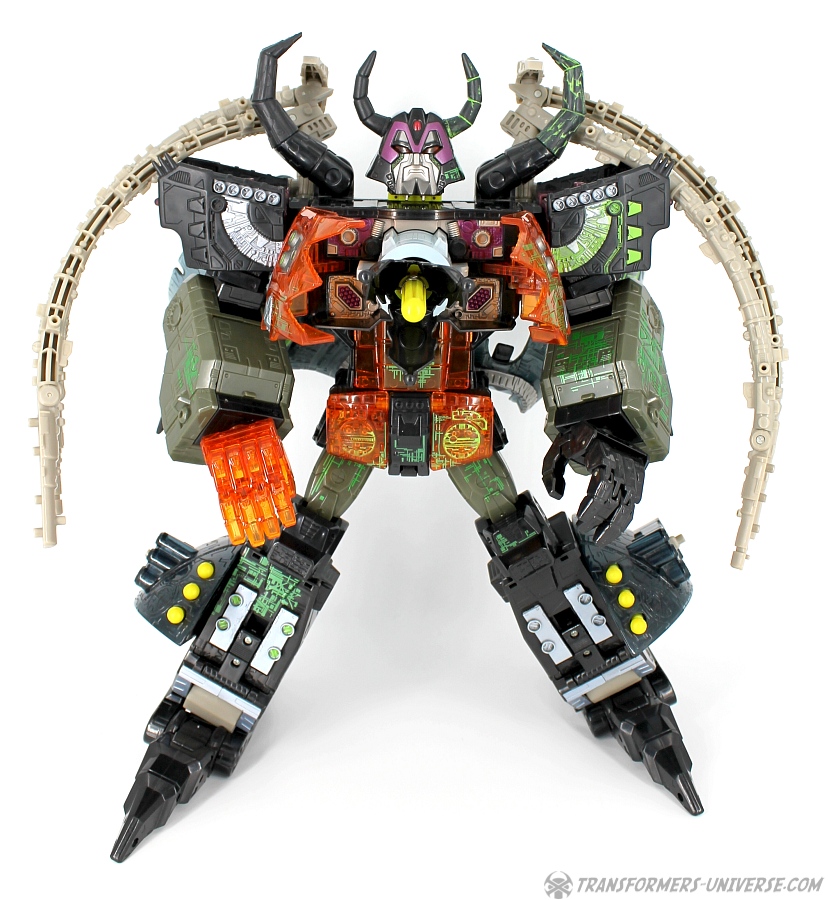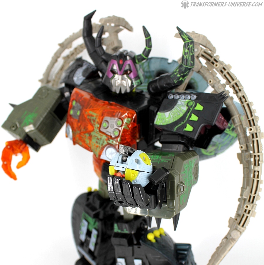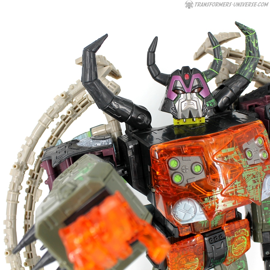 Bemerkungen: Energon Unicron ist ein einfaches Repaint von Armada Unicron, den ich bereits rezensiert habe. Keine baulichen Änderungen an der Figur selbst, ebensowenig an Mini-Con Dead End, der ebenfalls ein reines Repaint ist. Unicron erhielt diese Farben mitten im Energon Cartoon, als er von den Decepticons erfolgreich reaktiviert wurde. Natürlich wurde er dann wieder zerstört, wieder reaktiviert, und nochmal zerstört. Energon war von der Story her kein so wirklich guter Cartoon, aber die Toys waren klasse. Es gab noch einige weitere Repaints der Figur seitdem. Und ich frage mich, wann wir endlich HasLab Unicron in diesen Farben sehen werden.