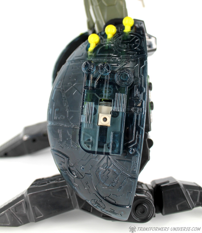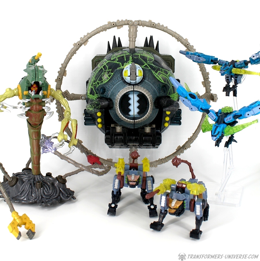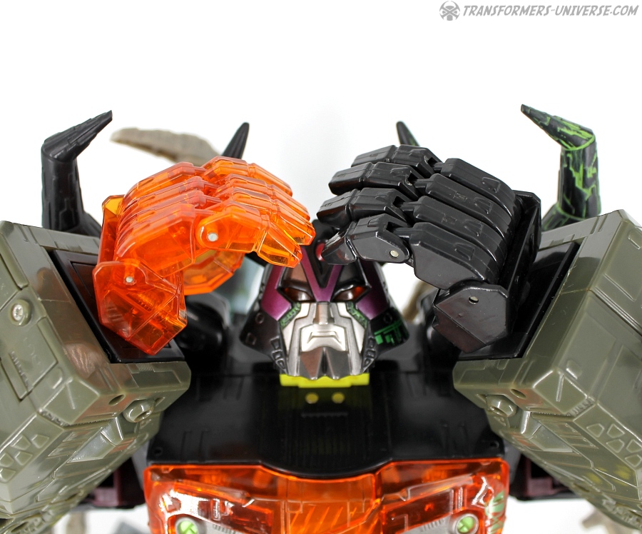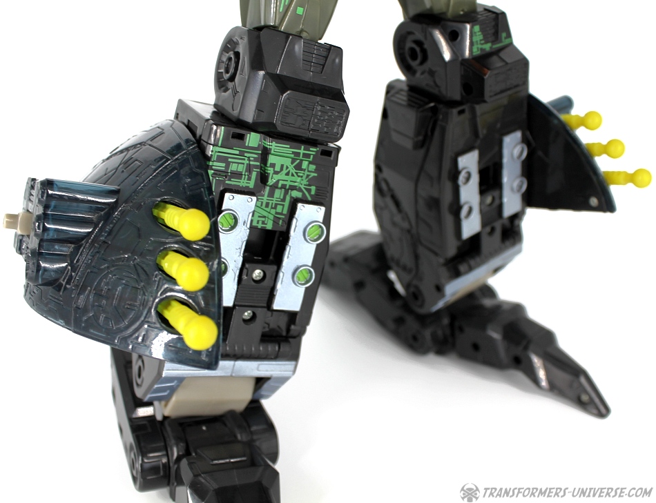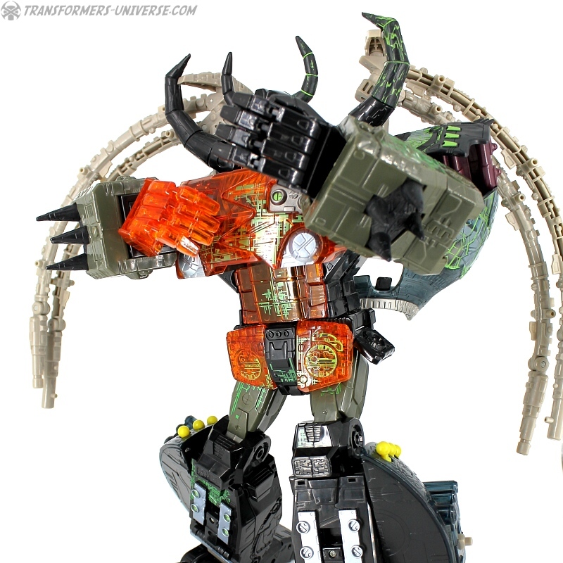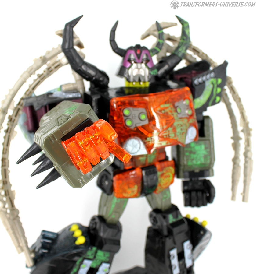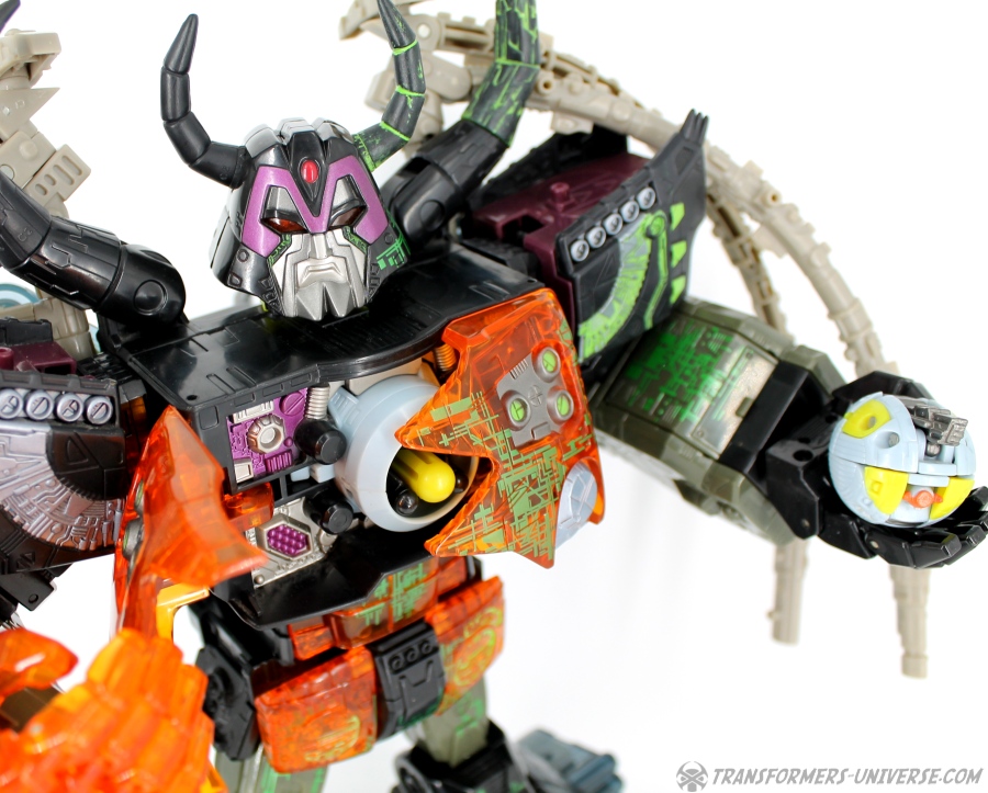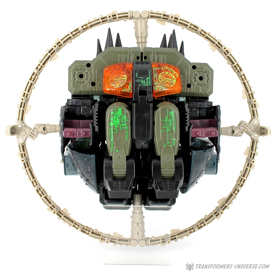 Bemerkungen: Energon Unicron ist ein einfaches Repaint von Armada Unicron, den ich bereits rezensiert habe. Keine baulichen Änderungen an der Figur selbst, ebensowenig an Mini-Con Dead End, der ebenfalls ein reines Repaint ist. Unicron erhielt diese Farben mitten im Energon Cartoon, als er von den Decepticons erfolgreich reaktiviert wurde. Natürlich wurde er dann wieder zerstört, wieder reaktiviert, und nochmal zerstört. Energon war von der Story her kein so wirklich guter Cartoon, aber die Toys waren klasse. Es gab noch einige weitere Repaints der Figur seitdem. Und ich frage mich, wann wir endlich HasLab Unicron in diesen Farben sehen werden.