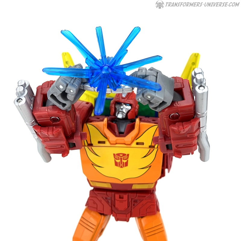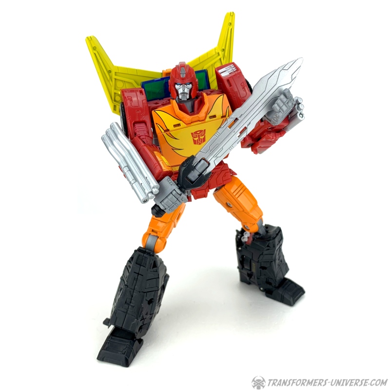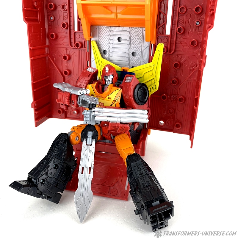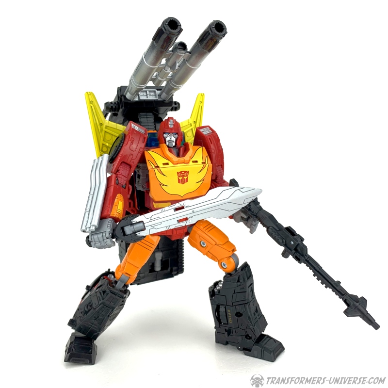 Neben dem rollen Roboter selbst hat Rodimus ein paar tolle Zubehörteile in petto. Er hat sein klassisches Gewehr, dass er einmal falten und an der Seite seines Rucksacks verstauen kann. Er trägt außerdem das toll aussehende Schwert on Primus aus den Regeneration Comics, welches er am Rücken befestigen kann. Und natürlich darf auch die Matrix der Führerschaft nicht fehlen, die in der Brust verstaut wird. Auch hier punktet Rodimus, denn die meisten bisherigen Rodimus Figuren, die eine Matrix in der Brust hatten, waren nicht sehr geschickt darin, diese auch gut zu öffnen (ich rede von dir, Power of the Primes Rodimus). Hier funktioniert es hingegen sehr gut. Rodimus kann (gerade so) die Matrix in der klassischen Pose halten und es gibt noch ein Effekt-Teil dazu, damit er die dunkelste Stunde auch ordentlich erhellen kann. Sehr schön.