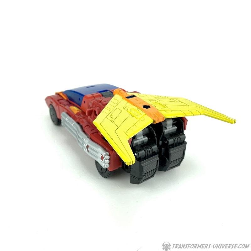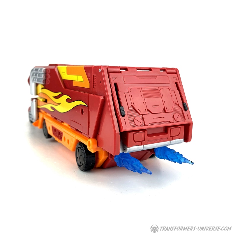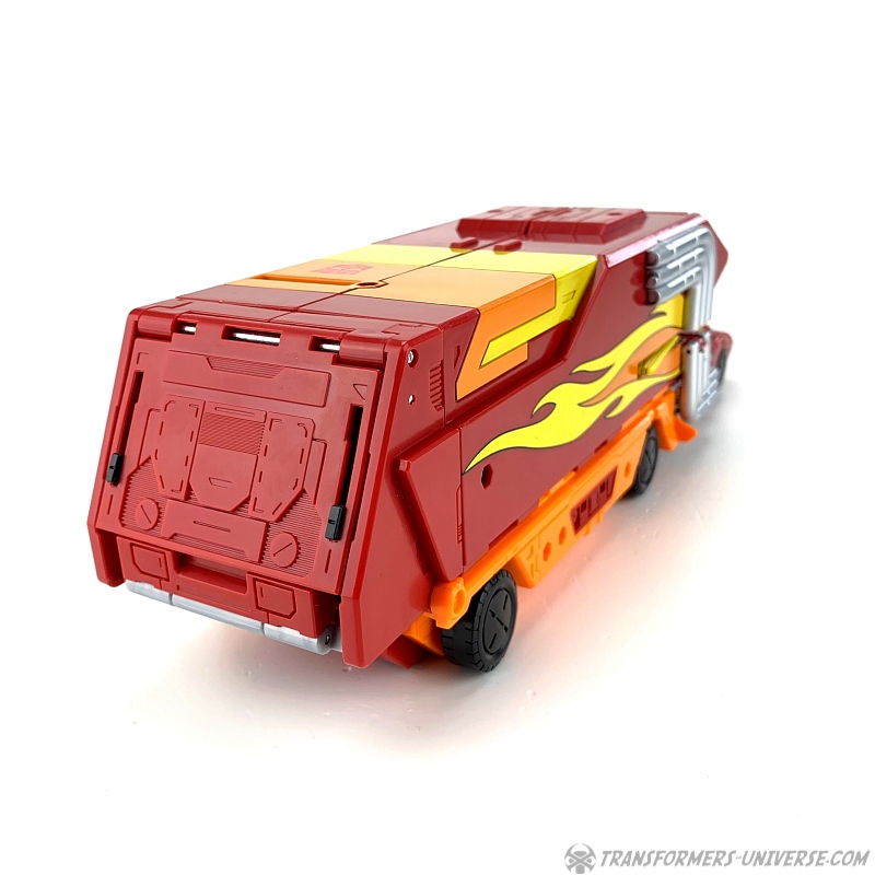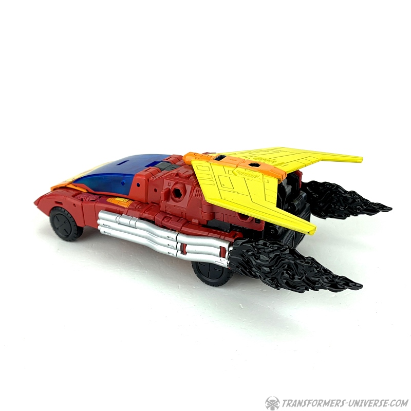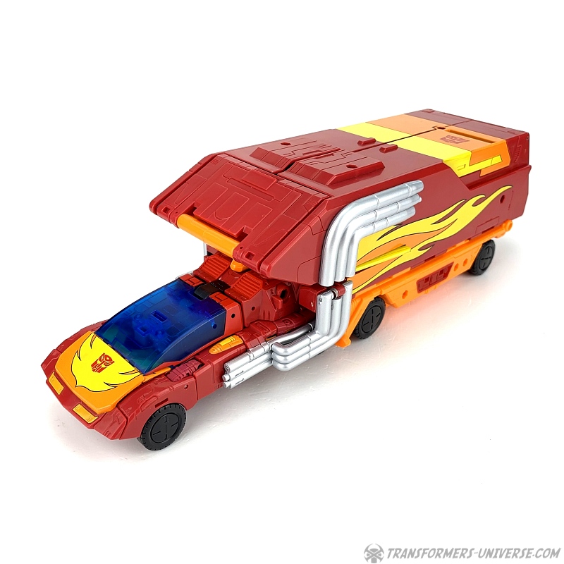 Alternativmodus: Rodimus Primes klassischer Fahrzeugmodus ist der sogenannte Space Winnebago, eine Art futuristischer Wohnwagen. Als ich die ersten Bilder dieses Modus sah, da war ich überzeugt, dass es jemand falsch transformiert hatte. Leider lag ich da falsch und ich laste das Ganze einfach mal Hasbro an, die sich auch hier nicht ganz verkneifen konnten, ein wenig Hot Rod mit in diese Figur einzubauen. Denn der Rodimus Roboter verwandelt sich nicht einfach in die Front des Winnebago, sondern eigentlich in den klassischen Hot Rod Sportwagen.