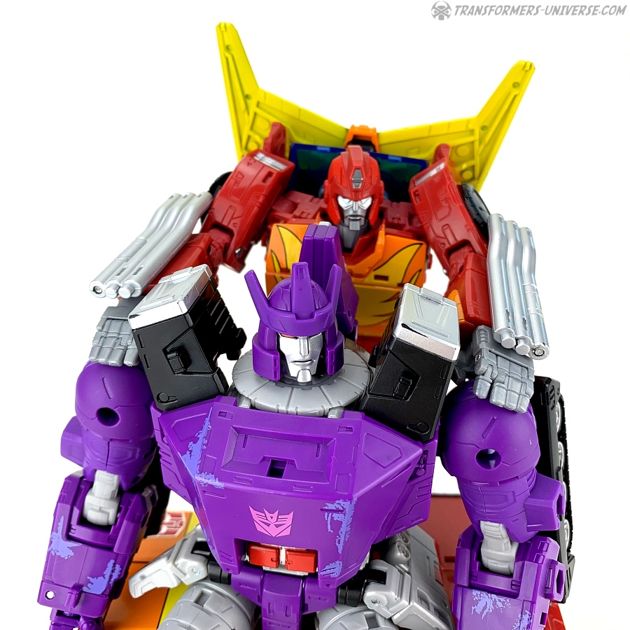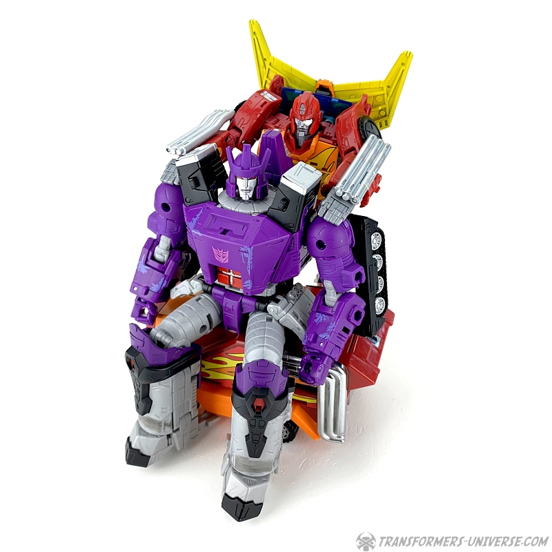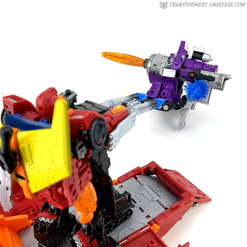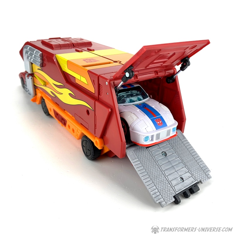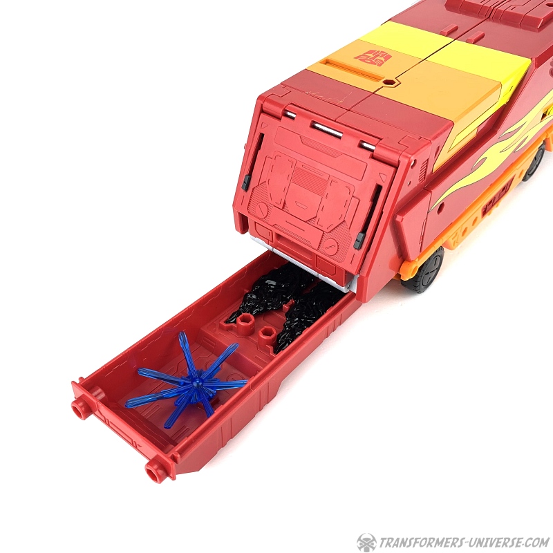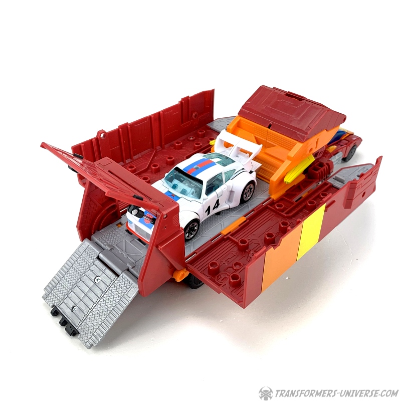 Außerdem gibt es da noch ein recht verbreitetes Problem, dass der Anhänger nicht richtig schließt. Liegt wohl daran, wie er in der Verpackung befestigt war, hat das Plastik leicht verzogen. Es gibt Tutorials auf Youtube, wie man das beheben kann, aber da es bei meinem nicht wirklich schlimm ist, hab‘ ich’s sein lassen. Der Space Winnebago kann hinten die Rampe öffnen und, so das Geschütz nicht drin ist, bietet Platz für einen durchschnittlich großen Auto-Transformer. Das Geschütz kann oben auf dem Anhänger montiert werden und bietet Feuerkraft für Rodimus‘ Fahrzeugmodus.