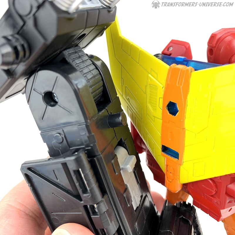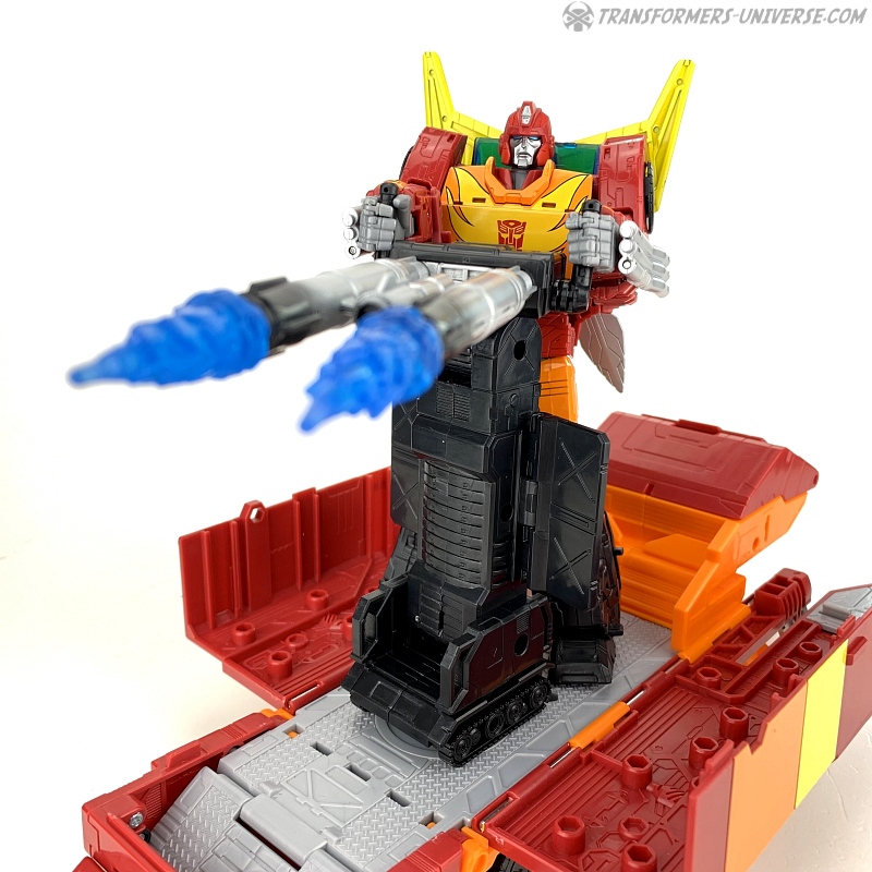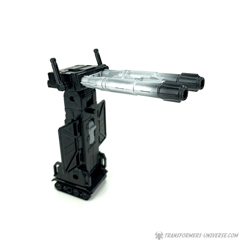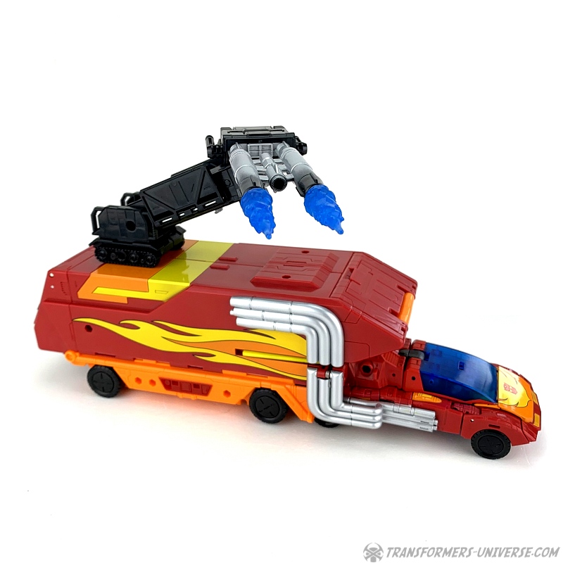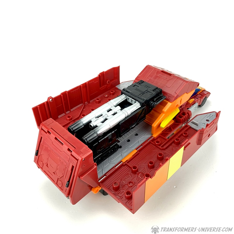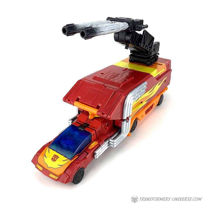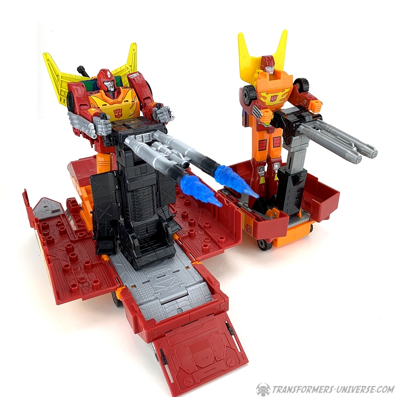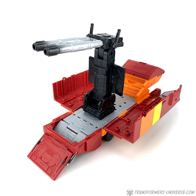Zubehör: Neben den oben schon erwähnten Waffen und der Matrix ist Rodimus‘ wichtigstes Zubehörteil natürlich sein Anhänger. Wie schon beim Anhänger von G1 Rodimus Prime kann man diesen aufklappen und bringt ein großes Geschütz zum Vorschein, welches von Rodimus bemannt werden kann. Anders als bei der G1 Version kann dieses aber auch aus dem Anhänger entfernt werden und entweder für sich alleine stehen oder auf Rodimus‘ Rücken befestigt werden. Letzteres wird in der Anleitung nicht erwähnt, ist aber klar so designt, denn die zwei Zapfen am Geschütz passen perfekt in den Rücken des Roboters.