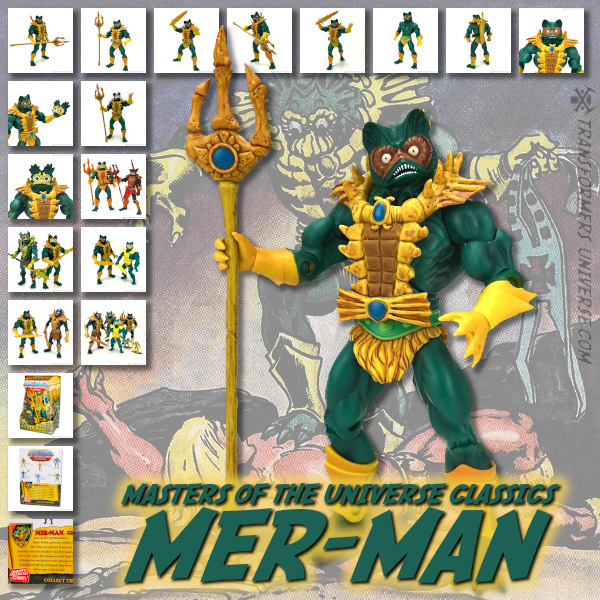 The Classics figure of Mer-Man is mostly based on the vintage figure, but comes with a separate head resembling 200X Mer-Man. Unlike the vintage figure, he carries a trident in addition to his classic sword to further underscore his aquatic image. His chest harness is, of course, removable.