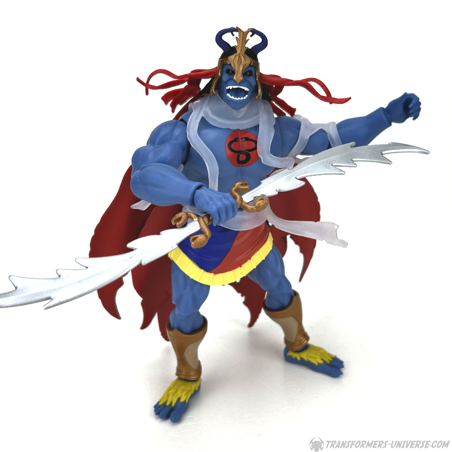 Skell-Ra: Now Skell-Ra is more or less two figures in one, really. Straight out of the packaging he is Skell-Ra, who is basically Skeletor with some Mumm-Ra bling attached and extra horns on his hood. He’s got Mumm-Ra’s twin-snake symbol on his chest, Mumm-Ra’s yellow fur gaiters on his legs, and carries Mumm-Ra’s double sword, the Sword of Plun-Darr, the evil counterpart to the Sword of Omens. Apart from that, though, he is all Skeletor, really.
