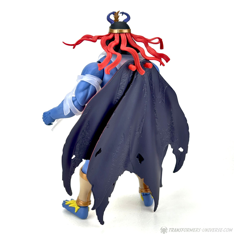 Articulation is standard for a Masterverse figure, meaning pretty good, and Skell-Ra’s cape can swivel outwards, becoming almost wing-like. It’s purple from the front, but red when looked at from the back, which is due to this being two figures in one, as I mentioned above. Skell-Ra can also remove his hood, revealing a naked skull. While Skell-Ra can turn his head, the hood remains static, so it looks a bit weird when he’s looking to the side.