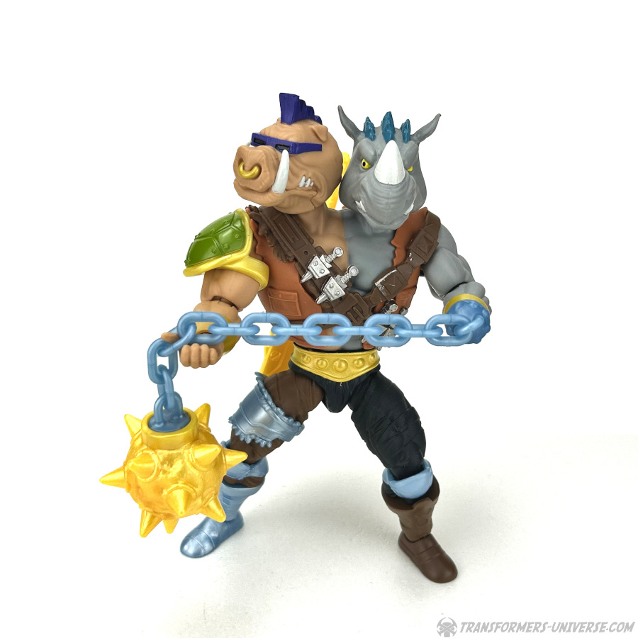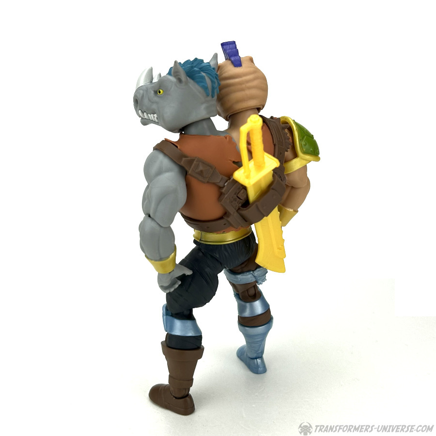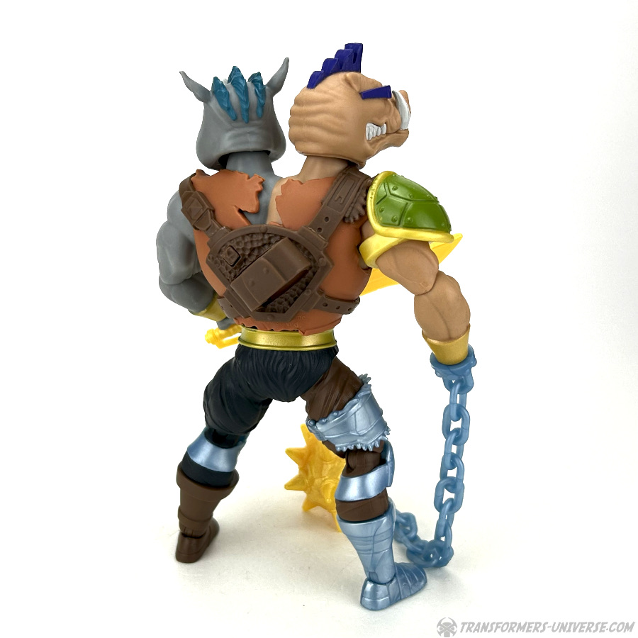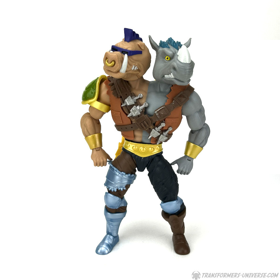 Apart from being fused into one, Bebop and Rocksteady are pretty much spitting images of their 1980s cartoon incarnations, which I love and adore. If you remove the figure’s vest (which is possible, but you need to unplug both arms and the lower body to do it), you see that the chest is split right down the middle, grey on the left side and beige on the right.