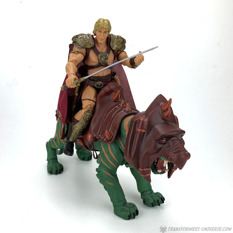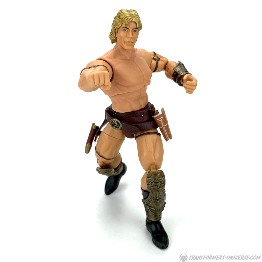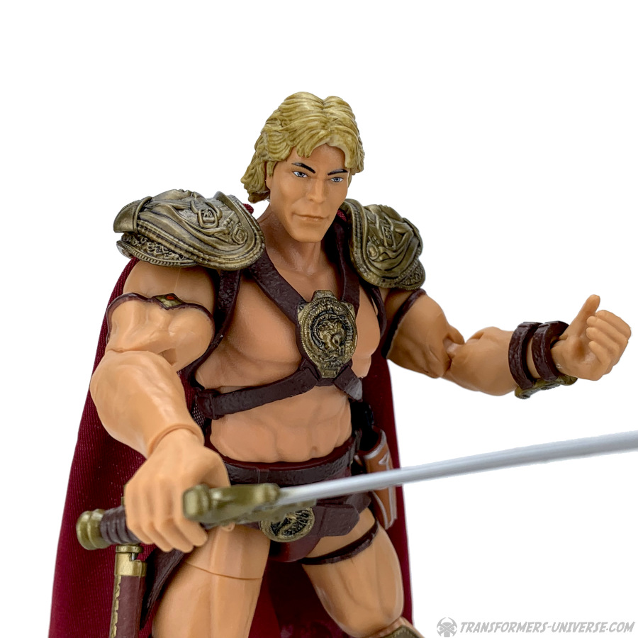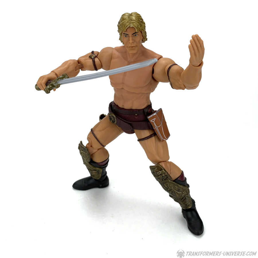 Articulation is pretty great, as you’d except from a Masterverse figure, and He-Man comes with two pairs of hands. We have a standard weapon-holding pair, as well as a closed left fist and an open right hand. Finally, apart from the very Lundgren-looking head the figure comes with out of the package, there is a secondary head that resembles He-Man’s familiar cartoon noggin. That secondary head looks really, really creepy on this body, though. Not sure why. Also, it doesn’t quite match the body’s skin tone.