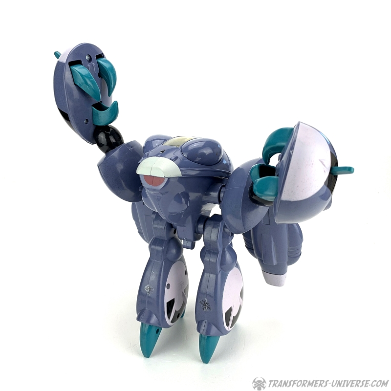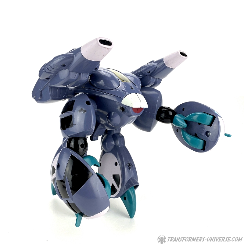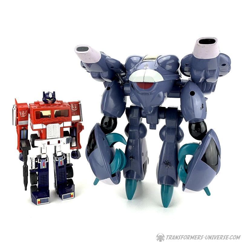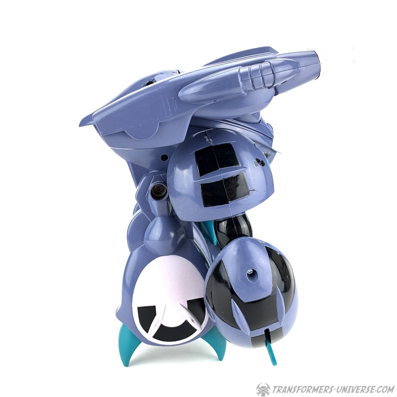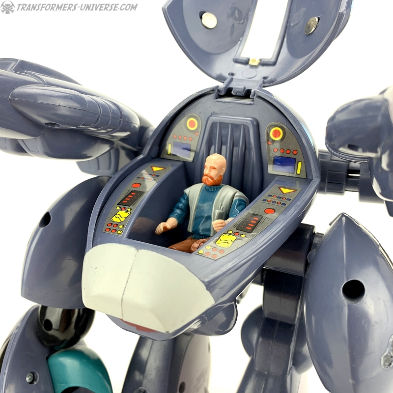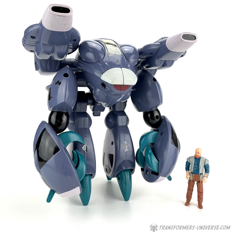 The Invid Shock Trooper is relatively simple in a design, a crab-like non-transforming robot with pincers and two big guns on its shoulders. The Shock Troopers were basically the tanks of the Invid, appearing in endless numbers to crush any resistance. Its cockpit opens up to show a pilot seat, which can seat an ExoSquad figure (which were slightly smaller than GI Joe figures), but they also (somewhat) fit M.A.S.K. figures such as Alex Sector (seen in the pictures because I don't own a single ExoSquad figure).