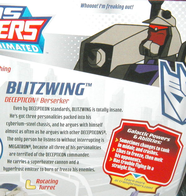 Remarks: Possibly the most memoriable character to emerge from the Animated cartoon is Blitzwing, the first and so far only Triple-Changer in the Animated Universe. Not only does he have three different forms, he also has three different personalities to go with them. Number one, the one with the blue face, looks and sounds like a stereotypical Nazi villain from a cheap Hollywood adventure movie, German accent and all. The second one, the one with the red face, gives a remarkable impression of Arnold Schwarzenegger and loves to pound Autobots into scrap. And number three, the black-faced one, is completely crazy, likes to express his feelings in song, and loves to paint mustaches on the faceplates of Autobots, because mustaches are funnny.