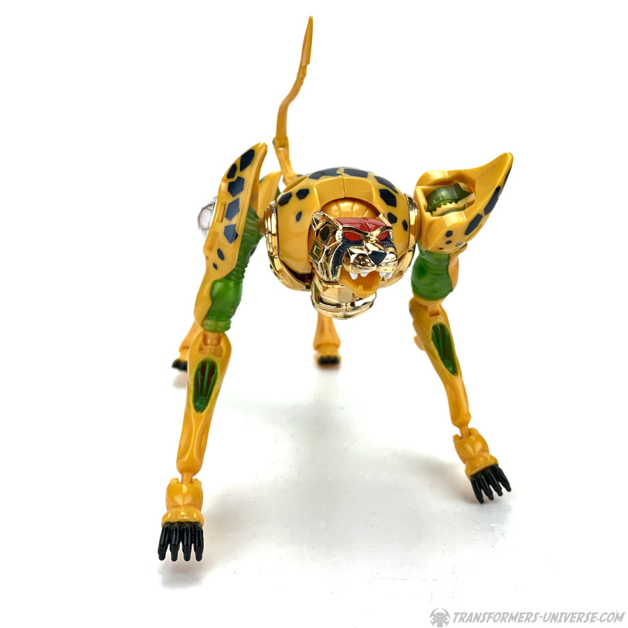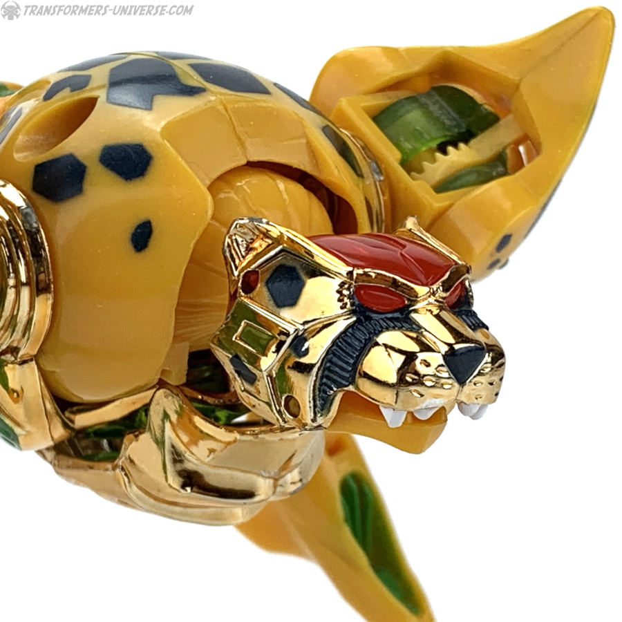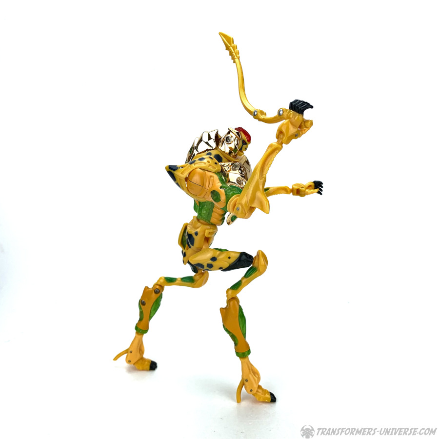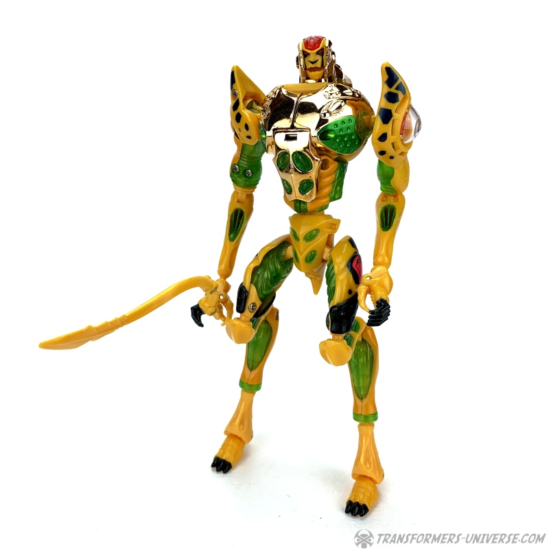 Formerly hot-headed and inexperienced, Cheetor is growing up fast on Cybertron; still remains Optimus Primal's strongest supporter in the Techno-Organic war against Megatron and his Vehicons. His beast mode offers cheetah-like speed, agility, and endurance. Sharp, powerful claws and jaws. Robot mode has enhanced, frictionless body surface that causes energy pulses to glide right off. Cheetor can accelerate particles around aerodynamic form to create a vacuum useful in knocking down opponents.