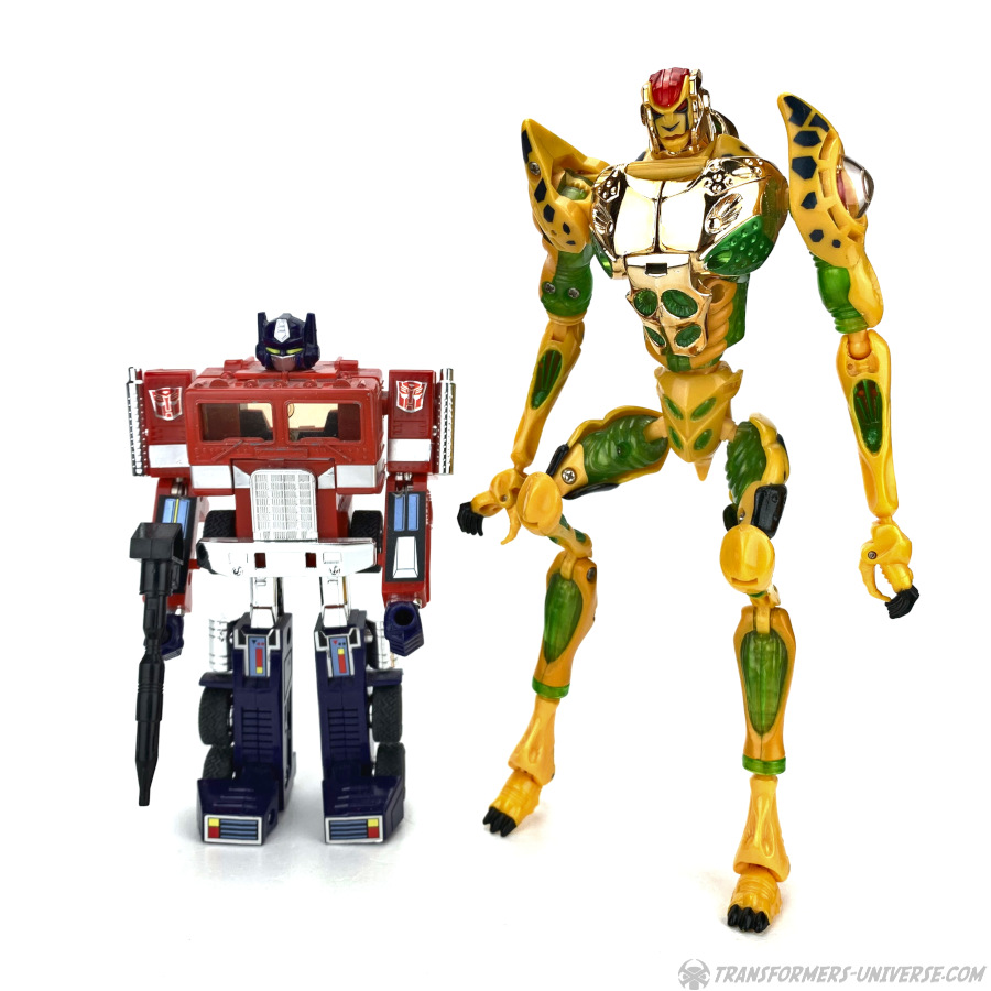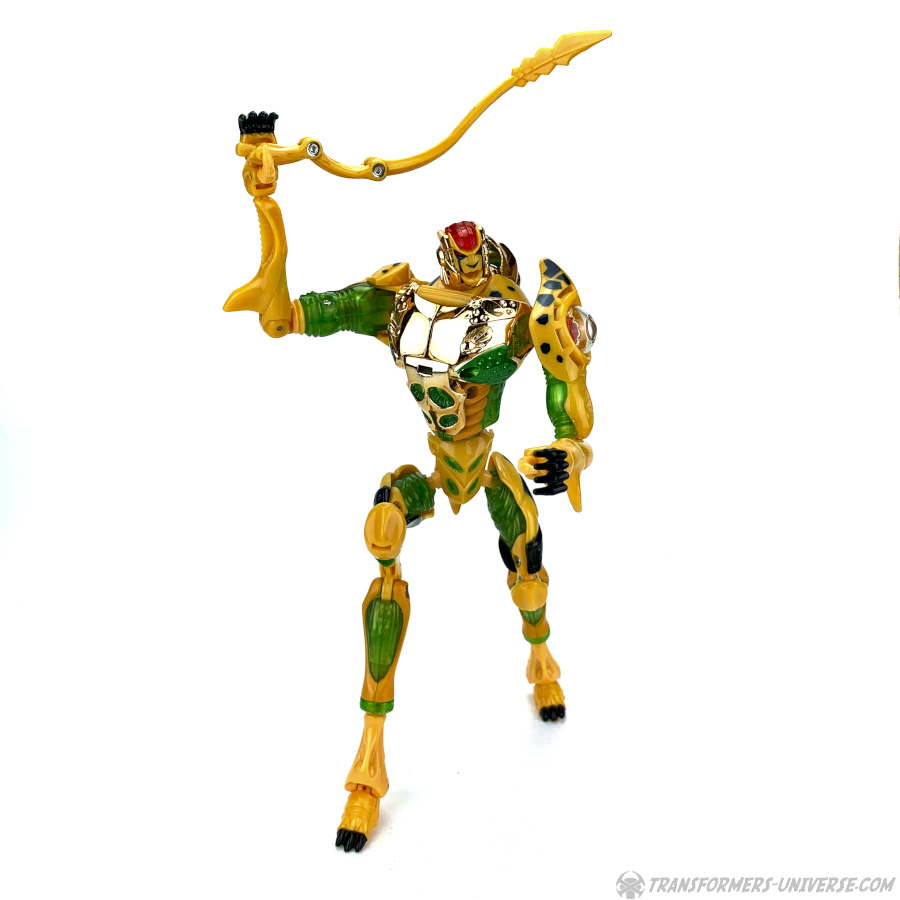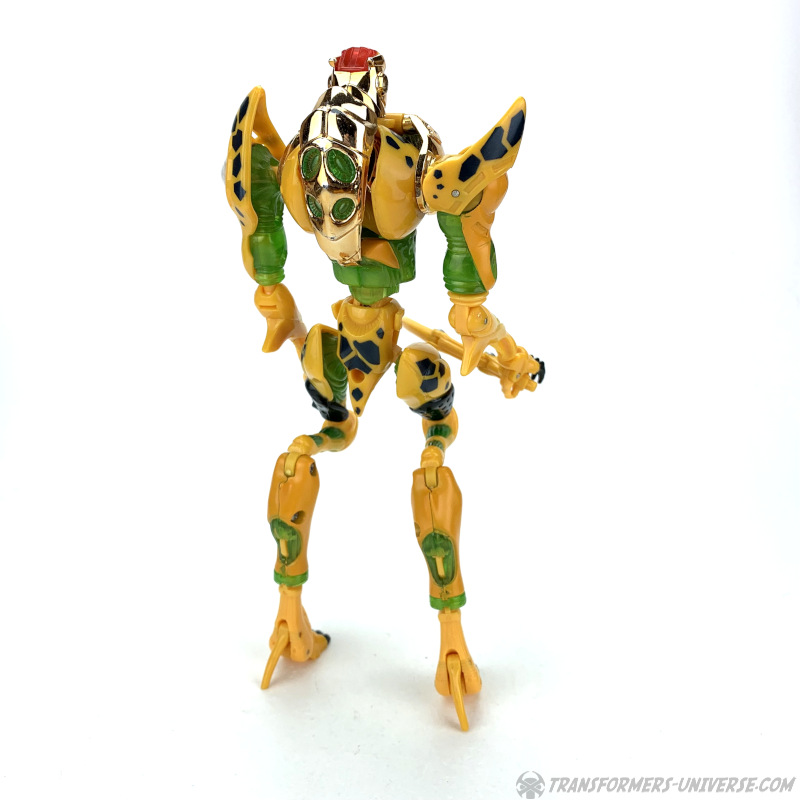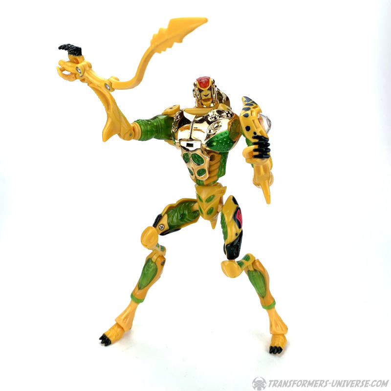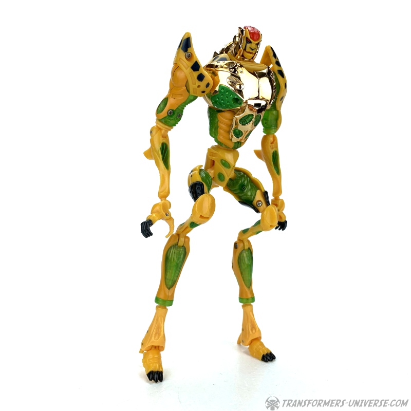 Formerly hot-headed and inexperienced, Cheetor is growing up fast on Cybertron; still remains Optimus Primal's strongest supporter in the Techno-Organic war against Megatron and his Vehicons. His beast mode offers cheetah-like speed, agility, and endurance. Sharp, powerful claws and jaws. Robot mode has enhanced, frictionless body surface that causes energy pulses to glide right off. Cheetor can accelerate particles around aerodynamic form to create a vacuum useful in knocking down opponents.