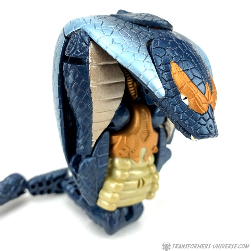 Alternate Mode: Whereas Cohrada's robot mode is okay, but nothing special, his beast mode is really spectacular. He transforms into a cobra and does so very well. Okay, one might argue that the head and hood are a bit out of proportion compared to the rest of the body, but that is pretty much this mode's only flaw. The cobra is really nicely done. Scales cover its body, its tail is very posable, the drawings on the back of the hood look pretty cool and it even comes with an attack mode of sorts, seeing as Cohrada's squirt gun can peek out between the cobra's jaws. The beast mode is somewhat limited in posability, though. You can stand it up just fine, but that's the only pose where it's stable. The cobra can't slither along the floor either, as the head can't turn upward from the hood. Still, as beast modes go, this is one is pretty damn good.