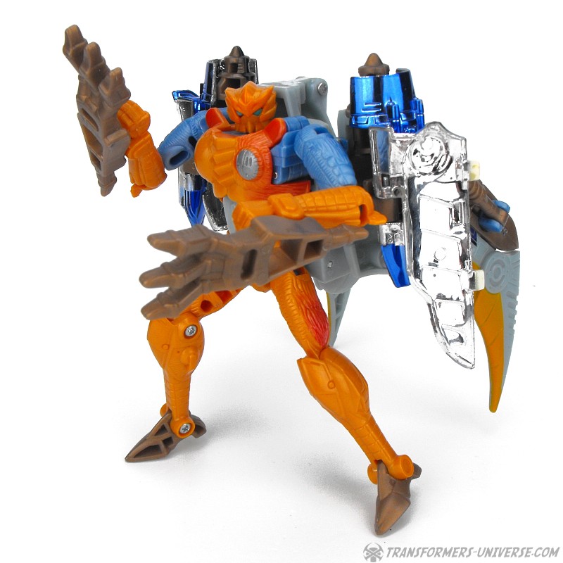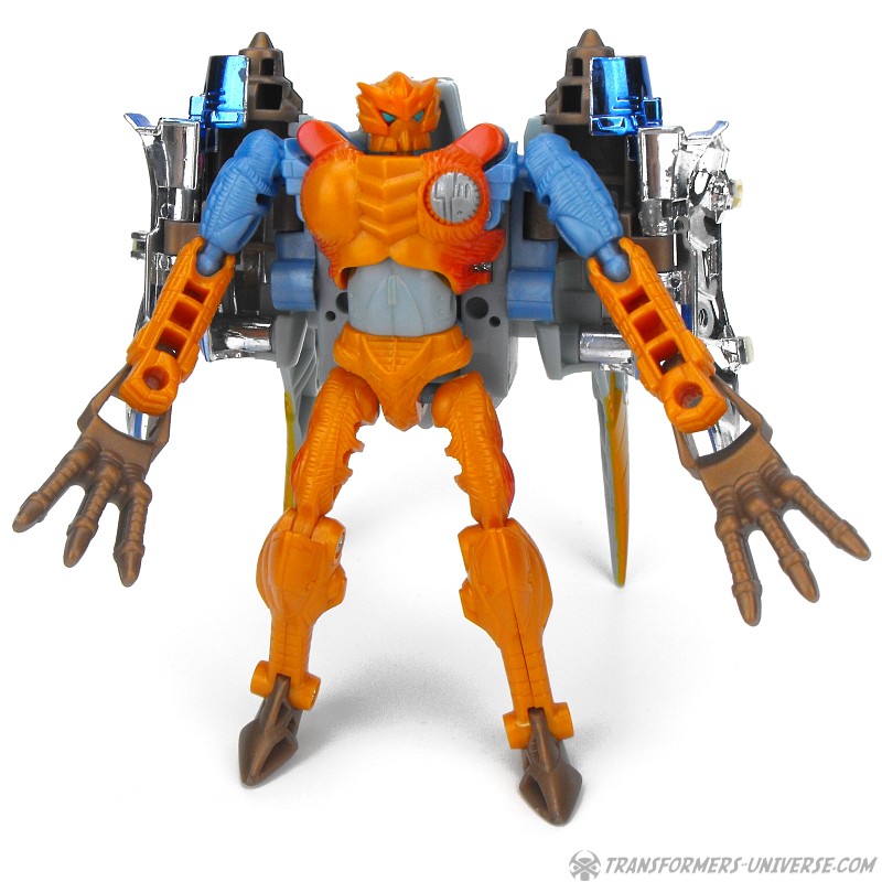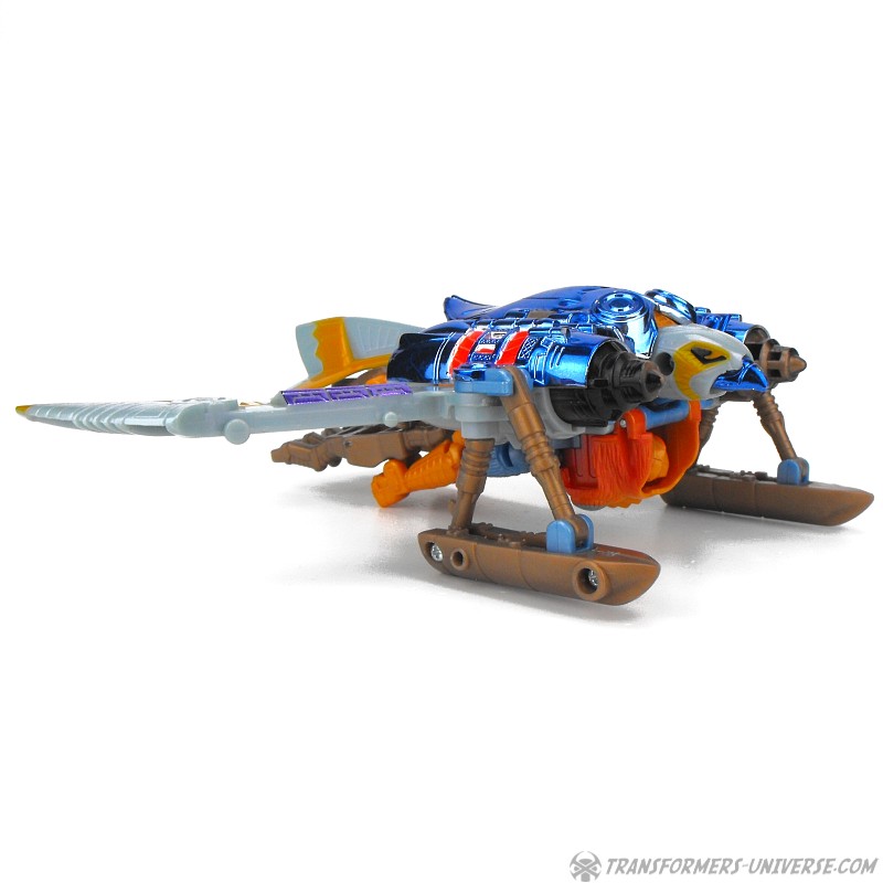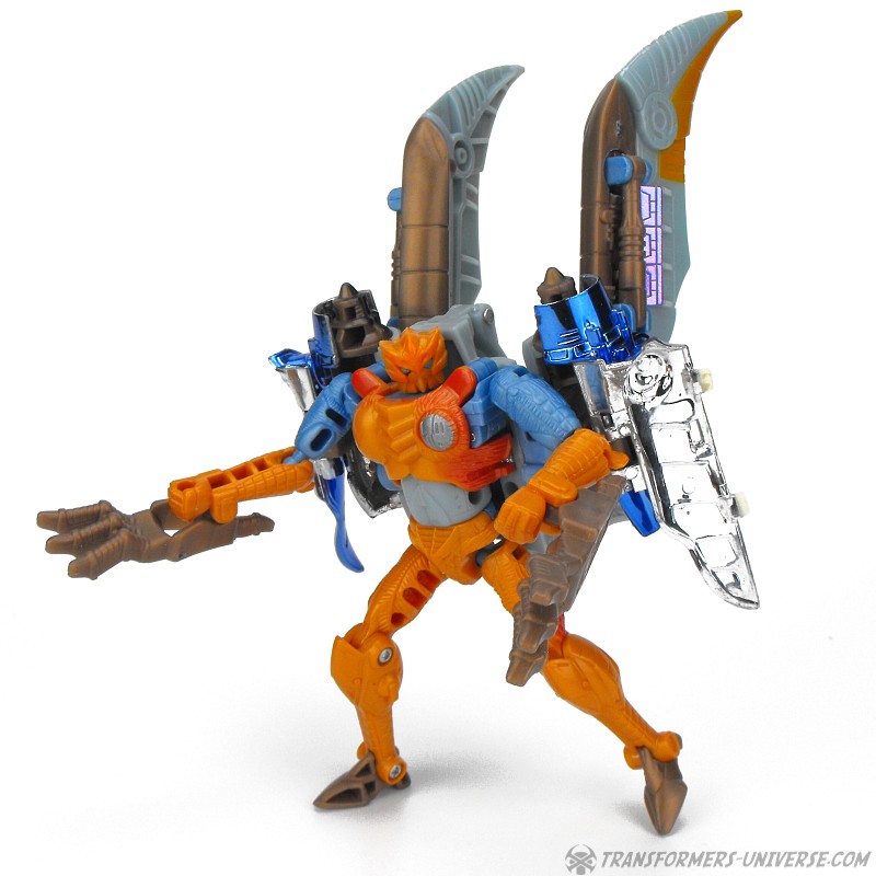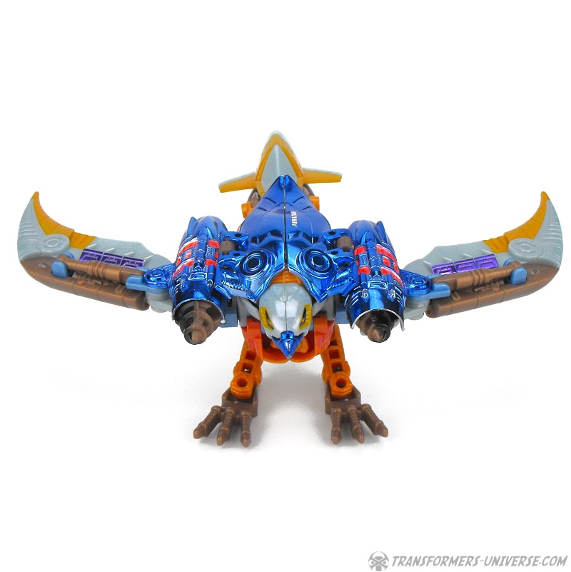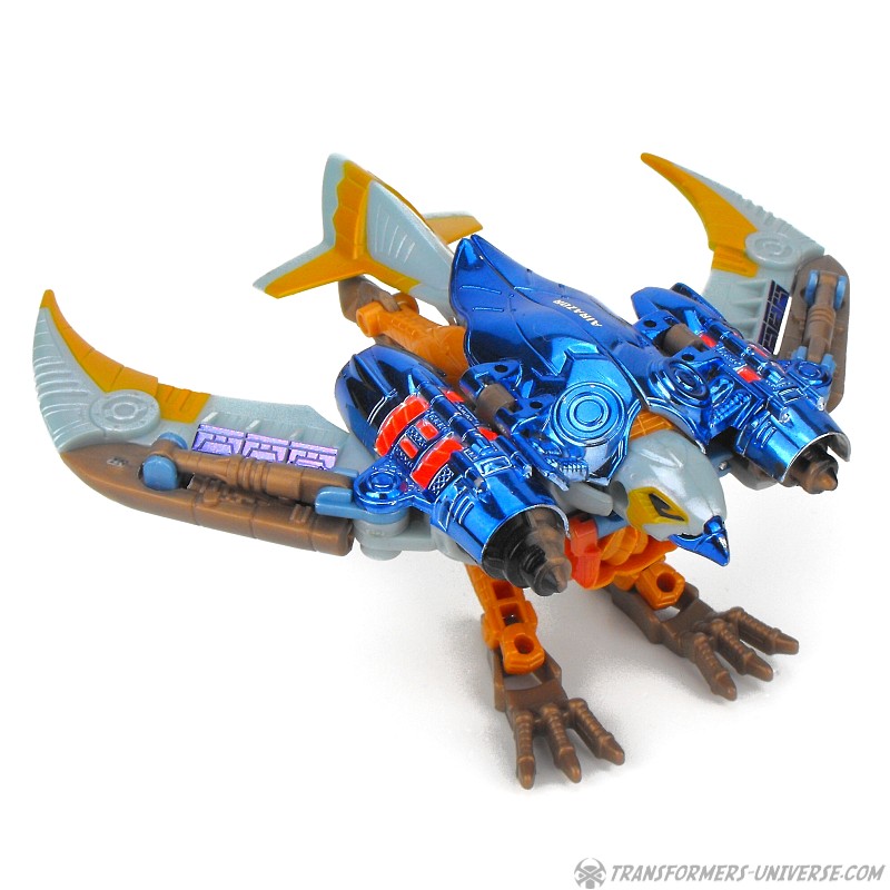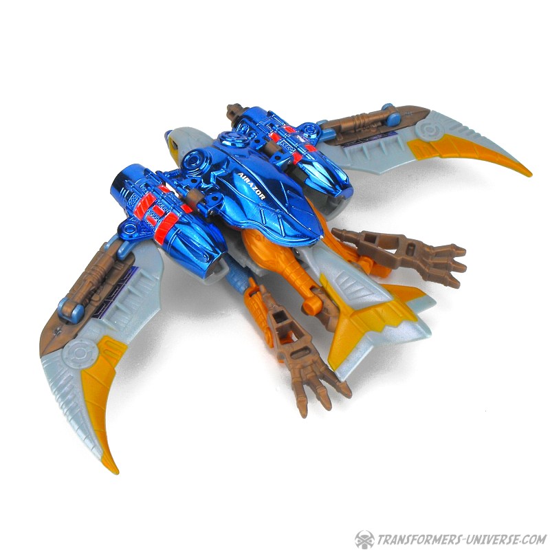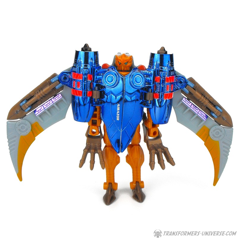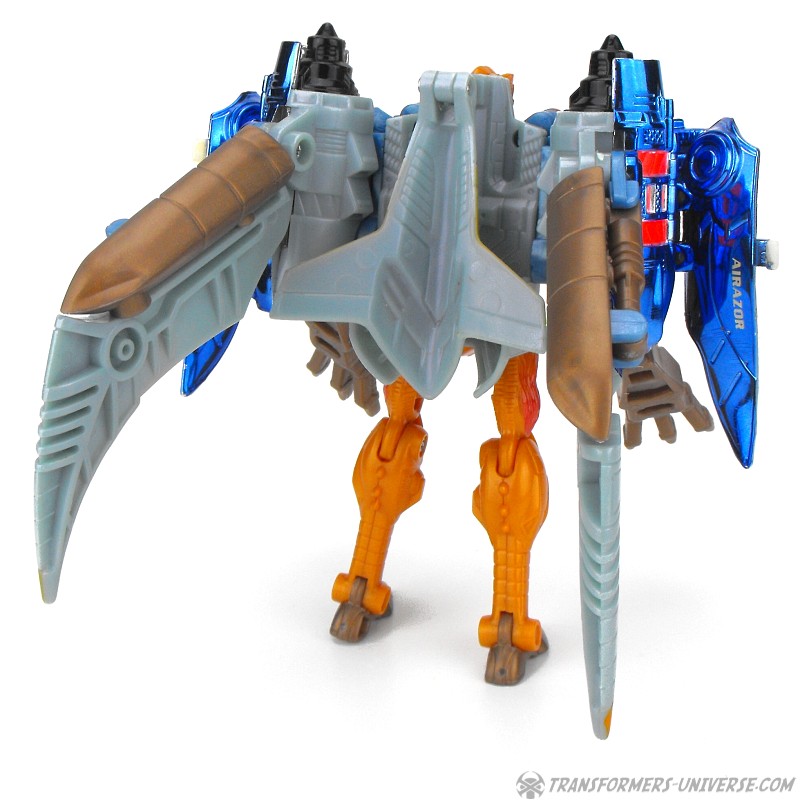 Alternativmodus: Airazor verwandelt sich in einen techno-organischen Adler mit großen Jet-Triebwerken auf dem Rücken. Der Farbtausch ist der gleiche wie im Robotermodus, zusätzlich sind hier noch die roten Farbakzente von TM Airazor gegen goldene ausgetauscht worden. Insgesamt sieht der Adler ziemlich gut aus und hat voll bewegliche Beine (die Arme des Robotermodus), ebenso können die Flügel gespreizt werden.
