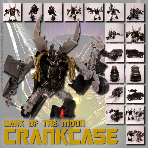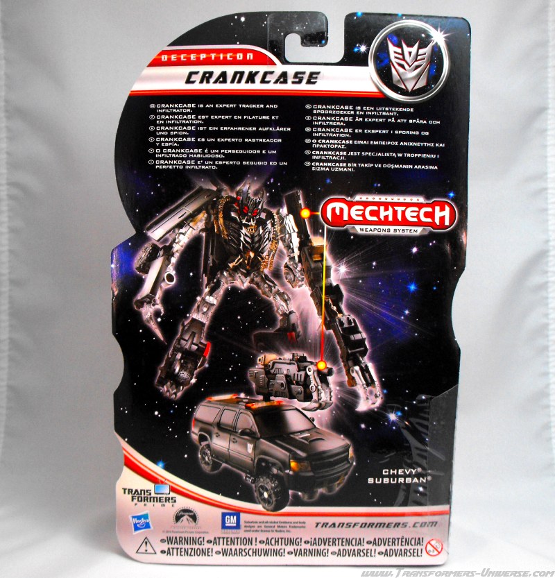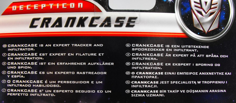 As an expert tracker and infiltrator, Crankcase serves Megatron from the shadows. Unseen and never recognized, he watches the Autobots and reports their movements back to his master. He rarely engages in combat, but when he does, it is swift, terrible, and final.
