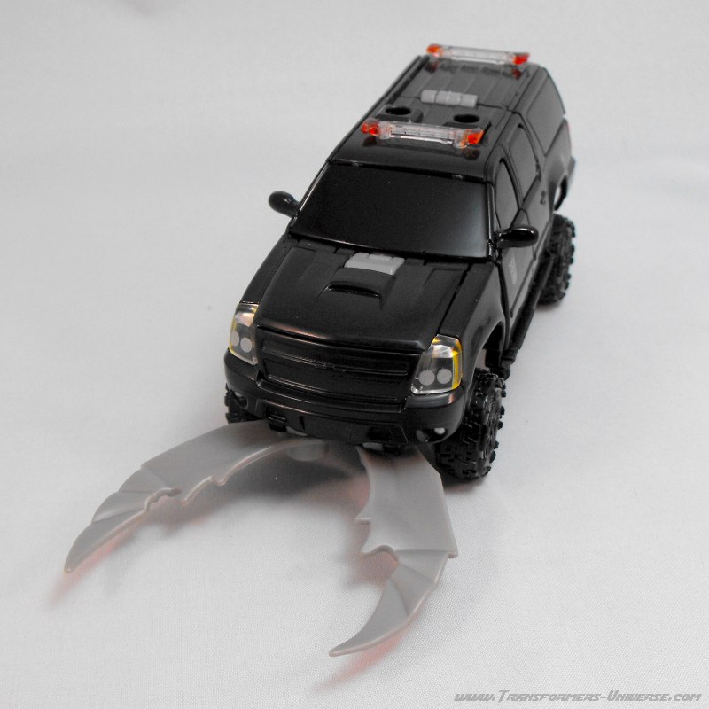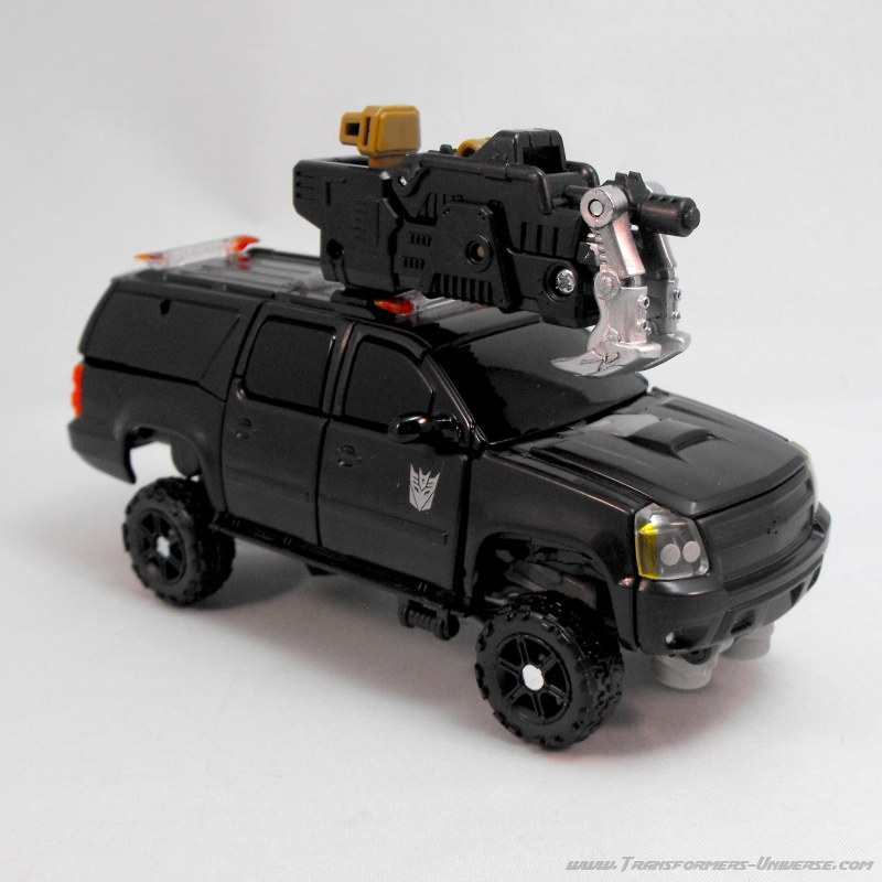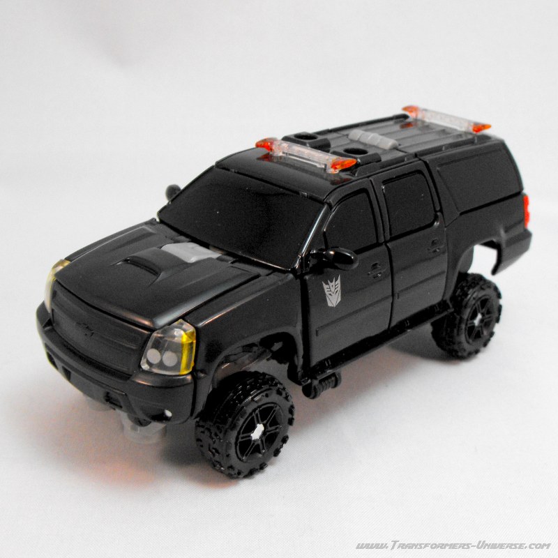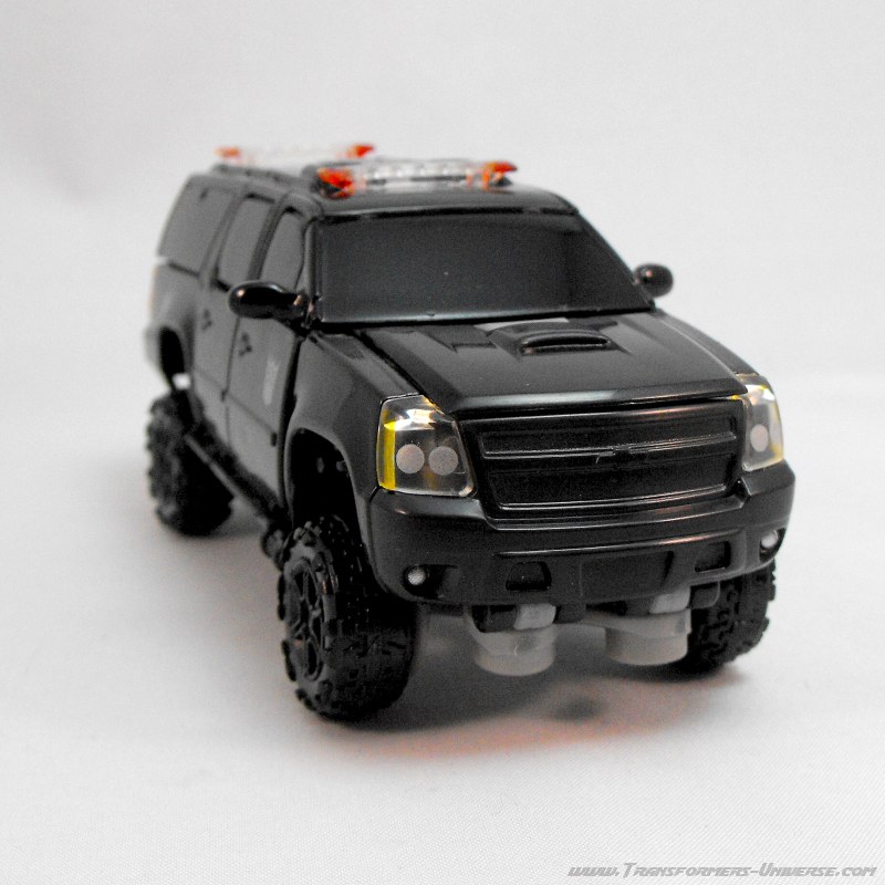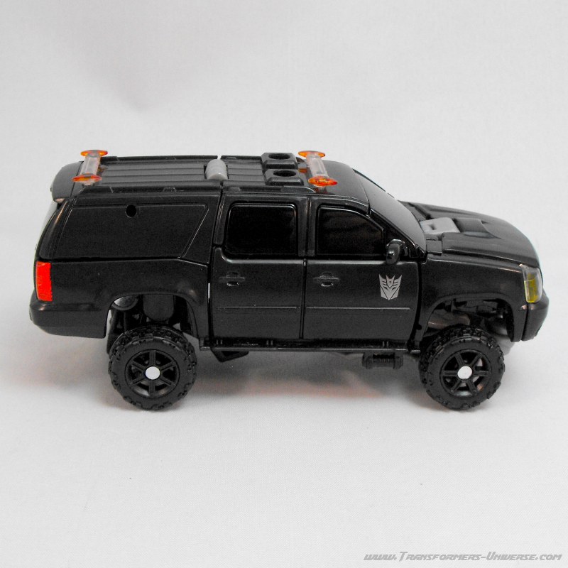 Alternate Mode: Crankcase, the probable name of this figure, does a fair job of imitating a Chevrolet Suburban. Previously many people regarded this as a possible Earth Mode for Soundwave. The detailing on cars of this type is rather sparse and what little there is gets swallowed up by the all-black paintjob. It appears to be a government-type vehicle of some sort, evident by the light bar on top of it.