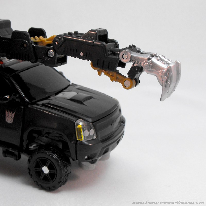 I look at the weapon connectors as the second gimmick, seeing as it allows inter-toyline weapon exchange. Very nicely done, Hasbro. The third gimmick is, to me, the least necessary one: the scissor-claws in robot and alternate mode. Their lack of detailing negates their coolness and they serve almost no purpose, except to hinder the transformation. The fourth gimmick isn’t one, not really, but does give us a hint of the gutter-level humor we can except from Michael Bay in the third movie: Crankcase’s hands. Some may think, what? His hands? Yes, his hands.