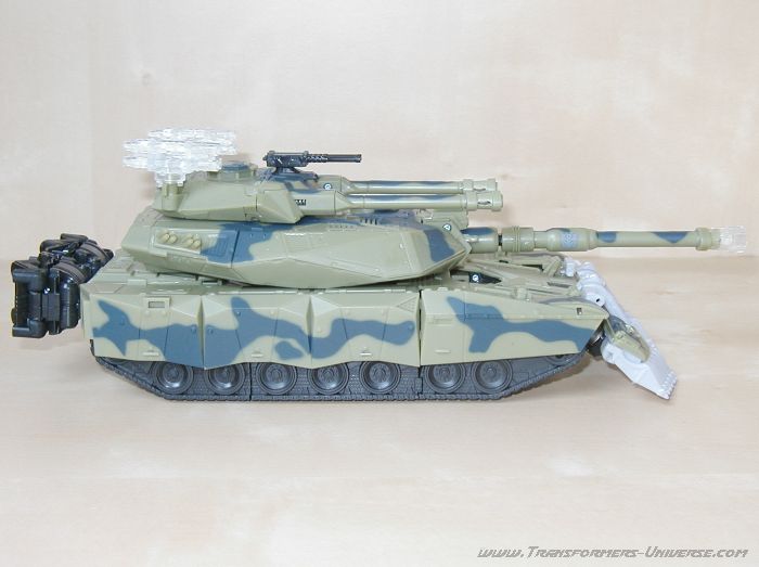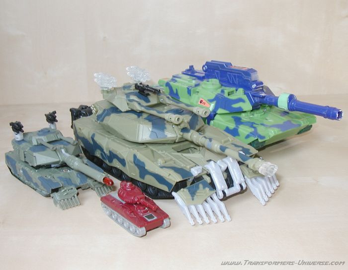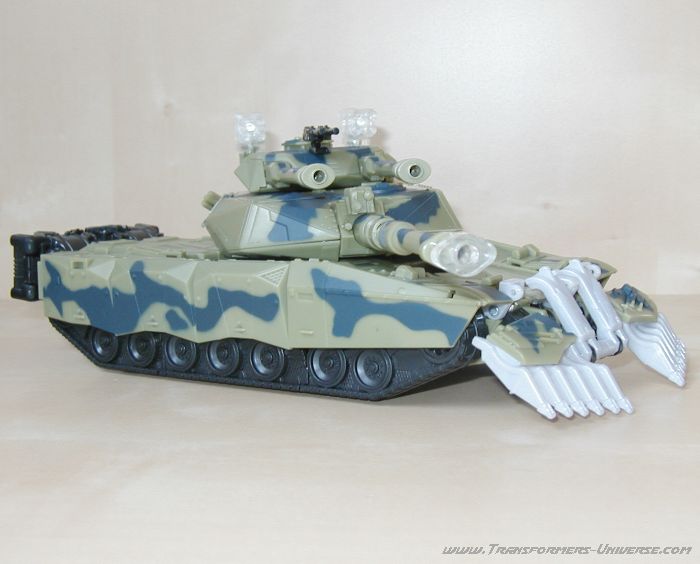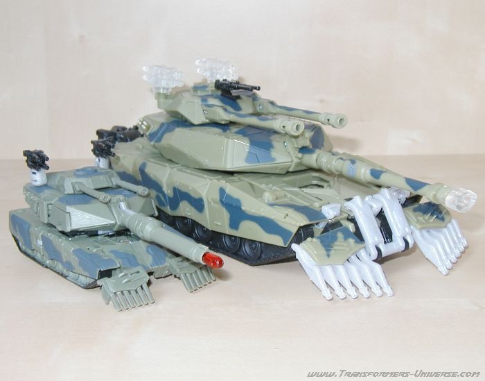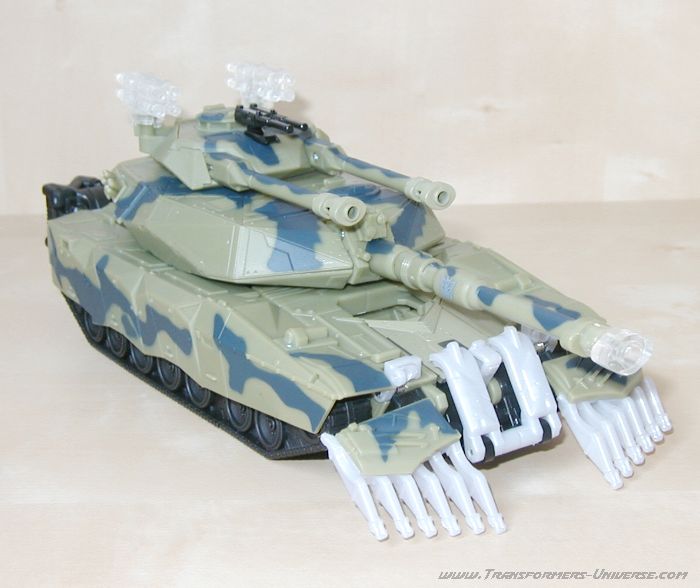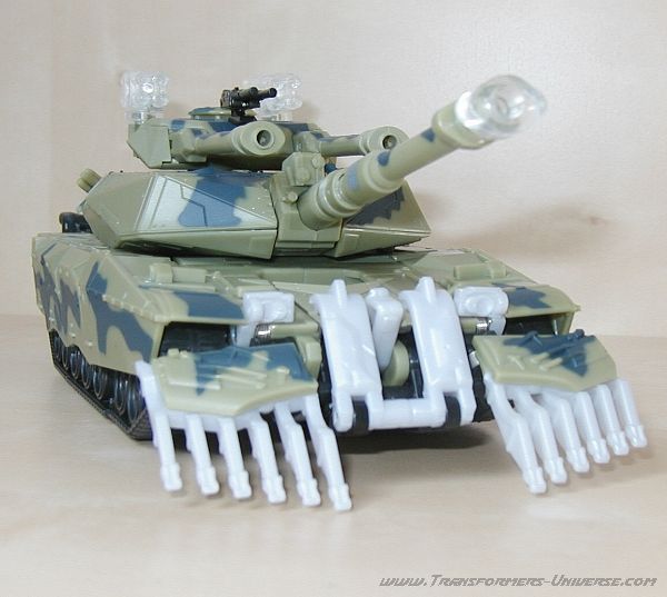 Alternate Mode: Brawl's alternate mode is a modified M1A2 Abrahms tank, equipped with a second turret that sports a twin cannon, two 4-shot missile launchers, and a double-barreled 15mm rapid fire cannon. Brawl is also equipped with two mine-sweeping combs up front, as well as antipersonal and anti-mine equipment. The tank is done with lots of detailing and a nice colour scheme. The only thing that bugs me is that you can see Brawl's robot mode head in this tank mode.