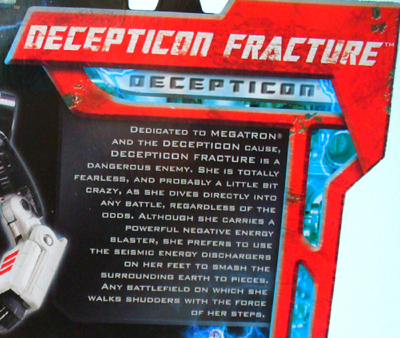 Remarks: Fracture is a repaint of Classics Mirage and is, of course, a homage to the GoBots character Crasher. Not sure why they didn't use the actual name of the character, probably some copyright issue. Anyway, Fracture is the same excellent figure Mirage was and was available exclusively at Walmart. Her Decepticon insignia is the original one, not the more streamlined one used by the Movie Decepticons, as the figure was originally intended to be released in the Classics line.