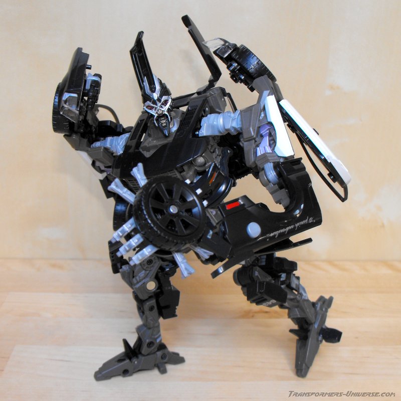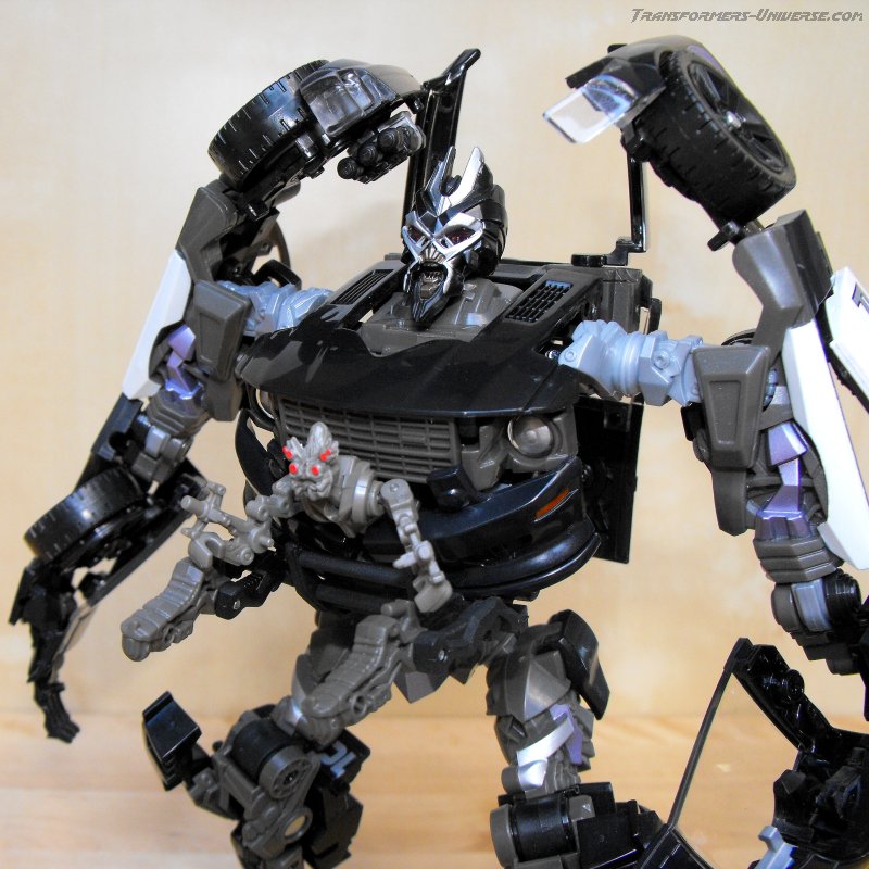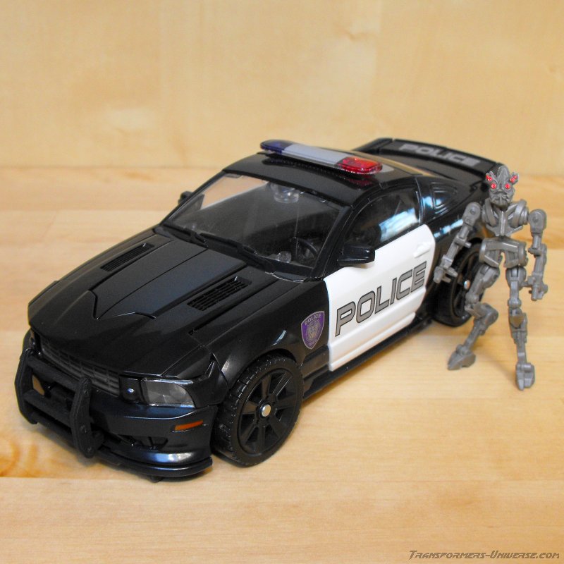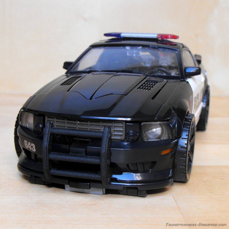 Robot Mode: Barricade's basic design in robot mode hasn't changed all that much from his original Deluxe incarnation, though he is now at a Voyager / Alternator scale. He still has the standard hood-as-chest design, the sides of the car form his arms and the rear forms the legs. The increase in size has given him better detailing, though, as well as improved posability and a somewhat more movie-accurate look.