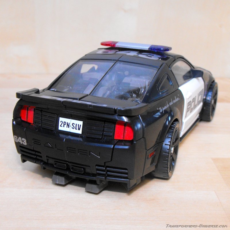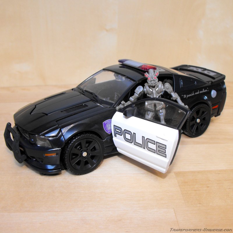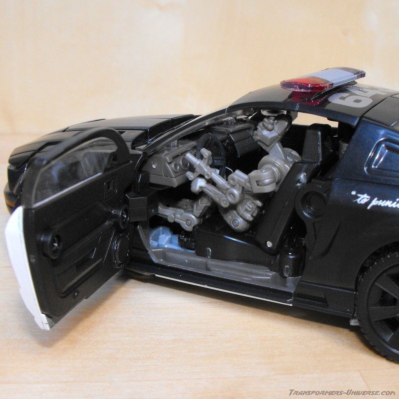 Vehicle Mode: Barricade still transforms into a black police car, of course, and except for the increase in size and some minor details it's pretty much identical to the vehicle mode of his Deluxe incarnation. From the outside, at least. What Human Alliance Barricade has, of course, is an actual interior. Open the car doors and you find two actual seats, where the Frenzy figure can sit (see below). There is a steering wheel and a dashboard as well. No rear seats, but that would probably have been impossible. The robot legs have to go somewhere, after all. So all in all a very, very nice vehicle mode. No complaints at all.