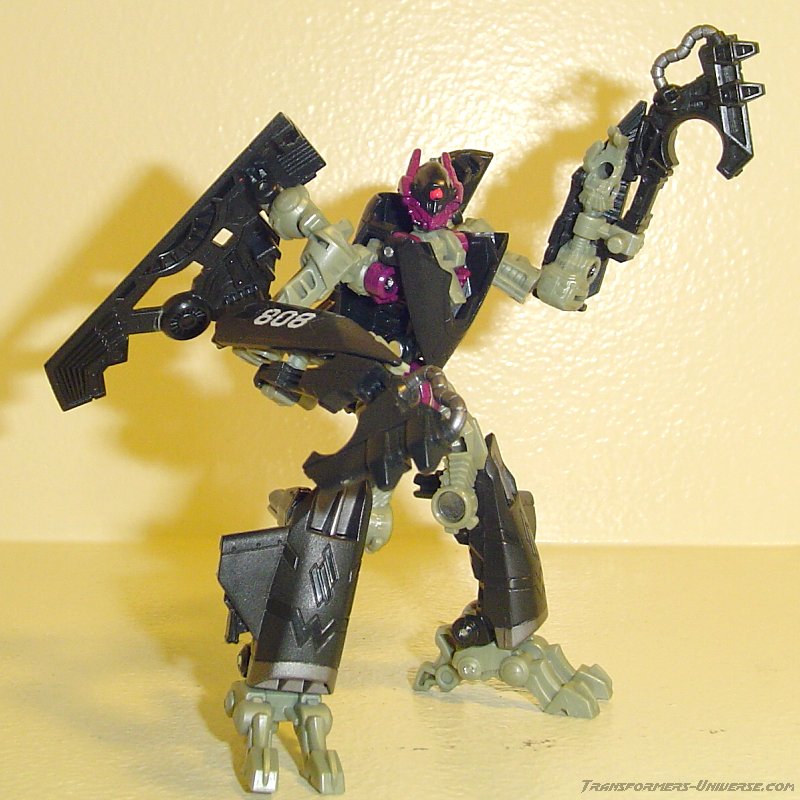 He wields a pair of axes or hammers as weapons, but in my opinion he should have had something like a rifle. The axes could also have been daggers (instead of Mindwipe), but more on that later. His knee joint is funny looking at first, but is very effective. A side note is that his axes have a clip and can be attached to his forearm instead of his hand. They more resemble flamethrowers with a double barrel when positioned like this. All in all, a very detailed and clean robot mode.